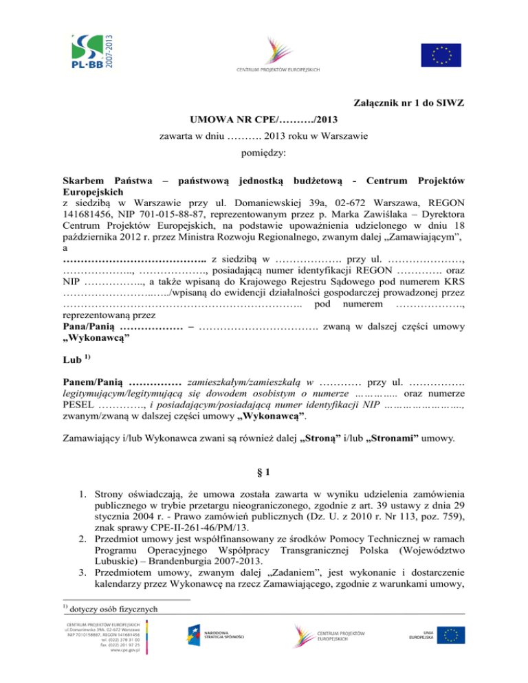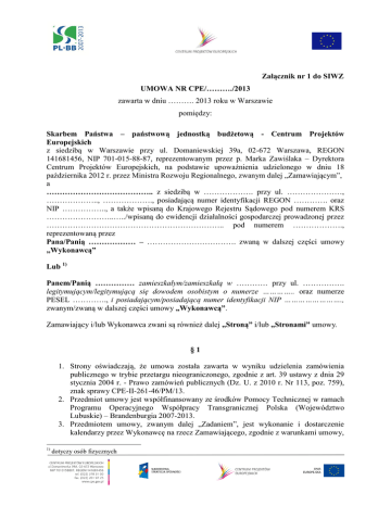 Załącznik nr 1 do SIWZ UMOWA NR CPE/………./2013 zawarta w dniu ………. 2013 roku w Warszawie pomiędzy: Skarbem Państwa – państwową jednostką budżetową - Centrum Projektów Europejskich z siedzibą w Warszawie przy ul. Domaniewskiej 39a, 02-672 Warszawa, REGON 141681456, NIP 701-015-88-87, reprezentowanym przez p. Marka Zawiślaka – Dyrektora Centrum Projektów Europejskich, na podstawie upoważnienia udzielonego w dniu 18 października 2012 r. przez Ministra Rozwoju Regionalnego, zwanym dalej „Zamawiającym”, a ………………………………….. z siedzibą w ………………. przy ul. …………………, ……………….., ………………., posiadającą numer identyfikacji REGON …………. oraz NIP …………….., a także wpisaną do Krajowego Rejestru Sądowego pod numerem KRS ……………………..…../wpisaną do ewidencji działalności gospodarczej prowadzonej przez ………………………………………………………….. pod numerem ………………., reprezentowaną przez Pana/Panią ……………… – ……………………………. zwaną w dalszej części umowy „Wykonawcą” Lub 1) Panem/Panią …………… zamieszkałym/zamieszkałą w ………… przy ul. ……………. legitymującym/legitymującą się dowodem osobistym o numerze ………….. oraz numerze PESEL …………., i posiadającym/posiadającą numer identyfikacji NIP ……………………., zwanym/zwaną w dalszej części umowy „Wykonawcą”. Zamawiający i/lub Wykonawca zwani są również dalej „Stroną” i/lub „Stronami” umowy. §1 1. Strony oświadczają, że umowa została zawarta w wyniku udzielenia zamówienia publicznego w trybie przetargu nieograniczonego, zgodnie z art. 39 ustawy z dnia 29 stycznia 2004 r. - Prawo zamówień publicznych (Dz. U. z 2010 r. Nr 113, poz. 759), znak sprawy CPE-II-261-46/PM/13. 2. Przedmiot umowy jest współfinansowany ze środków Pomocy Technicznej w ramach Programu Operacyjnego Współpracy Transgranicznej Polska (Województwo Lubuskie) – Brandenburgia 2007-2013. 3. Przedmiotem umowy, zwanym dalej „Zadaniem”, jest wykonanie i dostarczenie kalendarzy przez Wykonawcę na rzecz Zamawiającego, zgodnie z warunkami umowy, 1) dotyczy osób fizycznych ofertą i szczegółowym opisem przedmiotu zamówienia stanowiącym załącznik nr 3 do umowy. 4. Wykonawca zobowiązuje się do przygotowania przedmiotu umowy, zgodnie z zasadami wizualizacji określonymi w Systemie identyfikacji wizualnej dla Programu Operacyjnego Współpracy Transgranicznej Polska (Województwo Lubuskie) – Brandenburgia 2007-2013 oraz graficzną specyfikacją Flagi Europejskiej 5. Wykonawca na własny koszt dostarczy przedmiot umowy, o którym mowa w ust. 3, w miejsce wskazane przez Zamawiającego. 7. Wykonawca nie może powierzyć wykonania czynności wymienionych w § 1 osobom trzecim, jeśli nie określił tego faktu w ofercie. §2 Wykonawca zobowiązuje się wykonać przedmiot umowy w terminie: do 30 dni roboczych od dnia podpisania umowy. 1. 2. 3. 4. §3 Za wykonanie przedmiotu umowy Zamawiający zapłaci Wykonawcy wynagrodzenie w wysokości maksymalnie ……………………… PLN brutto (słownie: ………………………………… ……………). Wynagrodzenie, o którym mowa w ust. 1, obejmuje wszystkie koszty niezbędne do prawidłowego wykonania umowy, nawet jeśli koszty te nie zostały wprost wyszczególnione w treści niniejszej umowy. Wykonawca mając możliwość uprzedniego ustalenia wszystkich warunków związanych z realizacją umowy, nie może żądać podwyższenia wynagrodzenia, nawet, jeżeli z przyczyn od siebie niezależnych nie mógł przewidzieć wszystkich kosztów niezbędnych do prawidłowego wykonania niniejszej umowy. Zapłata wynagrodzenia za wykonanie Zadania nastąpi na podstawie rachunku/faktury VAT, wystawionego przez Wykonawcę, w terminie 21 dni od dnia otrzymania przez Zamawiającego prawidłowo wystawionego rachunku/faktury VAT Zamawiającego na adres: Centrum Projektów Europejskich, ul. Domaniewska 39 a, 02-672 Warszawa. Dane do rachunku/faktury: Centrum Projektów Europejskich ul. Domaniewska 39 a 02-672 Warszawa NIP: 7010 1588 87 Podstawą do wystawienia przez Wykonawcę rachunku/faktury VAT będzie podpisanie przez Panią Sylwię Pędzińską Kierownik Wspólnego Sekretariatu Technicznego Programu Operacyjnego Współpracy Transgranicznej Polska (Województwo Lubuskie) - Brandenburgia 2007-2013, lub osobę ją zastępującą – protokołu odbioru. §4 1. W przypadku powstania zwłoki w wykonaniu poszczególnych części Zadania, Wykonawca zapłaci na rzecz Zamawiającego karę umowną w wysokości 3% wartości wynagrodzenia za każdy dzień zwłoki, nie więcej jednak niż 40% wartości wynagrodzenia, o którym mowa w § 3 ust. 1. 2. W razie zwłoki, o której mowa w ust.1, powyżej 10 dni, Zamawiającemu przysługuje prawo odstąpienia od umowy. 3. Odstąpienie od umowy nie powoduje utraty prawa dochodzenia przez Zamawiającego kary umownej. 4. W przypadku gdy wysokość szkody poniesionej przez Zamawiającego przewyższa wysokość zastrzeżonej kary umownej, Wykonawca jest zobowiązany do naprawienia szkody w pełnej wysokości. §5 1. W terminie 7 dni od dnia zrealizowania Zadania, zostanie sporządzony protokół odbioru, który musi być podpisany przez Kierownika Wspólnego Sekretariat Technicznego dla Programu Operacyjnego Współpracy Transgranicznej Polska (Województwo Lubuskie) - Brandenburgia 2007-2013. 2. Wzór protokołu odbioru, o którym mowa w ust. 1, stanowi załącznik nr 4 do umowy. 3. Ewentualne zastrzeżenia do realizacji Zadania Kierownik Wspólnego Sekretariatu Technicznego Programu Operacyjnego Współpracy Transgranicznej Polska (Województwo Lubuskie) - Brandenburgia 2007-2013 zgłosi w protokole, jeżeli stwierdzi, że zadanie wykonano w sposób niezgodny z umówionym przez Strony, wskazanym w szczególności w zał
