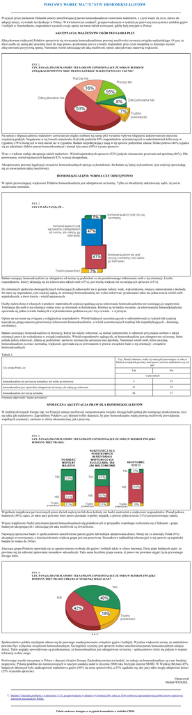 POSTAWY WOBEC MA??E?STW HOMOSEKSUALISTÓW Przyjęcie przez parlament Holandii ustawy umożliwiającej parom homoseksualnym zawieranie małżeństw, z czym wiąże się m.in. prawo do adopcji dzieci, wywołało też dyskusje w Polsce. W kwietniowym sondażu1, przeprowadzonym w tydzień po pierwszej uroczystości zaślubin gejów i lesbijek w Amsterdamie, respondenci wyrażali swoje opinie na temat takich rozwiązań, gdyby były przyjęte w Polsce. AKCEPTACJA MAŁŻEŃSTW OSÓB TEJ SAMEJ PŁCI Zdecydowana większość Polaków sprzeciwia się stwarzaniu homoseksualistom prawnej możliwości zawarcia związku małżeńskiego. O tym, że dwie osoby tej samej płci powinny mieć do tego prawo, przekonany jest co czwarty respondent, przy czym niespełna co dziesiąty wyraża zdecydowanie pozytywną opinię. Natomiast wśród odrzucających taką możliwość opinie zdecydowane stanowią większość. RYS. 1. CZY, PANA(I) ZDANIEM, OSOBY TEJ SAMEJ PŁCI POZOSTAJĄCE ZE SOBĄ W BLISKICH ZWIĄZKACH POWINNY MIEĆ PRAWO ZAWRZEĆ MAŁŻEŃSTWO CZY TEŻ NIE? Na opinie o dopuszczalności małżeństw zawieranych między osobami tej samej płci wyraźnie wpływa religijność ankietowanych mierzona częstością praktyk. Negatywne w tej kwestii stanowisko Kościoła podziela 89% respondentów uczestniczących w nabożeństwach kilka razy w tygodniu i 78% biorących w nich udział raz w tygodniu. Badani niepraktykujący mają w tej sprawie podzielone zdania: blisko połowa (46%) zgadza się na udzielanie ślubów parom homoseksualnym i niemal tyle samo (48%) wyraża sprzeciw. Wraz z wiekiem maleje akceptacja takich małżeństw. Wśród najmłodszych sprzeciw (52%) jedynie nieznacznie przeważa nad aprobatą (46%). Dla porównania, wśród najstarszych badanych 82% wyraża dezaprobatę. Akceptowaniu prawnej legalizacji związków homoseksualnych sprzyja wykształcenie. Im badani są lepiej wykształceni, tym częściej opowiadają się za stworzeniem takiej możliwości. HOMOSEKSUALIZM: NORMA CZY ODSTĘPSTWO W opinii przeważającej większości Polaków homoseksualizm jest odstępstwem od normy. Tylko co dwudziesty ankietowany sądzi, że jest to zachowanie normalne. RYS. 2. CZY UWAŻA PAN(I), ŻE ... Badani uznający homoseksualizm za odstępstwo od normy są podzieleni co do postulowanego traktowania osób o tej orientacji. Liczba respondentów, którzy skłaniają się ku tolerowaniu takich osób (47%), jest trochę większa niż wyrażających sprzeciw (41%). Do zmiennych społeczno-demograficznych różnicujących odpowiedzi na to pytanie należą: wiek, wykształcenie, miejsce zamieszkania i dochody. Im starsi są respondenci, tym częściej sądzą, że orientacji homoseksualnej nie wolno tolerować: przekonanie takie ma jedna trzecia wśród osób najmłodszych, a dwie trzecie - wśród najstarszych. Osoby zadowolone z własnych warunków materialnych częściej zgadzają się na tolerowanie homoseksualizmu niż oceniający je negatywnie. Tolerancja dla osób o tej orientacji rośnie wraz ze wzrostem wykształcenia. Różnice są tu bardzo wyraźne: za tolerowaniem homoseksualizmu opowiada się jedna czwarta badanych z wykształceniem podstawowym i trzy czwarte - z wyższym. Opinie na ten temat są związane z religijnością respondentów. Wśród badanych uczestniczących w nabożeństwach co tydzień lub częściej największą grupę stanowią przeciwnicy tolerowania homoseksualistów, a wśród uczestniczących rzadziej lub niepraktykujących - dominują zwolennicy. Badani uważający homoseksualizm za dewiację, której nie należy tolerować, są niemal jednomyślni w odmowie przyznania osobom o takiej orientacji prawa do wchodzenia w związki małżeńskie. Wśród respondentów sądzących, że homoseksualizm jest odstępstwem od normy, które jednak należy tolerować, zdania są podzielone: sprzeciw nieznacznie przeważa nad aprobatą. Natomiast wśród osób, które uważają homoseksualizm za rzecz normalną, większość opowiada się za zrównaniem w prawie związków ludzi o tej orientacji i związków heteroseksualnych. Tabela 1 Czy, Pana(i) zdaniem, osoby tej samej płci pozostające ze sobą w bliskich związkach powinny mieć prawo zawrzeć małżeństwo czy też nie? Czy uważa Pan(i), że: Tak Nie w procentach homoseksualizm nie jest rzeczą normalną i nie wolno go tolerować 4 93 homoseksualizm jest wprawdzie odstępstwem od normy, ale należy go tolerować 41 52 homoseksualizm jest rzeczą normalną 64 27 Pominięto odpowiedzi "trudno powiedzieć". SPOŁECZNA AKCEPTACJA PRAW DLA HOMOSEKSUALISTÓW W niektórych krajach Europy (np. we Francji) istnieje możliwość zarejestrowania związku dwojga ludzi jednej płci rodzącego skutki prawne, lecz nie takie jak małżeństwo. Zapytaliśmy Polaków, czy skłonni byliby dopuścić, by pary homoseksualne miały prawną możliwość prowadzenia wspólnych czynności, zarówno w sferze ekonomicznej, jak i poza nią. RYS. 3. CZY, PANA(I) ZDANIEM, OSOBY TEJ SAMEJ PŁCI POZOSTAJĄCE ZE SOBĄ W BLISKIM ZWIĄZKU POWINNY MIEĆ PRAWO: Wspólnota majątkowa par tworzonych przez dwóch mężczyzn lub dwie kobiety nie budzi zastrzeżeń u większości respondentów. Ponad połowa badanych (58%) sądzi, że takie pary powinny mieć prawo posiadać wspólny majątek, a prawie jedna trzecia (31%) jest przeciwnego zdania. Więcej wątpliwości budzi przyznanie parom homoseksualnym ulg podatkowych w przypadku wspólnego rozliczania się z fiskusem - grupy badanych akceptujących i odrzucających taką możliwość są równoliczne. Najwięcej sprzeciwu budzi w społeczeństwie umożliwienie parom gejów lub lesbijek adoptowania dzieci. Mniej niż co dziesiąty Polak (8%) akceptuje to rozwiązanie, a dziesięciokrotnie większa grupa jest mu przeciwna. Stosunkowo najbardziej tolerancyjni w tej sprawie są najmłodsi badani (w wieku do 24 lat). Znacząca grupa Polaków opowiada się za ograniczeniem swobody dla gejów i lesbijek także w sferze 