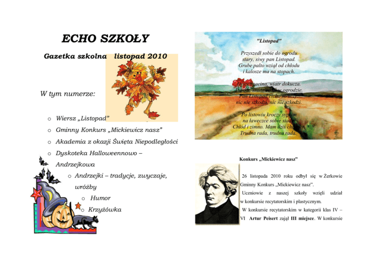 ECHO SZKOŁY Gazetka szkolna listopad 2010 W tym numerze: o Wiersz „Listopad” o Gminny Konkurs „Mickiewicz nasz” "Listopad" Przyszedł sobie do ogrodu stary, siwy pan Listopad. Grube palto wziął od chłodu i kalosze ma na stopach. Deszcz zacina, wiatr dokucza. Pustka, smutek dziś w ogrodzie. Pan Listopad cicho mruczy: nic nie szkodzi, nic nie szkodzi. Po listowiu kroczy sypkim na ławeczce sobie siada. Chłód i zimno. Mam dziś chrypkę. Trudna rada, trudna rada. o Akademia z okazji Święta Niepodległości o Dyskoteka Halloweennowo – Konkurs „Mickiewicz nasz” Andrzejkowa o Andrzejki – tradycje, zwyczaje, wróżby o Humor o Krzyżówka 26 listopada 2010 roku odbył się w Żerkowie Gminny Konkurs „Mickiewicz nasz”. Uczniowie z naszej szkoły wzięli udział w konkursie recytatorskim i plastycznym. W konkursie recytatorskim w kategorii klas IV – VI Artur Peisert zajął III miejsce. W konkursie plastycznym Sandra Kubacka z klasy IV zdobyła jedną z trzech równorzędnych nagród. przygotowania. Nawet w dzień imprezy pracowaliśmy całe popołudnie, przygotowując dekorację holu, gdzie odbywała się zabawa. Gratulacje!!! Podczas tej dyskoteki trzy czarownice zapoznawały uczestników z ciekawostkami dotyczącymi świąt w krajach anglosaskich. Wielką atrakcją były konkursy, np. łowienie jabłek z wody buzią, jedzenie jabłek Akademia z okazji Święta Niepodległości zawieszonych na sznurku bez pomocy rąk, jedzenie czosnku z uśmiechem na twarzy itp. Jak co roku w naszej szkole w przeddzień Święta Niepodległości odbyła się uroczysta Tradycyjnie odbyło się też lanie wosku. Impreza została przygotowana pod kierunkiem pani akademia przygotowana z okazji tego święta. Agnieszki Kostrzewy, opiekunem był także pan Organizatorami akademii byli uczniowie klasy V Marek Janowski. i oni to właśnie przygotowali część artystyczną, na którą złożył się montaż słowno – muzyczny. Dyskoteka była bardzo fajna i wiele osób wspaniale na niej się bawiło. Mogliśmy wysłuchać kilku pieśni patriotycznych Weronika i Natalia. oraz recytacji. Na zakończenie akademii uczniowie klasy V zapalili symboliczny znicz i złożyli wiązankę biało – czerwonych kwiatów w hołdzie Andrzejki - wierzenia i tradycje wszystkim, którzy walczyli o odzyskanie niepodległości. Dyskoteka Halloweennowo – andrzejkowa Dyskoteka odbyła się 18 listopada 2010 r. w godz. 17.00 – 21.00. Do imprezy tej kółko języka angielskiego przygotowywało się kilka tygodni. Było wiele zabaw i konkursów, które wymagały wcześniejszego Wierzono, że w wigilie świętego Andrzeja 29 listopada duchy przodków podobnie jak w noc świętojańską wracają na ziemię i odsłaniają tajemnice - w noc Andrzejkową matrymonialne. Najbardziej rozpowszechnioną wróżbą było lanie na wodę roztopionego wosku przez ucho od klucza a następnie odczytywanie kształtów zastygniętego wosku, najlepiej z cienia rzucanego na oświetloną ścianę. I tak : anioł oznaczał szczęście, gwiazda - powodzenie, kwiat - smutek, orzeł - osiągnięcie zamierzonych celów, a serce - wielką miłość. Dziewczyny przywiązywały również dużą wagę do snów w nocy z 29 na 30 listopada, które miały być prorocze. Chłopcy podobne wróżby odprawiali na świętą Katarzynę - 24 listopada. Wg przysłowia, że w " święto Katarzyny są pod poduszką dziewczyny" ale potem zwyczaj urządzania Katarzynek poszedł w zapomnienie i łącznie urządzano Andrzejki. Inne andrzejkowe wróżby: Buty. Aby dowiedzieć się, która z grona wróżących wyjdzie pierwsza za mąż, należy buty z lewej nogi ustawić rzędem w kącie pokoju. Ostatni w kolejce przestawiany jest na początek i właścicielka buta, który pierwszy dotknie progu lub wyjdzie za drzwi jako pierwsza wyjdzie za mąż Filiżanki. Cztery filiżanki. Pod trzema chowamy: obrączkę, monetę i listek a czwartą zostawiamy pustą. Zamieniamy miejscami filiżanki i wybieramy jedna z nich. Obrączka to miłość, listek - ślub, moneta bogactwo a pusta to nowy rok bez zmian. Imię przyszłego małżonka. 1.Wypisać kartki z imionami i włożyć pod poduszkę, rano wyciągnąć jedną z nich - wyciągnięte imię to imię małżonka. 2.Wyciąć serce z papieru i wypisać na nim imiona, odwrócić kartkę i szpilką przebić serce imię przebite to imię przyszłego męża, jeżeli szpilka trafi na poste miejsce - trzeba czekać do następnego roku. Obieranie jabłek Należy wybrać tyle jednakowej wielkości jabłek, ile jest uczestniczek zabawy. Każda z nich obierając jabłko stara się uzyskać jak najdłuższą, nieprzerwaną ostrużynę. Która wygra, ta będzie najdłużej chodzić ze swoim chłopakiem. W drugim etapie każda dziewczyna bierze swoją ostrużynę w rękę i rzuca za plecy. Teraz należy uważnie się przyjrzeć leżącej na podłodze skórce czy nie układa się w jakaś literę alfabetu. Jeśli tak, to może być pierwsza litera imienia chłopaka, z którym będzie się w tym roku spotykać. Kółeczko Dziewczęta ustawiają się w kółeczku. Do środka wchodzi chłopak z zawiązanymi oczami. Zostaje zakręcony kilka razy, po czym na chybił trafił wybiera jedną z nich. Szczęśliwa wybranka najszybciej ze wszystkich znajdzie swojego chłopaka lub najszybciej wyjdzie za mąż. Humor Nauczyciel zadaje pytanie: - Jasiu, co dla nas jest ważniejsze: Słońce czy Księżyc? - Księżyc oczywiście. - A dlaczego Księżyc? - Bo Księżyc świeci w nocy, gdy jest ciemno, a Słońce za dnia, kiedy i tak jest jasno! - Gdzie podpisano traktat pokojowy po zakończeniu I wojny światowej? - pyta nauczyciel ucznia. - Na samym dole, pod tekstem. 1 - Umiesz pływać? - pyta Jasia instruktor na obozie. - Oczywiście! - A gdzie się nauczyłeś? - W wodzie... Pani nauczycielka pyta Jasia, kto napisał "Pana Tadeusza". Jasio wystraszył się i mówi, że to nie on. Zdenerwowana nauczycielka wezwała ojca i opowiada mu: - Ja p