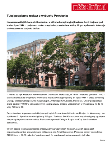 Tutaj podpisano rozkaz o wybuchu Powstania Na warszawskiej Ochocie stoi kamienica, w której w konspiracyjnej kwaterze Armii Krajowej pod koniec lipca 1944 r. podpisano rozkaz o wybuchu powstania w stolicy. O tym wydarzeniu informuje umieszczona na budynku tablica. – Alarm, do rąk własnych Komendantom Obwodów. Nakazuję „W” dnia 1 sierpnia godzina 17.00 – tak brzmiał rozkaz o wybuchu Powstania Warszawskiego wydany 31 lipca 1944 r. przez dowódcę Okręgu Warszawskiego Armii Krajowej płk. Antoniego Chruściela „Montera”. Oficer podpisał go około godziny 19.00 w konspiracyjnym lokalu sztabu okręgu, urządzonym w mieszkaniu nr 46 na ulicy Filtrowej 68. Bezpośrednim impulsem do takiej decyzji były informacje o zbliżaniu się Rosjan do Warszawy. Na spotkaniu 21 lipca komendant główny AK gen. Tadeusz Bór-Komorowski wydał wstępną zgodę na rozpoczęcie powstania w stolicy. Plan zaakceptował Delegat Rządu na Kraj Jan Stanisław Jankowski. W tym czasie wojska niemieckie przegrywały na wszystkich frontach, a w ich szeregach zapanowała panika spowodowana zbliżaniem się Armii Czerwonej. Podczas narady dowództwa AK 31 lipca o 17.00 „Monter” poinformował, że wojska radzieckie wyzwoliły już kilka Strona: 1 podwarszawskich miejscowości, a sowieckie czołgi widziano nawet na Pradze. To przeważyło o podjęciu decyzji o powstaniu. Wkrótce opanowano niemiecką panikę, a zwycięska ofensywa pancerna wojsk III Rzeszy spowolniła sowiecki marsz. Bór-Komorowski uznał jednak, że jest już za późno na odwołanie powstania bez narażania struktur AK na dekonspirację. Historyczny budynek przy Filtrowej 68 spłonął częściowo w czasie walk, ale kamienica przetrwała wojnę. W mieszkaniu, w którym mieściła się konspiracyjna kwatera, sześć lat temu właściciel znalazł ukryte tajne dokumenty Okręgu Warszawskiego AK. Trafiły one do Archiwum Akt Nowych w Warszawie. Strona: 2
