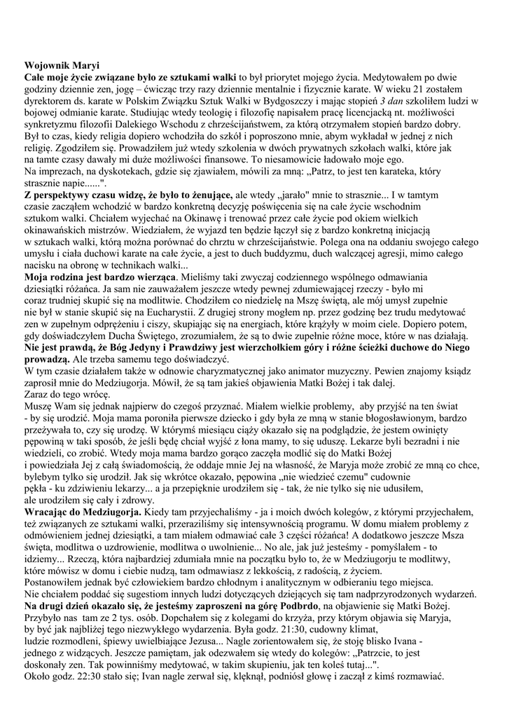 Wojownik Maryi Całe moje życie związane było ze sztukami walki to był priorytet mojego życia. Medytowałem po dwie godziny dziennie zen, jogę – ćwicząc trzy razy dziennie mentalnie i fizycznie karate. W wieku 21 zostałem dyrektorem ds. karate w Polskim Związku Sztuk Walki w Bydgoszczy i mając stopień 3 dan szkoliłem ludzi w bojowej odmianie karate. Studiując wtedy teologię i filozofię napisałem pracę licencjacką nt. możliwości synkretyzmu filozofii Dalekiego Wschodu z chrześcijaństwem, za którą otrzymałem stopień bardzo dobry. Był to czas, kiedy religia dopiero wchodziła do szkół i poproszono mnie, abym wykładał w jednej z nich religię. Zgodziłem się. Prowadziłem już wtedy szkolenia w dwóch prywatnych szkołach walki, które jak na tamte czasy dawały mi duże możliwości finansowe. To niesamowicie ładowało moje ego. Na imprezach, na dyskotekach, gdzie się zjawiałem, mówili za mną: „Patrz, to jest ten karateka, który strasznie napie......". Z perspektywy czasu widzę, że było to żenujące, ale wtedy „jarało" mnie to strasznie... I w tamtym czasie zacząłem wchodzić w bardzo konkretną decyzję poświęcenia się na całe życie wschodnim sztukom walki. Chciałem wyjechać na Okinawę i trenować przez całe życie pod okiem wielkich okinawańskich mistrzów. Wiedziałem, że wyjazd ten będzie łączył się z bardzo konkretną inicjacją w sztukach walki, którą można porównać do chrztu w chrześcijaństwie. Polega ona na oddaniu swojego całego umysłu i ciała duchowi karate na całe życie, a jest to duch buddyzmu, duch walczącej agresji, mimo całego nacisku na obronę w technikach walki... Moja rodzina jest bardzo wierząca. Mieliśmy taki zwyczaj codziennego wspólnego odmawiania dziesiątki różańca. Ja sam nie zauważałem jeszcze wtedy pewnej zdumiewającej rzeczy - było mi coraz trudniej skupić się na modlitwie. Chodziłem co niedzielę na Mszę świętą, ale mój umysł zupełnie nie był w stanie skupić się na Eucharystii. Z drugiej strony mogłem np. przez godzinę bez trudu medytować zen w zupełnym odprężeniu i ciszy, skupiając się na energiach, które krążyły w moim ciele. Dopiero potem, gdy doświadczyłem Ducha Świętego, zrozumiałem, że są to dwie zupełnie różne moce, które w nas działają. Nie jest prawdą, że Bóg Jedyny i Prawdziwy jest wierzchołkiem góry i różne ścieżki duchowe do Niego prowadzą. Ale trzeba samemu tego doświadczyć. W tym czasie działałem także w odnowie charyzmatycznej jako animator muzyczny. Pewien znajomy ksiądz zaprosił mnie do Medziugorja. Mówił, że są tam jakieś objawienia Matki Bożej i tak dalej. Zaraz do tego wrócę. Muszę Wam się jednak najpierw do czegoś przyznać. Miałem wielkie problemy, aby przyjść na ten świat - by się urodzić. Moja mama poroniła pierwsze dziecko i gdy była ze mną w stanie błogosławionym, bardzo przeżywała to, czy się urodzę. W którymś miesiącu ciąży okazało się na podglądzie, że jestem owinięty pępowiną w taki sposób, że jeśli będę chciał wyjść z łona mamy, to się uduszę. Lekarze byli bezradni i nie wiedzieli, co zrobić. Wtedy moja mama bardzo gorąco zaczęła modlić się do Matki Bożej i powiedziała Jej z całą świadomością, że oddaje mnie Jej na własność, że Maryja może zrobić ze mną co chce, bylebym tylko się urodził. Jak się wkrótce okazało, pępowina „nie wiedzieć czemu" cudownie pękła - ku zdziwieniu lekarzy... a ja przepięknie urodziłem się - tak, że nie tylko się nie udusiłem, ale urodziłem się cały i zdrowy. Wracając do Medziugorja. Kiedy tam przyjechaliśmy - ja i moich dwóch kolegów, z którymi przyjechałem, też związanych ze sztukami walki, przeraziliśmy się intensywnością programu. W domu miałem problemy z odmówieniem jednej dziesiątki, a tam miałem odmawiać całe 3 części różańca! A dodatkowo jeszcze Msza święta, modlitwa o uzdrowienie, modlitwa o uwolnienie... No ale, jak już jesteśmy - pomyślałem - to idziemy... Rzeczą, która najbardziej zdumiała mnie na początku było to, że w Medziugorju te modlitwy, które mówisz w domu i ciebie nudzą, tam odmawiasz z lekkością, z radością, z życiem. Postanowiłem jednak być człowiekiem bardzo chłodnym i analitycznym w odbieraniu tego miejsca. Nie chciałem poddać się sugestiom innych ludzi dotyczących dziejących się tam nadprzyrodzonych wydarzeń. Na drugi dzień okazało się, że jesteśmy zaproszeni na górę Podbrdo, na objawienie się Matki Bożej. Przybyło nas tam ze 2 tys. osób. Dopchałem się z kolegami do krzyża, przy którym objawia się Maryja, by być jak najbliżej tego niezwykłego wydarzenia. Była godz. 21:30, cudowny klimat, ludzie rozmodleni, śpiewy uwielbiające Jezusa... Nagle zorientowałem się, że stoję blisko Ivana jednego z widzących. Jeszcze pamiętam, jak odezwałem się wtedy do kolegów: „Patrzcie, to jest doskonały zen. Tak powinniśmy medytować, w takim skupieniu, jak ten koleś tutaj...". Około godz. 22:30 stało się; Ivan nagle zerwał się, klęknął, podniósł głowę i zaczął z kimś rozmawiać. Wszedł w ekstazę. Kapłan, który był przy nim, wziął mikrofon i powiedział, że właśnie Matka Boża przyszła i jest już wśród nas. Wszyscy uklęknęli, ja miałem przed tym opory i nie chciałem uklęknąć, starałem się to wszystko analizować bardzo sceptycznie i na spokojnie. I w pewnym momencie coś się stało. Przyszła do mnie niesamowita fala takiej czułości i takiego szczęścia, że moje ciało, moje emocje, wszystko zaczęło się we mnie totalnie wywracać. Zacząłem płakać jak dziecko. To doświadczenie mocy było zupełnie inne od tego, które uzyskiwałem przez medytację po 15 latach treningu. Było to odczucie... najbardziej niezwykłej kobiety. Bardzo delikatna, bardzo subtelna i łagodna moc płynąca od Najpiękniejszej Dziewczyny we Wszechświecie. 