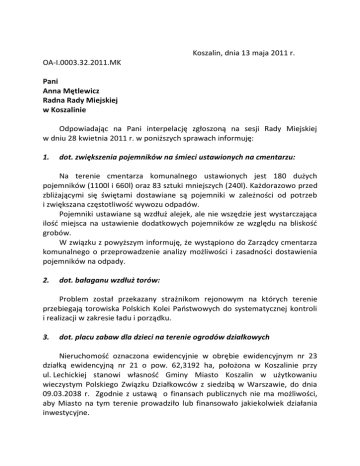 Koszalin, dnia 13 maja 2011 r. OA-I.0003.32.2011.MK Pani Anna Mętlewicz Radna Rady Miejskiej w Koszalinie Odpowiadając na Pani interpelację zgłoszoną na sesji Rady Miejskiej w dniu 28 kwietnia 2011 r. w poniższych sprawach informuję: 1. dot. zwiększenia pojemników na śmieci ustawionych na cmentarzu: Na terenie cmentarza komunalnego ustawionych jest 180 dużych pojemników (1100l i 660l) oraz 83 sztuki mniejszych (240l). Każdorazowo przed zbliżającymi się świętami dostawiane są pojemniki w zależności od potrzeb i zwiększana częstotliwość wywozu odpadów. Pojemniki ustawiane są wzdłuż alejek, ale nie wszędzie jest wystarczająca ilość miejsca na ustawienie dodatkowych pojemników ze względu na bliskość grobów. W związku z powyższym informuję, że wystąpiono do Zarządcy cmentarza komunalnego o przeprowadzenie analizy możliwości i zasadności dostawienia pojemników na odpady. 2. dot. bałaganu wzdłuż torów: Problem został przekazany strażnikom rejonowym na których terenie przebiegają torowiska Polskich Kolei Państwowych do systematycznej kontroli i realizacji w zakresie ładu i porządku. 3. dot. placu zabaw dla dzieci na terenie ogrodów działkowych Nieruchomość oznaczona ewidencyjnie w obrębie ewidencyjnym nr 23 działką ewidencyjną nr 21 o pow. 62,3192 ha, położona w Koszalinie przy ul. Lechickiej stanowi własność Gminy Miasto Koszalin w użytkowaniu wieczystym Polskiego Związku Działkowców z siedzibą w Warszawie, do dnia 09.03.2038 r. Zgodnie z ustawą o finansach publicznych nie ma możliwości, aby Miasto na tym terenie prowadziło lub finansowało jakiekolwiek działania inwestycyjne. Zagospodarowanie nieruchomości stanowiącej teren ogrodów działkowych pod potrzeby jej działkowiczów należy do Polskiego Związku Działkowców i tam należy skierować stosowny wniosek w sprawie. 4. dot. rowów melioracyjnych na terenie Osiedla Raduszka: Nieruchomości oznaczone w ewidencji gruntów i budynków jako rowy będące - w myśl ustawy z dnia 18 lipca 2001 r. Prawo wodne ( Dz. U. z 2005 r. Nr 239 poz. 2019 z późn. zm. ) urządzeniami melioracji wodnych szczegółowych, w wyniku procesów miastotwórczych przestały pełnić funkcje melioracyjne związane z produkcją rolniczą i stały się elementem ogólnomiejskiego systemu kanalizacji deszczowej, którymi odprowadzane są wody opadowe i roztopowe z terenu Miasta Koszalina. Właścicielami tego rodzaju nieruchomości są Skarb Państwa i Gmina Miasto Koszalin. Jako organ gospodarujący zasobem nieruchomości Skarbu Państwa w skład, którego wchodzą miedzy innymi rowy, nie dysponuję ani środkami finansowymi ani odpowiednimi służbami, które mogłyby administrować takimi urządzeniami we właściwy sposób. Z tych względów urządzenia te w większości nie są konserwowane, modernizowane i niejednokrotnie przyczyniają się do podtopień terenów z nimi sąsiadujących. Dlatego też podjąłem rozmowy z jednostką samorządu województwa – Zachodniopomorskim Zarządem Melioracji i Urządzeń Wodnych w Szczecinie, która mogłaby na własny koszt przeprowadzić prace związane z udrożnieniem rowu znajdującego się w rejonie ulicy Połczyńskiej przy Seminarium Duchownym. Stanowisko tej jednostki będzie znane w miesiącu czerwcu - lipcu bieżącego roku. Niezależnie od tego, w tym zakresie trwają uzgodnienia z Miejskimi Wodociągami i Kanalizacją Sp. z o.o. w Koszalinie tj. podmiotem realizującym usługi w zakresie odprowadzania ścieków. 5. dot. dróg na terenie Osiedla Raduszka: Budowa docelowych dróg zostanie wykonana po wybudowaniu pełnego uzbrojenia. Uzbrojenie wodno – kanalizacyjne realizowanie jest w ramach Planu Rozwoju Miejskich Wodociągów i Kanalizacji Sp. z o.o. Konieczne prace tj. przeprofilowywanie i utwardzanie dróg gruzem wykonywane są w miarę potrzeb i posiadanych środków finansowych. Prace te wykonywane są w ramach remontów bieżących nawierzchni tymczasowych. Jednocześnie informuję Panią Radną, iż przeprowadzono analizę własności terenu w obrębie ul. Sikorek, który wskazała Pani jako zanieczyszczony, z analizy wynika, że teren leży poza granicami Miasta Koszalina i należy do Gminy Manowo. 6. dot. chodnika od ul. Działkowej do ul. Żytniej: Budowa chodnika od ulicy Działkowej do ulicy Żytniej przewidziana jest do realizacji w ramach planowanej przebudowy ulicy Połczyńskiej. 7. dot. placu zabaw na terenie Wilkowa: W dniu 28.04.2011 r. Zarząd Dróg Miejskich w Koszalinie otrzymał pozytywną opinię proponowanej nowej lokalizacji placu zabaw na terenie Osiedla na części nieruchomości położonej w Koszalinie przy ulicy Skowronków oznaczonej ewidencyjnie działką ewidencyjną nr 14/1 w obrębie ewidencyjnym nr 47 stanowiącej własność Gminy Miasto Koszalin nie kolidującej z planowaną realizacją pasa drogowego. Wskazywany wcześniej przez Zarząd Dróg Miejskich w Koszalinie teren stanowiący część nieruchomości przy ulicy Skowronków oznaczonej ewidencyjnie działką ewidencyjną nr 65 przeznaczony jest pod zabudowę jednorodzinną wolnostojącą zgodnie z opracowaną koncepcją podziału zagospodarowania w/w działki. W uzgodnieniu z Radą Osiedla Raduszka Zarząd Dróg Miejskich zaproponował kolejną lokalizację placu zabaw na terenie Wilkowa należącym do gminy Miasto Koszalin, stanowiącym część działki 14/1 w obr.47 . Powyższa propozycja została pozytywnie zaopiniowana przez Wydział Architektury i Urbanistyki oraz Wydział Nieruchomości Urzędu Miejskiego. Na dzień dzisiejszy Rada Osiedla Raduszka ma do wyboru dwie pozytywnie zaopiniowane lokalizacje placu zabaw na terenie Wilkowa. Kolejnym etapem będzie pozyskanie środków i przystąpienie do wykonania projektu oraz realizacji placu zabaw dla dzieci. 8. dot. dróg w Wilkowie: Realizacja docelowych dróg będzie możliwa sukcesywnie po wybudowaniu brakującego uzbrojenia. Obecnie Miejskie Wodociągi i Kanalizacja Sp. z o.o.