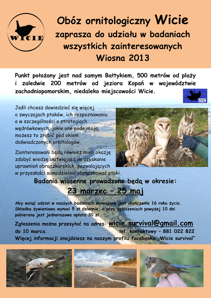 Obóz ornitologiczny Wicie zaprasza do udziału w badaniach wszystkich zainteresowanych Wiosna 2013 Punkt położony jest nad samym Bałtykiem, 500 metrów od plaży i zaledwie 200 metrów od jeziora Kopań w województwie zachodniopomorskim, niedaleko miejscowości Wicie. Jeśli chcesz dowiedzieć się więcej o zwyczajach ptaków, ich rozpoznawaniu a w szczególności o strategiach wędrówkowych, jakie one podejmują, możesz to zrobić pod okiem doświadczonych ornitologów. Zainteresowani będą również mieli okazję zdobyć wiedzę ułatwiającą im uzyskanie uprawnień obrączkarskich, pozwalających w przyszłości samodzielnie obrączkować ptaki. Badania wiosenne prowadzone będą w okresie: 23 marzec – 25 maj Aby wziąć udział w naszych badaniach wymagane jest ukończenie 16 roku życia. Składka żywieniowa wynosi 5 zł dziennie, a przy zgłoszeniach powyżej 10 dni pobierana jest jednorazowa opłata 30 zł. Zgłoszenia można przesyłać na adres: [email protected] do 10 marca. tel. kontaktowy – 881 022 822 Więcej informacji znajdziesz na naszym profilu facebooka „Wicie survival”