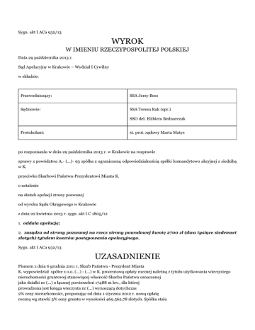 Sygn. akt I ACa 932/13 WYROK W IMIENIU RZECZYPOSPOLITEJ POLSKIEJ Dnia 29 października 2013 r. Sąd Apelacyjny w Krakowie – Wydział I Cywilny w składzie: Przewodniczący: SSA Jerzy Bess Sędziowie: SSA Teresa Rak (spr.) SSO del. Elżbieta Bednarczuk Protokolant: st. prot. sądowy Marta Matys po rozpoznaniu w dniu 29 października 2013 r. w Krakowie na rozprawie sprawy z powództwa A.- (...)- 93 spółka z ograniczoną odpowiedzialnością spółki komandytowo akcyjnej z siedzibą w K. przeciwko Skarbowi Państwa-Prezydentowi Miasta K. o ustalenie na skutek apelacji strony pozwanej od wyroku Sądu Okręgowego w Krakowie z dnia 22 kwietnia 2013 r. sygn. akt I C 1805/12 1. oddala apelację; 2. zasądza od strony pozwanej na rzecz strony powodowej kwotę 2700 zł (dwa tysiące siedemset złotych) tytułem kosztów postępowania apelacyjnego. Sygn. akt I ACa 932/13 UZASADNIENIE Pismem z dnia 6 grudnia 2011 r. Skarb Państwa - Prezydent Miasta K. wypowiedział spółce z o.o. (...) - (...) w K. procentową opłaty rocznej należną z tytułu użytkowania wieczystego nieruchomości gruntowej stanowiącej własność Skarbu Państwa oznaczonej jako działki nr (...) o łącznej powierzchni 17488 m kw., dla której prowadzona jest księga wieczysta nr (...) wynoszącą dotychczas 2% ceny nieruchomości, proponując od dnia 1 stycznia 2012 r. nową opłatę roczną wg stawki 3% ceny gruntu w wysokości 469.562,78 złotych. Spółka stała się użytkownikiem wieczystym tej nieruchomości, nabywając prawo od (...) S.A. z siedzibą w W., która prowadziła na przedmiotowej nieruchomości działalność turystyczną - hotel. Spółka (...) nie prowadzi natomiast działalności turystycznej, wynajmuje lokale znajdujące się na parterze budynku, a na części nieruchomości jest parking. Doszło zatem do zmiany sposobu korzystania z nieruchomości. Spółka (...) od wypowiedzenia stawki złożyła odwołanie do Samorządowego Kolegium Odwoławczego w K., wnosząc o ustalenie, że podwyższenie opłaty na kwotę 469.562,78 złotych jest niezasadne lub zasadne w innej wysokości. Zakwestionowała, spółka że doszło do zmiany przeznaczenia nieruchomości. Fakt, że w umowie z (...) spółka zobowiązała się do nieprowadzenia działalności hotelarskiej przez 10 lat, nie znaczy że doszło do zmiany sposobu korzystania z nieruchomości. Nieruchomość jest wykorzystywana dokładnie w taki sam sposób jak przed zawarciem umowy. Kolegium odwołanie oddaliło, uznając, że doszło do zmiany przeznaczenia nieruchomości, ponieważ wnioskodawca zobowiązał się do nieprowadzenia działalności hotelarskiej na przedmiotowej nieruchomości, zmianę tę uznał za trwałą. Spółka złożyła sprzeciw od orzeczenia Samorządowego Kolegium Odwoławczego z dnia 28 czerwca 2012 roku. Wyrokiem z dnia 22 kwietnia 2013 r. Sąd Okręgowy w Krakowie ustalił, że dotychczasowa stawka procentowa wynosząca 2 % ceny nieruchomości obejmującej działki ewidencyjne nr (...) jedn. ewiden. Kraków Krowodrza objętej księgą wieczystą (...) zachowuje swą aktualność również od dnia 1 stycznia 2012 r. Ustalił Sąd Okręgowy, że właścicielem nieruchomości składającej się z działek nr (...) i nr (...) o łącznej powierzchni 17488 m kw, objętej księgą wieczystą (...) jest Skarb Państwa. Nieruchomość oddana została w użytkowanie wieczyste spółce (...) S.A. Spółka prowadziła na nieruchomości hotel czyli działalność turystyczną, co uzasadniało ustalenie stawki na poziomie 2%. Nieruchomość zabudowana jest budynkiem hotelu C.”. Umową z dnia 22 marca 2011 r. spółka (...) zbyła prawo użytkowania wieczystego powyższej nieruchomości na rzecz spółki (...) (...)Sp. z o. o. S.K.A. z siedzibą w K.. W umowie tej nabywca zobowiązał się, że na nabytej nieruchomości przez okres 10 lat nie będzie prowadził działalności hotelarskiej pod groźbą zapłaty kary umownej. Na części nieruchomości prowadzony jest parking, a niektóre z lokali na parterze budynku są wynajmowane. Okolicznością sporną pomiędzy stronami było to, czy doszło do trwałej zmiany przeznaczenia nieruchomości, co uzasadniałoby zmianę stawki procentowej. W takim stanie faktycznym Sąd pierwszej instancji uznał, że brak jest podstawy do zmiany wysokości stawki procentowej. Powołując art. 72 ust 1 oraz art.67 ustawy o gospodarce nieruchomościami wskazał, że wysokość stawek procentowych opłat rocznych z tytułu użytkowania wieczystego jest uzależniona od określonego w umowie celu, na jaki nieruchomość gruntowa została oddana, i wynosi między innymi: 2 % ceny za nieruchomości gruntowe na działalność turystyczną lub 3 % ceny za pozostałe nieruchomości gruntowe. Ustalenie stawki procentowej opłaty rocznej uzależnionej od celu oddania nieruchomości w użytkowanie jest wiążące na przyszłość, a zmiana musi spełniać przesłanki przewidziane art. 73 ust. 2 u.g.n. trwałej zmiany sposobu korzystania, powodującej zmianę celu. Procedurę zmiany stawki przewiduje art. 73 ust. 2 ustawy i dla jej zastosowania musi nastąpić, po oddaniu nieruchomości gruntowej w użytkowanie wieczyste, trwała zmiana sposobu korzystania z nieruchomości, powodująca zmianę celu, na który nieruchomość została oddana. Nową stawkę określa się stosownie do zmienionego celu. Przy dokonywaniu stawki stosuje się tryb postępowania określony w art. 78-81 ustawy. Wypowiedzenie stawki dokonane pismem z dnia 6 grudnia 2011 r. spełnia wymogi formalne. Ponieważ powodowa spółka zakwestionowała zaproponowana jej nową stawkę opłaty rocznej, zainicjowane zostało postępowanie sądowe, w toku którego Sąd zbadał czy spełnione zostały przesłanki warunkujące zmianę stawki. Zgodnie z art. 73 ust. 2 u.g.n. że stawkę procentową opłaty rocznej zmienia się stosownie do celu, na który wykorzystywana jest nieruchomość oddana w użytkowanie wieczyste. Przesłanką zmiany stawki jest trwał