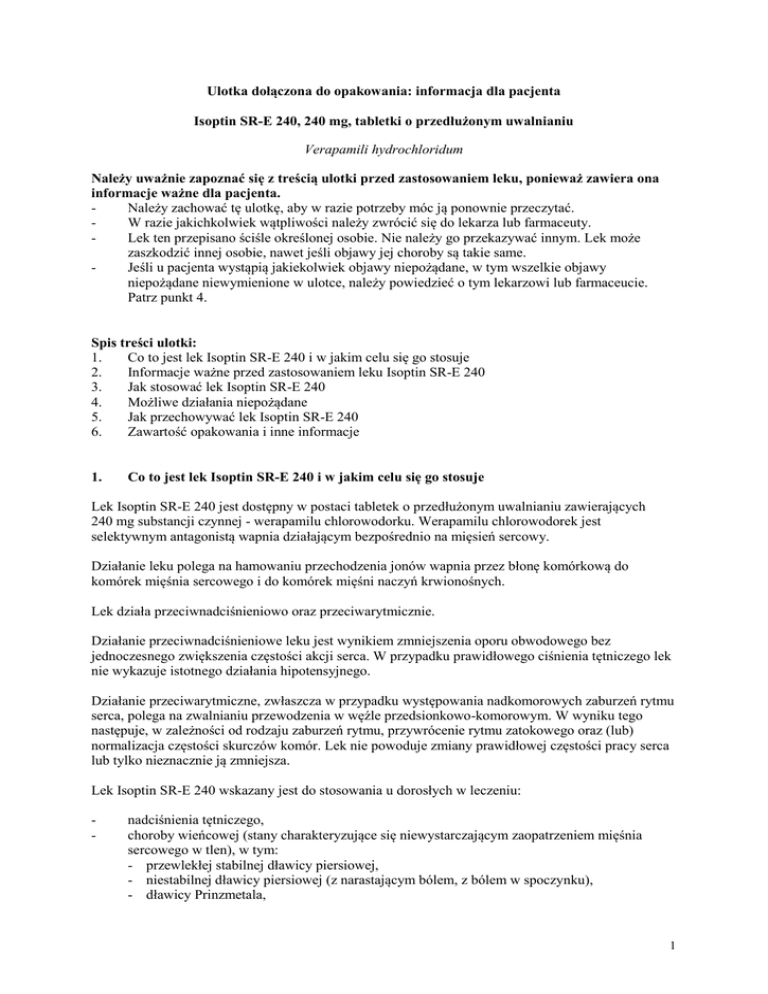 Ulotka dołączona do opakowania: informacja dla pacjenta Isoptin SR-E 240, 240 mg, tabletki o przedłużonym uwalnianiu Verapamili hydrochloridum Należy uważnie zapoznać się z treścią ulotki przed zastosowaniem leku, ponieważ zawiera ona informacje ważne dla pacjenta. Należy zachować tę ulotkę, aby w razie potrzeby móc ją ponownie przeczytać. W razie jakichkolwiek wątpliwości należy zwrócić się do lekarza lub farmaceuty. Lek ten przepisano ściśle określonej osobie. Nie należy go przekazywać innym. Lek może zaszkodzić innej osobie, nawet jeśli objawy jej choroby są takie same. Jeśli u pacjenta wystąpią jakiekolwiek objawy niepożądane, w tym wszelkie objawy niepożądane niewymienione w ulotce, należy powiedzieć o tym lekarzowi lub farmaceucie. Patrz punkt 4. Spis treści ulotki: 1. Co to jest lek Isoptin SR-E 240 i w jakim celu się go stosuje 2. Informacje ważne przed zastosowaniem leku Isoptin SR-E 240 3. Jak stosować lek Isoptin SR-E 240 4. Możliwe działania niepożądane 5. Jak przechowywać lek Isoptin SR-E 240 6. Zawartość opakowania i inne informacje 1. Co to jest lek Isoptin SR-E 240 i w jakim celu się go stosuje Lek Isoptin SR-E 240 jest dostępny w postaci tabletek o przedłużonym uwalnianiu zawierających 240 mg substancji czynnej - werapamilu chlorowodorku. Werapamilu chlorowodorek jest selektywnym antagonistą wapnia działającym bezpośrednio na mięsień sercowy. Działanie leku polega na hamowaniu przechodzenia jonów wapnia przez błonę komórkową do komórek mięśnia sercowego i do komórek mięśni naczyń krwionośnych. Lek działa przeciwnadciśnieniowo oraz przeciwarytmicznie. Działanie przeciwnadciśnieniowe leku jest wynikiem zmniejszenia oporu obwodowego bez jednoczesnego zwiększenia częstości akcji serca. W przypadku prawidłowego ciśnienia tętniczego lek nie wykazuje istotnego działania hipotensyjnego. Działanie przeciwarytmiczne, zwłaszcza w przypadku występowania nadkomorowych zaburzeń rytmu serca, polega na zwalnianiu przewodzenia w węźle przedsionkowo-komorowym. W wyniku tego następuje, w zależności od rodzaju zaburzeń rytmu, przywrócenie rytmu zatokowego oraz (lub) normalizacja częstości skurczów komór. Lek nie powoduje zmiany prawidłowej częstości pracy serca lub tylko nieznacznie ją zmniejsza. Lek Isoptin SR-E 240 wskazany jest do stosowania u dorosłych w leczeniu: - nadciśnienia tętniczego, choroby wieńcowej (stany charakteryzujące się niewystarczającym zaopatrzeniem mięśnia sercowego w tlen), w tym: - przewlekłej stabilnej dławicy piersiowej, - niestabilnej dławicy piersiowej (z narastającym bólem, z bólem w spoczynku), - dławicy Prinzmetala, 1 - - dławicy po zawale mięśnia sercowego bez niewydolności serca, gdy nie jest wskazane stosowanie leków β-adrenolitycznych, zaburzeń rytmu serca takich, jak: - napadowy częstoskurcz nadkomorowy, migotanie/trzepotanie przedsionków z szybkim przewodzeniem przedsionkowo-komorowym (z wyjątkiem zespołu Wolffa-ParkinsonaWhite’a [WPW] lub zespołu Lowna-Ganonga-Levine’a [LGL]). 2. Informacje ważne przed zastosowaniem leku Isoptin SR-E 240 Kiedy nie stosować leku Isoptin SR-E 240 jeśli pacjent ma uczulenie na werapamilu chlorowodorek lub którykolwiek z pozostałych składników tego leku (wymienionych w punkcie 6), we wstrząsie kardiogennym, w bloku przedsionkowo-komorowym II˚ lub III˚ (z wyjątkiem pacjentów ze sprawnym stymulatorem serca), w zespole chorego węzła zatokowego (z wyjątkiem pacjentów ze sprawnym stymulatorem serca), w niewydolności serca ze zmniejszeniem frakcji wyrzutowej poniżej 35% oraz (lub) ciśnieniem zaklinowania w tętnicy płucnej powyżej 20 mmHg (jeśli nie jest wtórne do częstoskurczu nadkomorowego ustępującego po leczeniu werapamilem), w migotaniu/trzepotaniu przedsionków z obecnością dodatkowej drogi przewodzenia (np. zespół Wolffa-Parkinsona-White’a [WPW], zespół Lowna-Ganonga-Levine’a [LGL]). W przypadku podania leku u tych pacjentów istnieje ryzyko wystąpienia tachyarytmii komorowej, w tym migotania komór, jeśli pacjent przyjmuje iwabradynę. Ostrzeżenia i środki ostrożności Szczególną ostrożność należy zachować u pacjentów: z ostrym zawałem mięśnia sercowego powikłanym rzadkoskurczem, znacznym niedociśnieniem tętniczym lub zaburzeniami czynności lewej komory, z blokiem serca, blokiem przedsionkowo-komorowym I˚, rzadkoskurczem, asystolią, stosujących leki przeciwarytmiczne, leki β-adrenolityczne, stosujących digoksynę, z niewydolnością serca z frakcją wyrzutową powyżej 35%, z niedociśnieniem tętniczym, stosujących statyny, z zaburzeniami przewodzenia nerwowo-mięśniowego [miastenia (myasthenia gravis), zespół Lamberta i Eatona, późne stadia dystrofii mięśniowej Duchenne’a], z zaburzeniami czynności nerek, z ciężką niewydolnością wątroby. Lek Isoptin SR-E 240 a inne leki Należy powiedzieć lekarzowi o wszystkich lekach przyjmowanych przez pacjenta obecnie lub ostatnio, także o lekach, które pacjent planuje przyjmować. Możliwe są interakcje werapamilu z następującymi lekami: leki α-adrenolityczne (np. prazosyna, terazosyna), leki przeciwarytmiczne (np. flekainid, chinidyna), leki rozszerzające oskrzela (np. teofilina), leki przeciwdrgawkowe i przeciwpadaczkowe (np. karbamazepina, fenytoina), leki przeciwdepresyjne (np. imipramina), leki przeciwcukrzycowe (np. gliburyd), leki przeciw dnie moczanowej (np. kolchicyna), 2 ˗ - leki stosowane w zakażeniach (np. klarytromycyna, erytromycyna, ryfampicyna, telitromycyna), leki przeciwnowotworowe (np. doksorubicyna), barbiturany (np. fenobarbital), benzodiazepiny i inne leki przeciwlękowe (np. buspiron, midazolam), leki β-adrenolityczne (np. metoprolol, propranolol), glikozydy nasercowe (np. digitoksyna, digoksyna), antagoniści receptora H2 (np. cymetydyna), leki immunomodulujące i immunosupresyjne (np. cyklosporyna, ewerolimus, syrolimus, takrolimus