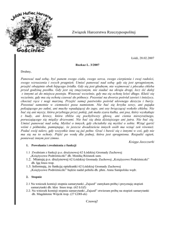 Związek Harcerstwa Rzeczypospolitej Łódź, 28.02.2007 Rozkaz L. 3/2007 Druhny, Panować nad sobą- być panem swego ciała, swego serca, swego cierpienia i swej radości, swego wzruszenia i swych pragnień. Umieć panować nad sobą- gdy się jest spragnionym, przejść obojętnie obok bijącego źródła. Gdy się jest głodnym, nie wyjmować z plecaka chleba przed godziną posiłku. Gdy jest się zmęczonym, nie siadać na skraju drogi, lecz iść dalej z innymi aŜ do miejsca postoju. Wstawać wcześnie, gdy ma się ochotę leŜeć długo. Kłaść się wcześnie, gdy ma się ochotę czuwać do północy. Pozostać na dworze pośród zawiei i śnieŜycy, chociaŜ ręce i nogi marzną. Przejść samej pastwisko pośród ulewnego deszczu i burzy. Pozostać samotnie w ciemności poza namiotem. Nie bać się krzyku sowy, ani pająka pełzającego po sukni, ani muchy wpadającej do zupy, ani osy brzęczącej wokoło chleba. Nie bać się ani myszy, która przebiega przez pokój, jak mała szara kulka, ani psa, który wyskakuje z budy, ani krowy, która zbliŜa się pochyliwszy głowę, ani cienia niewyraźnego, poruszającego się między drzewami. Nie bać się dnia dzisiejszego ani jutra. Nie bać się. Umieć panować nad sobą. Myśleć o innych, gdy chciałoby się myśleć o sobie. Wziąć garść wiśni z półmiska, pamiętając, Ŝe jeszcze dwadzieścia innych osób ma wziąć zeń równieŜ. Podać swój talerz, gdy wszystkie inne są juŜ pełne. Grać i bawić się z innymi w coś, gdy nie ma się na to ochoty. Pójść po wodę dla jednej, która jest spragniona. Rozpalić ogień, poniewaŜ innym jest zimno. Księga Jaszczurki 1. Powołania i zwolnienia z funkcji 1.1 Zwalniam z funkcji p.o. druŜynowej 62 Łódzkiej Gromady Zuchowej „KsięŜycowe PodróŜniczki” dh. Monikę RóŜanek sam. 1.2. Mianuję p.o. druŜynowej 62 Łódzkiej Gromady Zuchowej „KsięŜycowe PodróŜniczki” dh. Igę Imos trop. 1.3. Informuję, Ŝe funkcję opiekunki 62 Łódzkiej Gromady Zuchowej „KsięŜycowe PodróŜniczki” będzie nadal pełniła dh. phm. Anna Sampolska wędr. 2. Stopnie 2.1 Na wniosek komisji stopnia samarytanki „Zajazd” zamykam próbę i przyznaję stopień samarytanki dh. Idze Imos trop. (62 ŁGZ) 2.2. Na wniosek komisji stopnia samarytanki „Zajazd” otwieram próbę na stopień samarytanki dh. Magdalenie Wójcik trop. (27 ŁDH-ek) Czuwaj!