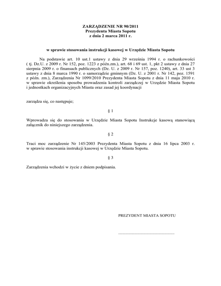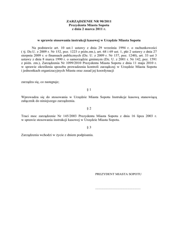ZARZĄDZENIE NR 90/2011 Prezydenta Miasta Sopotu z dnia 2 marca 2011 r. w sprawie stosowania instrukcji kasowej w Urzędzie Miasta Sopotu Na podstawie art. 10 ust.1 ustawy z dnia 29 września 1994 r. o rachunkowości ( tj. Dz.U. z 2009 r. Nr 152, poz. 1223 z późn.zm.), art. 68 i 69 ust. 1, pkt 2 ustawy z dnia 27 sierpnia 2009 r. o finansach publicznych (Dz. U. z 2009 r. Nr 157, poz. 1240), art. 33 ust 3 ustawy z dnia 8 marca 1990 r. o samorządzie gminnym (Dz. U. z 2001 r. Nr 142, poz. 1591 z późn. zm.), Zarządzenia Nr 1099/2010 Prezydenta Miasta Sopotu z dnia 11 maja 2010 r. w sprawie określenia sposobu prowadzenia kontroli zarządczej w Urzędzie Miasta Sopotu i jednostkach organizacyjnych Miasta oraz zasad jej koordynacji zarządza się, co następuje; §1 Wprowadza się do stosowania w Urzędzie Miasta Sopotu Instrukcje kasową stanowiącą załącznik do niniejszego zarządzenia. §2 Traci moc zarządzenie Nr 145/2003 Prezydenta Miasta Sopotu z dnia 16 lipca 2003 r. w sprawie stosowania instrukcji kasowej w Urzędzie Miasta Sopotu. §3 Zarządzenia wchodzi w Ŝycie z dniem podpisania. PREZYDENT MIASTA SOPOTU ....................................................... 2 Załącznik do Zarządzenia Nr 90/2011 Prezydenta Miasta Sopotu z dnia 2 marca 2011 r. INSTRUKCJA KASOWA Wprowadzenie 1. Instrukcja kasowa określa zasady i warunki jakie powinny być spełnione przy prowadzeniu gospodarki kasowej w Urzędzie Miasta Sopotu, oraz warunki zabezpieczenia i przechowywania wartości pienięŜnych. 2. Instrukcja została opracowana na podstawie przepisów: a/ ustawa z dnia 29 września 1994 r. o rachunkowości (t.j. Dz.U. z 2009 r. Nr 152, poz. 1223 z późn. zm.) b/ ustawa z dnia 22 sierpnia 1997r. o ochronie osób i mienia (t.j. Dz.U. z 2005 r. Nr 145,poz. 1221 z późn. zm.) c/ rozporządzenia Ministra Spraw Wewnętrznych i Administracji z dnia 7 września 2010 r. w sprawie wymagań, jakim powinna odpowiadać ochrona wartości pienięŜnych przechowywanych i transportowanych przez przedsiębiorców i inne jednostki organizacyjne ( Dz.U. z 2010 r. Nr 166, poz.1128). §1 UŜyte w instrukcji określenia oznaczają: 1. „środki pienięŜne” są to pieniądze ( banknoty i monety) oraz jednostki pienięŜne ( rozrachunkowe ) krajowe i zagraniczne, tak w gotówce jak i na rachunku bankowym lub w formie lokaty pienięŜnej, czeki i weksle obce, jeŜeli są one płatne w ciągu 3 miesięcy od daty ich wystawienia. 2 „zapas gotówki ( pogotowie kasowe)” – ustalona przez Skarbnika Miasta kwota gotówki, stanowiąca pogotowie kasowe, jaka moŜe być przechowywana w kasie urzędu miasta na koniec danego tygodnia. 3. „maksymalna kwota gotówki” - ustalona przez Skarbnika Miasta maksymalna kwota gotówki jaka moŜe być przechowywana w kasie urzędu miasta na koniec danego dnia. 4. „dowód kasowy” – dokument o ściśle określonym wzorze stanowiący polecenie i jednocześnie pokwitowanie przyjęcia lub wypłaty gotówki z kasy. 5. „przychodowy dowód kasowy” – jest to dowód kasowy na podstawie którego następuje przyjęcie gotówki do kasy. 6. źródłowy dowód kasowy” – dowód kasowy stanowiący podstawę do wypłaty ( faktura, lista płac, itp.). §2 Ogólne zasady rozliczeń pienięŜnych 1. Podmioty gospodarcze dokonują rozliczeń pienięŜnych, które przeprowadza się w formie gotówkowej lub bezgotówkowej. 2. Rozliczenia bezgotówkowe dokonywane są za pośrednictwem kasy. 3 3. Formę rozliczeń gotówkowych moŜna stosować tylko w tych przypadkach, gdy nie jest moŜliwe stosowanie rozliczeń bezgotówkowych. 4. Rozliczenia bezgotówkowe przeprowadza się w jednej z następujących form: polecenie przelewu, polecenie zapłaty, czeku rozrachunkowego karty płatniczej 5. Rozliczenie bezgotówkowe za pośrednictwem rachunku bankowego następuje w kaŜdym przypadku, gdy stroną transakcji jest inny podmiot i jednorazowa wartość naleŜności lub zobowiązań przekracza równowartość 3.000 EURO albo równowartość 1.000 EURO, gdy suma wartości tych naleŜności i zobowiązań powstałych w miesiącu poprzednim przekracza 10.000 EURO, przeliczone na złote według kursu kupna walut obcych ogłaszanego przez NBP z ostatniego dnia miesiąca poprzedzającego miesiąc, w którym dokonywane są operacje finansowe. 6. Kasa urzędu miasta dokonuje tylko bieŜących wypłat gotówkowych za: faktury, rachunki, umowy zlecenia, przyjmuje wpłaty i dokonuje wypłat z tytułu rozliczeń delegacji słuŜbowych oraz pobranych zaliczek, wypłaca wadia, nagrody pienięŜne, zasiłki z funduszu socjalnego. 7. Wszelkie wpłaty na rachunek budŜetu miasta z tytułu podatków i opłat oraz innych wpłat dokonywane są za pośrednictwem ekspozytury banku mieszczącej się w budynku urzędu miasta. §3 Ochrona wartości pienięŜnych 1. Wartości pienięŜne powinny być przechowywane w warunkach zapewniających naleŜytą ochronę przed zniszczeniem, utratą lub zagarnięciem. 2. W godz. pracy urzędu ( od 730 – 1530 ) środki pienięŜne przechowywane są w okratowanym pokoju w specjalnej kasetce. Po zakończeniu pracy kasetkę ze środkami pienięŜnymi naleŜy przenieść z zachowaniem naleŜytej ochrony do wydzielonego okratowanego pomieszczenia i umieścić w kasie pancernej. Pomieszczenie naleŜy zamknąć i włączyć alarm. 3. Duplikat kluczy od kasy pancernej zdeponowany powinien być w miejscu specjalnie zabezpieczonym.. §4 Zapas gotówki w kasie. 1. Urząd Miasta Sopotu moŜe posiadać w kasie : niezbędny zapas gotówki ( pogotowie kasowe ) na bieŜące wydatki, gotówkę podjętą z rachunku bankowego na pokrycie określonych rodzajowo wydatków, gotówkę pochodzącą z bieŜących wpłat do kasy. 2. Wysokość niezbędnego zapasu gotówki w kasie ustala Skarbnik Miasta. Przy ustalanie zapasu gotówki w kasie naleŜy uwzględniać potrzeby urzędu w zakresie obrotu gotówkowego, warunki zabezpieczenia gotówki w kasie. 3. Niezbędny zapas gotówki w kasie w miarę