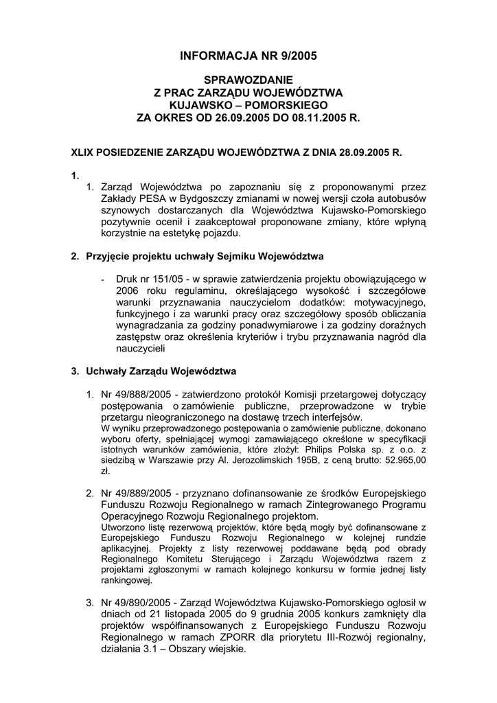 INFORMACJA NR 9/2005 SPRAWOZDANIE Z PRAC ZARZĄDU WOJEWÓDZTWA KUJAWSKO – POMORSKIEGO ZA OKRES OD 26.09.2005 DO 08.11.2005 R. XLIX POSIEDZENIE ZARZĄDU WOJEWÓDZTWA Z DNIA 28.09.2005 R. 1. 1. Zarząd Województwa po zapoznaniu się z proponowanymi przez Zakłady PESA w Bydgoszczy zmianami w nowej wersji czoła autobusów szynowych dostarczanych dla Województwa Kujawsko-Pomorskiego pozytywnie ocenił i zaakceptował proponowane zmiany, które wpłyną korzystnie na estetykę pojazdu. 2. Przyjęcie projektu uchwały Sejmiku Województwa - Druk nr 151/05 - w sprawie zatwierdzenia projektu obowiązującego w 2006 roku regulaminu, określającego wysokość i szczegółowe warunki przyznawania nauczycielom dodatków: motywacyjnego, funkcyjnego i za warunki pracy oraz szczegółowy sposób obliczania wynagradzania za godziny ponadwymiarowe i za godziny doraźnych zastępstw oraz określenia kryteriów i trybu przyznawania nagród dla nauczycieli 3. Uchwały Zarządu Województwa 1. Nr 49/888/2005 - zatwierdzono protokół Komisji przetargowej dotyczący postępowania o zamówienie publiczne, przeprowadzone w trybie przetargu nieograniczonego na dostawę trzech interfejsów. W wyniku przeprowadzonego postępowania o zamówienie publiczne, dokonano wyboru oferty, spełniającej wymogi zamawiającego określone w specyfikacji istotnych warunków zamówienia, które złożył: Philips Polska sp. z o.o. z siedzibą w Warszawie przy Al. Jerozolimskich 195B, z ceną brutto: 52.965,00 zł. 2. Nr 49/889/2005 - przyznano dofinansowanie ze środków Europejskiego Funduszu Rozwoju Regionalnego w ramach Zintegrowanego Programu Operacyjnego Rozwoju Regionalnego projektom. Utworzono listę rezerwową projektów, które będą mogły być dofinansowane z Europejskiego Funduszu Rozwoju Regionalnego w kolejnej rundzie aplikacyjnej. Projekty z listy rezerwowej poddawane będą pod obrady Regionalnego Komitetu Sterującego i Zarządu Województwa razem z projektami zgłoszonymi w ramach kolejnego konkursu w formie jednej listy rankingowej. 3. Nr 49/890/2005 - Zarząd Województwa Kujawsko-Pomorskiego ogłosił w dniach od 21 listopada 2005 do 9 grudnia 2005 konkurs zamknięty dla projektów współfinansowanych z Europejskiego Funduszu Rozwoju Regionalnego w ramach ZPORR dla priorytetu III-Rozwój regionalny, działania 3.1 – Obszary wiejskie. 2 4. Nr 49/891/2005 - wyrażono zgodę Kolejowemu Sanatorium Uzdrowiskowemu im. dr Józefa Krzymińskiego w Inowrocławiu na zakup, ze środków Ministerstwa Zdrowia i środków własnych, urządzenia niskotemperaturowego - kriosauny o wartości ok. 78.080 zł brutto. 5. Nr 49/892/2005 - wyrażono zgodę Regionalnemu Zespołowi Opieki Paliatywnej-Dom Sue Ryder w Bydgoszczy na zakup leasingowy ze środków własnych: 1) 10 sztuk respiratorów o szacunkowej wartości jednostkowej 20.000 zł (całkowita wartość szacunkowa 240.000 zł), 2) pulsoksymetra z kapnografem o szacunkowej wartości 26.800 zł 6. Nr 49/893/2005 - Ramowy Plan Realizacji Działania dla Działania 2.6 „Regionalne Strategie Innowacyjne i transfer wiedzy” w ramach Priorytetu II Zintegrowanego Programu Operacyjnego Rozwoju Regionalnego na rok 2005 przyjęty do realizacji uchwałą Zarządu Województwa Kujawsko-Pomorskiego Nr 8/91/2005 w dniu 2 lutego 2005 r. otrzymał brzmienie jak w załączniku do uchwały. 7. Nr 49/894/2005 - powołano w 2005 r. Komisję ds. Nagród Zarządu Województwa Kujawsko-Pomorskiego. 8. Nr 49/895/2005 - postanowiono odmówić umorzenia opłaty rocznej za rok 2005, w kwocie 139,38 zł, przysługującej Terenowemu Funduszowi Ochrony Gruntów Rolnych - od Pana Marcina Rawskiego, zam. przy ulicy Osiedle Piastowskie 3/29 w Strzelnie, z tytułu wyłączenia gruntów z użytkowania rolniczego, na cele budowy garażu wraz z drogą dojazdową w miejscowości Strzelno, ustalonej decyzją Kierownika Urzędu Rejonowego w Inowrocławiu z dnia 17.10.1996r. znak: G.G.IV.6014.S/19/96 oraz należności odsetkowych, powstałych za zwłokę od nie uiszczonej w terminie w/wskazanej kwoty i pozostałych należności ubocznych. 9. Nr 49/896/2005 - załącznik do uchwały Nr 35/640/2005 Zarządu Województwa Kujawsko-Pomorskiego z dnia 14 lipca 2005r. zatwierdzającej harmonogram rzeczowo-finansowy zadania pod nazwą „Remont budynku” w obiekcie Kujawsko-Pomorskiego Centrum Edukacji Nauczycieli we Włocławku otrzymał brzmienie jak załącznik do uchwały. 10. Nr 49/897/2005 - załącznik do uchwały Nr 22/292/2005 Zarządu Województwa Kujawsko-Pomorskiego z dnia 13 kwietnia 2005r. zatwierdzającej harmonogram rzeczowo-finansowy zadania pod nazwą „Remont pomieszczeń” Nauczycielskiego Kolegium Języków Obcych w Toruniu przy ul. Sienkiewicza 38 otrzymał brzmienie jak załącznik do uchwały. 11. Nr 49/898/2005 - załącznik do uchwały Nr 26/368/2005 Zarządu Województwa Kujawsko-Pomorskiego z dnia 4 maja 2005r. zatwierdzającej harmonogram rzeczowo-finansowy zadania pod nazwą „Zakup sprzętu komputerowego i wyposażenia” w obiekcie Wojewódzkiej i Miejskiej Biblioteki Publicznej w Bydgoszczy otrzymał brzmienie jak załącznik do uchwały. 3 12. Nr 49/899/2005 - załącznik do uchwały Nr 45/796/2005 Zarządu Województwa Kujawsko-Pomorskiego z dnia 31 sierpnia 2005r. w sprawie zatwierdzenia harmonogramu rzeczowo-finansowego zadania pod nazwą „Modernizacja, adaptacja, remont obiektów szpitala oraz zakup sprzętu i aparatury medycznej” w obiektach Wojewódzkiego Szpitala Zespolonego im. L. Rydygiera w Toruniu otrzymał brzmienie jak załącznik do uchwały. 13. Nr 49/900/2005 - z okazji wojewódzkich obchodów Międzynarodowego Dnia Muzyki przyznano nagrody finansowe Zarządu Województwa Kujawsko-Pomorskiego osobom szczególnie zasłużonym dla upowszechniania kultury muzycznej w województwie kujawskopomorskim. Wysokość przyznanych nagród oraz listę osób nagrodzonych stanowi załącznik nr 1 do uchwały. L POSIEDZENIE ZARZĄDU WOJEWÓDZTWA Z DNIA 5.10.2005 R. 1.