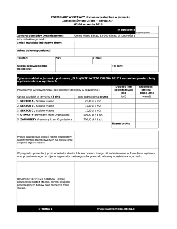 FORMULARZ WYSTAWCY Umowa uczestnictwa w jarmarku „Elbląskie Święto Chleba – edycja XI” 02-04 września 2016 nr zgłoszenia wypełnia operator Zawarta pomiędzy Organizatorem: a Uczestnikiem jarmarku: Imię i Nazwisko lub nazwa firmy: Gmina Miasto Elbląg, 82-300 Elblag, ul. Łączności 1 Adres do korespondencji: Telefon: NIP: E-mail: Osoba odpowiedzialna na stoisku: Tel kom: Zgłaszam udział w jarmarku pod nazwą „ELBLĄSKIE ŚWIĘTO CHLEBA 2016” i zamawiam powierzchnię wystawienniczą o wymiarach Powierzchnia wystawiennicza (opis sektorów dostępny w regulaminie) Opłata za udział w jarmarku (3 dni) cena jednostkowa brutto 1. SEKTOR A / Stoisko własne 20,00 zł / m2 2. SEKTOR B / Stoisko własne 15,00 zł / m2 3. SEKTOR C / Stoisko własne 10,00 zł / m2 4. OTWARTY drewniany kram Organizatora 500,00 zł / 1 szt 5. ZAMKNIETY drewniany kram Organizatora 700,00 zł / 1 szt Długość linii sprzedażowej (m) Głębokość stoiska (max. 3m) ilość wartość Razem brutto Proszę szczegółowo opisać rodzaj eksponatów (asortymentu) prezentowanych na stoisku oraz załączyć zdjęcie stoiska W przypadku prezentacji przez uczestnika stoiska lub asortymentu innego niż zadeklarowane w formularzu wystawcy oraz przedstawionego na zdjęciu, organizator zastrzega sobie prawo do odmowy uczestnictwa w jarmarku. RYSUNEK TECHNICZY STOISKA - proszę naszkicować kształt stoiska, określić długości poszczególnych boków oraz zaznaczyć front stoiska. STRONA 1 www.swietochleba.elblag.pl Instalacja elektryczna, zamówienie przyłącza: Proszę wymienić urządzenia elektryczne wraz z określeniem mocy według tabliczki znamionowej urządzenia: opłata za 1kW 1. Zamawiam przyłącze energii Deklarowana elektrycznej w układzie moc przyłącza jednofazowym (230V) (kW): 16 kW 2. Zamawiam przyłącze energii elektrycznej w układzie Deklarowana trójfazowym (400V) moc przyłącza (kW): wartość 60,00 zł 32 kW 120,00 zł Razem brutto Łączna wartość brutto zamówionej powierzchni oraz przyłącza elektrycznego: uczestnik opłaca po otrzymaniu potwierdzenia przyjęcia zgłoszenia Warunki płatności: - 100% łącznej wartości brutto zamówionej powierzchni oraz przyłącza elektrycznego w ciągu 7 dni od akceptacji zgłoszenia przez operatora W tytule przelewu należy wpisać, nazwę firmy, imię i nazwisko wystawcy podane w formularzu Podmiotem odpowiedzialnym za pobieranie opłat z tytułu uczestnictwa jest Operator jarmarku: GRUPA MERLIN ANDRZEJ DUSZYŃSKI, 82-300 Elbląg, ul. Portowa 2 proszę o wystawienie faktury VAT Opłatę za uczestnictwo w Jarmarku należy przekazać wyrażam zgodę na wysłanie faktury przelewem na konto Operatora nr: 08 1020 1752 0000 drogą elektroniczną na adres 0502 0076 5388 lub opłacić gotówką w siedzibie Operatora podany w formularzu Wyrażam zgodę na przetwarzanie danych osobowych w celu Zapoznałem się i akceptuję warunki Regulaminu realizacji postanowień umowy uczestnictwa w jarmarku Jarmarku pn. „Elbląskie Święto Chleba 2016” (zgodnie z przepisami ustawy z dnia 29 sierpnia 1997 r. o stanowiącego integralną część niniejszej umowy ochronie danych osobowych – Dz.U.Nr 101 z 2002 r. poz.926 z uczestnictwa. późniejszymi zmianami. podpis osoby upoważnionej do reprezentowania firmy miejscowość, data pieczęć firmy Termin dostarczenia zgłoszeń upływa w dniu: 15 sierpnia 2016 Wypełniony i podpisany formularz oraz fotografię należy dostarczyć do organizatora w formie zeskanowanej na adres e-mail, przesłać faksem lub listem poleconym na poniższe dane. Za datę dostarczenia zgłoszenia uważa się datę wpłynięcia do organizatora prawidłowo wypełnionego i podpisanego formularza. Telefon: 55 237-81-02 / Fax: 55 620-32-73 E-mail: [email protected] Adres do korespondencji: Biuro Organizacyjne Jarmarku „Elbląskie Święto Chleba 2016”, 82-300 Elbląg, ul. Portowa 2 Adres e-mail Proszę zaznaczyć preferowaną formę otrzymania zwrotnego potwierdzenia przyjęcia zgłoszenia: Fax List polecony STRONA 2 www.swietochleba.elblag.pl Wypełnia Operator POTWIERDZENIE PRZYJĘCIA ZGŁOSZENIA W ramach potwierdzenie, Operator odsyła tylko STRONĘ 3 Osoba odpowiedzialna za obsługę wystawców z ramienia Operatora Jarmarku – Magdalena Śmietanko Kom. 694 732 138 Potwierdzenie przyjęcia zgłoszenia na: numer zgłoszenia : „Elbląskie Święto Chleba – edycja XI” w terminie 02 – 04 września 2016 roku dane wystawcy Łączna wartość brutto do opłaty: Data przyjęcia zgłoszenia: pieczątka podpis osoby upoważnionej