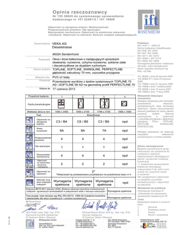 Opinia rzeczoznawcy Nr 155 36645 do systemowego sprawozdania badawczego nr 101 22491/2 i 101 19908 Odporność na obciążenie wiatrem. Wodoszczelność. Przepuszczalność powietrza. Siły operacyjne. Wytrzymałość mechaniczna. Odporność na wielokrotne otwieranie i zamykanie. Odporność na uderzenie. Nośność urządzeń zabezpieczających. Zleceniodawca VEKA AG Dieselstrasse 48324 Sendenhorst Podzespół Nazwa systemu Materiał ramy Przedmiot Ważna do Okna i drzwi balkonowe o następujących sposobach otwierania: rozwierne, uchylno-rozwierne; szklenie stałe i dwuskrzydłowe ze słupkiem ruchomym. TOPLINE, SOFTLINE, SWINGLINE, PERFECTLINE głębokość zabudowy 70 mm, uszczelka przylgowa PVC-U/ biały Przeniesienie wyników z testów systemowych TOPLINE 70 AD i SOFTLINE 58 AD na geometrię profili PERFECTLINE 70 17 czerwca 2013 Przedmiot badania 1 2 1400 x 2400 1000 x 2150 3 4 1746 x 2150 1000 x 1000 Cechy konstrukcyjne Wielkość okna w mm Test EN 12210 Odporność na obciążenie wiatrem Klasyfikacja C3 / B4 C5 / B5 C3 / B5 npd 9A 9A 7A npd Przepuszczalność powietrza 4 4 4 npd Siły operacyjne 1 1 1 npd Wytrzymałość mechaniczna 4 4 4 npd Odporność na wielokrotne otwieranie i zamykanie 2 2 2 npd Wodoszczelność EN 12208 Podstawa EN 14351-1 : 2006-03 Normy badawcze i klasyfikacyjne EN 1026, EN 12207 EN 1027, EN 12208 EN 12211, EN 12210 EN 12046-1, EN 13115 EN 14608, EN 14609 Wymagania jakościowe i badawcze dla okien, drzwi zewnętrznych, fasad i ogrodów zimowych wg RAL- GZ 695. 101 26592 z dnia 26 stycznia 2004 155 26592 R1 z dnia 23 czerwca 2008 101 19908 z dnia 21 stycznia 1999 155 19908 z dnia 7 kwietnia 2004 103 30026 z dnia 15 marca 2007 106 19908 z dnia 17 lipca 2008 Wskazówki dotyczące stosowania Niniejsza ekspertyza jest dowodem przeniesienia własności przedstawionych obok konstrukcji okiennych. Opinia rzeczoznawców stanowi podstawę do oceny jakości produkcji stolarki okiennej wykonywanej w systemach z uszczelką przylgową o głębokości zabudowy 70mm -TOPLINE, SOFTLINE, SWINGLINE, PERFEKTLINE. Niniejsza ekspertyza nie obejmuje wszystkich właściwości wymienionych w normie produktu. EN 12207 EN 13115 EN 13115 EN 12400 Odporność na uderzenie EN 13049 Nośność urządzeń zabezpieczających 2* *Właściwość tę przetestowano przykładowo na przedmiocie testu nr 4 Wymagania spełnione Wymagania spełnione Wymagania spełnione npd Wytyczna ift FE-06/1 (sierpień 2005) „Badanie własności łączników mechanicznych i połączeń zgrzewanych prostopadłych w połączeniach okien z tworzyw sztucznych.” Wymagania spełnione 06-10 / 688 Test przylgi i test ościeża wg RAL-RG 607/3: 1995-02 Ustalenia kontrolne i jakościowe dla okuć rozwiernych i uchylno-rozwiernych ift Rosenheim 28 lipca 2008 Jörn Peter Lass, Dipl.-Ing. (FH) Kierownik komórki badawczej ift Centrum Okien i Elewacji Wymagania spełnione Michael Breckl-Stock, M.Eng., Dipl.-Ing. (FH) inżynier badawczy ift Centrum Okien i Elewacji Zakres obowiązywania Badanie wymienionych wyżej właściwości nie upoważnia do orzekania o dalszych właściwościach określających jakość i sprawność niniejszej konstrukcji. 1). Systemowe sprawozdanie badawcze obowiązuje maksymalnie 5 lat, jeśli w tym czasie nie uczyniono zmian w systemie. Nie uwzględniono odporności na działanie czynników atmosferycznych i odporności na starzenie. Wskazówki do publikacji Obowiązuje instrukcja ift „Wskazówki do stosowania sprawozdań badawczych ift". Treść Ekspertyza zawiera w sumie 6 stron 1. Zlecenie 2. Podstawa oceny 3. Ocena 4. Wynik i orzeczenie Strona: 2z6 Opinia rzeczoznawcy nr.: 155 36645 z dnia 28 lipca 2008 Zleceniodawca: VEKA AG, 48324 Sendenhorst 1 Zlecenie Firma VEKA AG, 48324 Sendenhorst, zleciła instytutowi ift Rosenheim sporządzenie ekspertyzy określonego poniżej stanu rzeczy. Wyniki sprawozdania badawczego 101 26592, mają być przeniesione z uwzględnieniem odchyleń wymienionych w poniższej tabeli. 2 Podstawa oceny Ocenę wydano na podstawie: Q:\FenFas\PROJEKTE\155\36645_Veka\36645.doc 06-10 / 688 − − − − − − − doc ot d. 645. 36 \ auer eka V251_D _e\ 5s ie 664 \3 5achw N \15 EB TP K on_06\ is r s\PROJE ve 8d\ 8 aor 6 w \: V opisu systemu firmy VEKA AG 101 26592 z dnia 26 stycznia 2004 155 26592 R1 z dnia 23 czerwca 2008 101 19908 z dnia 21 stycznia 1999 155 19908 z dnia 7 kwietnia 2004 103 30026 z dnia 15 marca 2007 106 19908 z dnia 17 lipca 2008 Strona: 3z6 Opinia rzeczoznawcy nr.: 155 36645 z dnia 28 lipca 2008 Zleceniodawca: VEKA AG, 48324 Sendenhorst 3 Ocena Tabela 1 Porównanie wersji testowanej z wersją, na którą przeniesiono wyniki Q:\FenFas\PROJEKTE\155\36645_Veka\36645.doc 06-10 / 688 Porównanie wersji testowanej z wersją, na którą przeniesiono wyniki ekspertyzy doc ot d. 645. 36 \ auer eka V251_D _e\ 5s ie 664 \3 5achw N \15 EB TP K on_06\ is r s\PROJE ve 8d\ 8 aor 6 w \: V Wersja testowana Wersja, na którą przeniesiono wyniki ekspertyzy Strona: 4z6 Opinia rzeczoznawcy nr.: 155 36645 z dnia 28 lipca 2008 Zleceniodawca: VEKA AG, 48324 Sendenhorst Q:\FenFas\PROJEKTE\155\36645_Veka\36645.doc 06-10 / 688 Porównanie wersji testowanej z wersją, na którą przeniesiono wyniki ekspertyzy doc ot d. 645. 36 \ auer eka V251_D _e\ 5s ie 664 \3 5achw N \15 EB TP K on_06\ is r s\PROJE ve 8d\ 8 aor 6 w \: V Wersja testowana Wersja, na którą przeniesiono wyniki ekspertyzy Strona: 5z6 Opinia rzeczoznawcy nr.: 155 36645 z dnia 28 lipca 2008 Zleceniodawca: VEKA AG, 48324 Sendenhorst Q:\FenFas\PROJEKTE\155\36645_Veka\36645.doc 06-10 / 688 Porównanie wersji testowanej z wersją, na którą przeniesiono wyniki ekspertyzy doc ot d. 645. 36 \ auer eka V251_D _e\ 5s ie 664 \3 5achw N \15 EB TP K on_06\ is r s\PROJE ve 8d\ 8 aor 6 w \: V Wersja testowana Wersja, na którą przeniesiono wyniki ekspertyzy Strona: 6z6 Opinia rzeczoznawcy nr.: 155 36645 z dnia 28 lipca 2008 Zleceniodawca: VEKA AG, 48324 Sendenhorst Porównanie wersji testowanej z wersją, na którą 