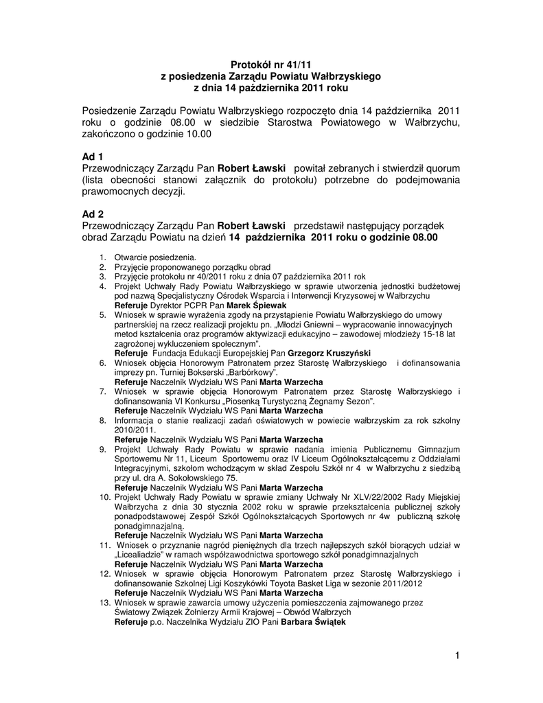 1 Protokół nr 41/11 z posiedzenia Zarządu Powiatu Wałbrzyskiego z