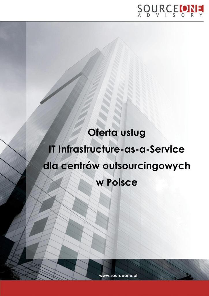 Oferta usług IT Infrastructure-as-a-Service dla centrów outsourcingowych w Polsce Oferta IT IaaS dla centrów outsourcingowych Wprowadzenie W ostatnich latach mamy do czynienia z dużym zainteresowaniem Polską, jako potencjalną destynacją dla lokowania centrów outsourcingowych. W chwili obecnej działa tu już ok. 700 jednostek tego typu, a łączne zatrudnienie w sektorze BPO przekroczyło 160.000 osób. Inwestorzy decydujący się na uruchomienie swych nowych operacji tego typu zmuszeni są ponosić duże nakłady inwestycyjne związane z najmem i wyposażaniem swych biur, rekrutacją pracowników oraz wdrażaniem technologii IT niezbędnych do funkcjonowania centrum outsourcingowego. Jako firma mająca ponad 15-letnie doświadczenie w branży outsourcingu oraz dogłębnie znająca realia tego biznesu w Polsce, chcemy Państwu zaproponować kompleksową usługę udostępnienia pełnego środowiska IT w modelu Infrastructure-as-a-Service. Oznacza to, że SourceOne inwestuje w zakup kompletnego wyposażenia IT wymaganego do pracy Waszego centrum, wdraża i instaluje cały sprzęt, a potem zapewnia profesjonalną obsługę całości rozwiązania. Państwo podpisujecie z nami jedynie umowę na określony czas (min. 12-miesięczny), a następnie dokonujecie stałych, z góry uzgodnionych opłat miesięcznych za pełną obsługę. Jeśli Wasze centrum outsourcingowe będzie się rozwijało i zdecydujecie zatrudnić kolejnych pracowników, wówczas wystarczy zlecić nam instalację dodatkowych stanowisk komputerowych. Usługa zostanie zrealizowana w ciągu kilku dni, a Państwa serwisowa opłata miesięczna zmieni się o stawkę precyzyjnie określoną w umowie. Opis usługi Główne element proponowanej Państwu usługi, to: SourceOne na własny koszt kupuje kompletny sprzęt IT wymagany do funkcjonowania Waszego centrum outsourcingowego SourceOne we własnym zakresie instaluje i wdraża całość zakupionego sprzętu oraz oprogramowania w Państwa siedzibie (jednorazowe usługi instalacji) SourceOne zapewnia stałą opiekę serwisową nad zainstalowanym rozwiązaniem, która polega na: o świadczeniu usług Help Desk (zdalnej pomocy) dla wszystkich pracowników centrum, w przypadku wystąpienia jakichkolwiek problemów lub awarii (usługa świadczona od poniedziałku do piątku w godz. 9 – 17, do 60 zgłoszeń w miesiącu) o wizytach serwisanta w Państwa centrum w przypadku, kiedy zdalna naprawa nie jest możliwa o prewencyjnych wizytach naszego serwisanta w Państwa siedzibie (1x w tygodniu 4 godz.) o zdalnym monitorowaniu infrastruktury IT (24/7/365) o zdalnym administrowaniu infrastruktury IT (pon. – pt., godz. 9 – 17) o czas naprawy uszkodzenia – następny dzień roboczy *) powyżej zaprezentowano przykładową konfigurację usług Strona 2 Oferta IT IaaS dla centrów outsourcingowych Przykładowa konfiguracja sprzętu IT dla 20 użytkowników 20 stacji roboczych – Dell OptiPlex 3020 z monitorem Dell Professional P2214H serwer PowerEdge R530, Windows Standard 2012 R2 backup plików QNAP TS-451U, 4 TB UPS dla serwera – APC Smart-UPS SRT 8000VA 230V telefonia VOIP, rozwiązanie CISCO (jednostka centralna + 20 użytkowników) Koszty usług Nazwa komponentu IT 1 stacja robocza Opłata mies. dla kontraktu 12 mies. Opłata mies. dla kontraktu 24 mies. 395 205 Serwer centralny z backup i UPS 6 250 3 120 Telefonia VOIP 1 050 530 Koszt miesięcznego wsparcia dla całej 6 450 6 450 infrastruktury IT (do 60 zgłoszeń serwisowych w mies.) Koszt instalacji infrastruktury IT: opłata jednorazowa, płatna po instalacji nie obejmuje instalacji aplikacji klienta 17.500 Wszystkie kwoty podane w niniejszym dokumencie są kwotami netto w PLN i zostanie do nich doliczony podatek VAT w wysokości 23%. Powyższe wyliczenia bazują na naszych wstępnych założeniach co do konfiguracji sprzętu, zakresu i poziomów jakościowych usług. Na zapytanie, możliwe są też inne konfiguracje sprzętu oraz usług. Kontakt Piotr Rutkowski SourceOne Advisory sp.j. Partner Zarządzający ul. Domaniewska 39A tel.: (+48) 607 499 048 02-672 Warszawa mail: [email protected] tel.: (+48) 22 244 22 55 www.sourceone.pl Strona 3