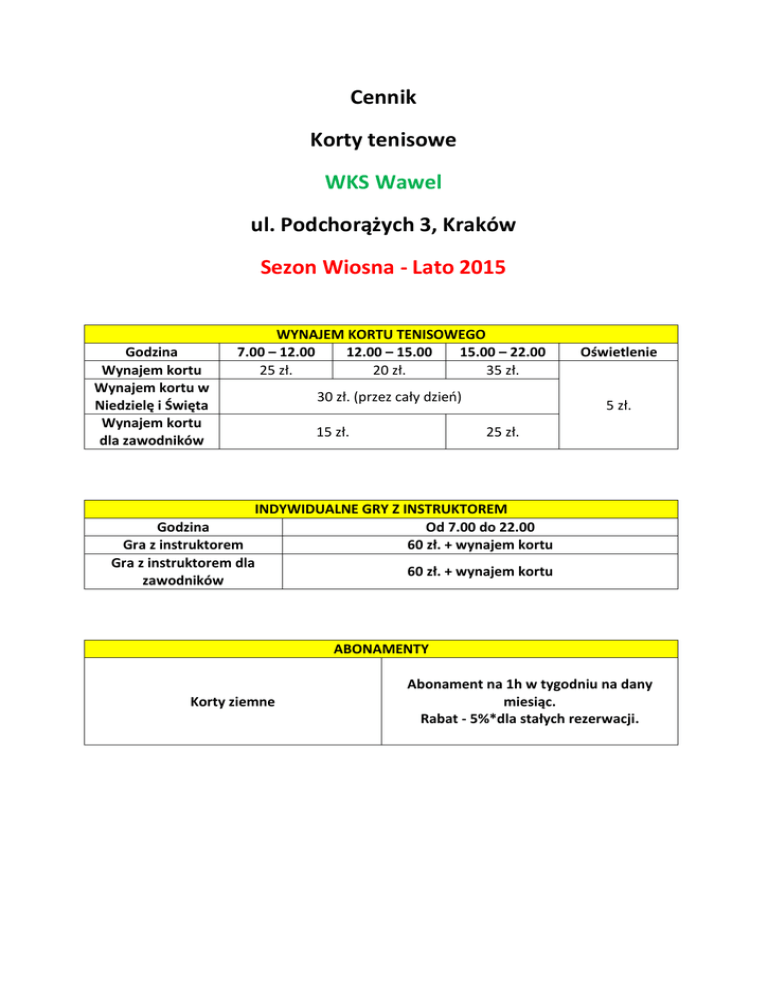 Cennik Korty tenisowe WKS Wawel ul. Podchorążych 3, Kraków Sezon Wiosna - Lato 2015 Godzina Wynajem kortu Wynajem kortu w Niedzielę i Święta Wynajem kortu dla zawodników WYNAJEM KORTU TENISOWEGO 7.00 – 12.00 12.00 – 15.00 15.00 – 22.00 25 zł. 20 zł. 35 zł. 30 zł. (przez cały dzień) 15 zł. Oświetlenie 5 zł. 25 zł. INDYWIDUALNE GRY Z INSTRUKTOREM Godzina Od 7.00 do 22.00 Gra z instruktorem 60 zł. + wynajem kortu Gra z instruktorem dla 60 zł. + wynajem kortu zawodników ABONAMENTY Korty ziemne Abonament na 1h w tygodniu na dany miesiąc. Rabat - 5%*dla stałych rezerwacji.