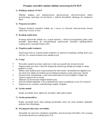 Przepisy zawodów makiet zdalnie sterowanych F4 H-P: 1) Definicja makiety F4 H-P Makieta latająca jest zmniejszonym uproszczonym odwzorowaniem statku powietrznego cięższego od powietrza o stałych skrzydłach zdolnego do transportu ludzi. 2) Program zawodów: Program każdych zawodów składa się z oceny za wierność odwzorowania (ocena statyczna) i oceny za loty. 3) Komis ja sędziowska Komisja sędziowska składa się z trzech sędziów, z których przynajmniej jeden musi posiadać uprawnienia do samodzielnego sędziowania zawodów ogólnopolskich wydane przez Aeroklub Polski (AP) 4) Współczynniki trudności Jeżeli stosowane są współczynniki trudności to sędziowie punktują według skali ocen od 0 do 10 z zastosowaniem ocen ułamkowych. 5) Uwagi Wszystkie modele powinny startować w taki sam sposób jak ich pierwowzór. Dopuszczalny jest start z ręki lub urządzenia startowego jednak powoduje to utratę punktów za start. Żadna część modelu poza wyposażeniem do sterowania i akumulatorem napędowym nie może być odjęta od modelu ani też dodana pomiędzy oceną statyczną i lotami. Zastosowanie niezgodnego z odwzorowaniem pierwowzoru kołpaka i śmigła nie wpływa negatywnie na ocenę. Zabrania się stosowania śmigieł metalowych. Jeśli od modelu odpadnie w locie jakakolwiek część to punktacja za ten lot wynosi 0. Dopuszcza się wymiany uszkodzonego śmigła i kołpaka. 6) Liczba modeli Każdy zawodnik może zgłosić do zawodów tylko jeden model. 7) Liczba pomocników Każdy zawodnik może mieć jednego pomocnika, który nie może dotykać nadajnika podczas lotu oficjalnego. 8) Wymagania dotyczące zawodnika Zawodnik nie musi być członkiem aeroklubu, stowarzyszenia lub klubu. Nie wymaga się licencji sportowej wydanej przez A.P . 9) Dokumentacja modeli Za dostarczenie trzech egzemplarzy dokumentacji niezbędnej do oceny wierności odwzorowania zgodnej z wymaganiami punktów 9a,9b,9c odpowiada zawodnik. a. Do dokumentacji musi być załączona na formacie A4 strona zawierająca: 1. Nazwa statku powietrznego 2. Typ 3. Źródło dokumentacji 4. Podziałka w jakiej wykonano model (P) 5. Prędkość maksymalna pierwowzoru. (km/h) 6. Prędkość przelotowa (podróżna) pierwowzoru (Vp) 7. Powierzchnia nośna płata pierwowzoru (m2) 8. Powierzchnia nośna płata modelu (m2) 9. Obciążenie powierzchni nośnej modelu (kg/m2) 10. Prędkość przelotowa modelu zgodna ze skalą (Vp/P) 11. Rok budowy modelu 12. Imię i nazwisko, podpis zawodnika b. Dokumentacja musi zawierać rysunek zaczerpnięty z ogólnodostępnej publikacji: czasopismo lub wydawnictwo książkowe przedstawiający pierwowzór w trzech rzutach (widok z boku lewego lub prawego, z góry, z przodu) w takiej podziałce aby zmieścił się na formacie A4 a rozpiętość płata nie przekraczała 200 mm i nie była mniejsza niż 120 mm. c. Co najmniej jedną kolorową fotografię lub reprodukcję fotografii pierwowzoru w całości umożliwiając punktację za kolorystykę i oznakowanie i ocenę tych cech. Maksymalna liczba fotografii wynosi trzy. Fotografie mogą być zastąpione opisem malowania lub oznakowania z ogólnodostępnych publikacji. Brak fotografii lub opisu powoduje ocenę 0 za kolorystykę i oznakowanie. 10) Ocena wierności odwzorowania skali: Widok z boku Widok z góry Widok z przodu Kolorystyka Oznakowanie Szczegóły K=5 K=5 K=5 K=3 K=4. K=2 Nie ocenia się wnętrza kokpitu i struktury powierzchni. Ocena 0 punktów za jeden z trzech widoków przez każdego z trzech sędziów jest równoznaczna z nieuznaniem modelu za makietę I powoduje zakończenie oceny oraz niedopuszczenie do lotów. Oceny należy dokonać z odległości nie mniejszej nie mniejszej niż 3 metry i nie większej niż 5 metrów od modelu. Czas oceny nie powinien przekraczać 10 minut. 11) Wykonanie Dopuszcza się makiety nie wykonane przez zawodnika. 12) Punktacja Ocena za wierność odwzorowania według punktu 10 powinna być sumą punktów przyznanych przez 3 sędziów. Ta ocena jest zaliczona do punktacji wtedy, gdy model wykona lot oficjalny. 13) Charakterystyka techniczna: Maksymalna masa kompletnej makiety gotowej do lotu (bez paliwa) wynosi 5 kg. Maksymalne obciążenie powierzchni nośnej płata 10kg/m2 Dopuszcza się stosowanie napędu silnikiem spalinowym tłokowym o maksymalnej pojemności silnika lub silników 15cm3. Napęd silnikiem elektrycznym lub silnikami o napięciu zasilania max24V 14) Wyposażenie radiowe Nie stawia się ograniczeń co do wyposażenia radiowego i mechanicznego. Używanie programatorów i urządzeń stabilizujących jest zabronione. 15) Ocena za lot Zgodnie z obowiązującymi przepisami FAI dla klasy F4C. 16) Ocena końcowa: Na ocenę końcową składa się suma punktów przyznanych zgodnie z punktem 12 oraz średnia ocen za dwa najlepsze loty zgodnie z punktem 15. Jeżeli zawodnik zaliczył tylko jeden lot wtedy otrzymuje połowę punktów za ten lot do wyniku końcowego. Jeżeli z przyczyn niezależnych od organizatorów mogą być rozegnane mniej niż trzy kolejki lotów, ocena końcowa dokonywana jest następująco: Jeżeli odbyły się dwie kolejki, stosuje się średnią ocen za dwa loty jeżeli odbyła się tylko jedna kolejka, do wyniku oceny statycznej dodaje się wynik tego lotu. Oficjalne wyniki kolejki mogą być zarejestrowane tylko wtedy gdy wszyscy zawodnicy mieli jednakową możliwość wykonania lotów w tej kolejce. Projekt: Stanisław Maciąg 503 518 070 24 261 91 68