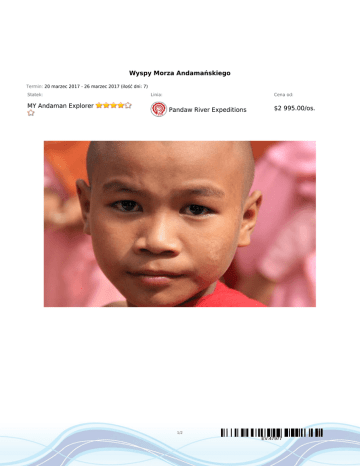 Wyspy Morza Andamańskiego Termin: 20 marzec 2017 - 26 marzec 2017 (ilość dni: 7) Statek: MY Andaman Explorer Linia: Cena od: Pandaw River Expeditions $2 995.00/os. 1/2 EV:47977 TRASA REJSU dzień 1 Data Port Wpłynięcie Wypłynięcie poniedziałek 20.03.2017 Kawthaung, Birma --:-- --:-- wtorek 21.03.2017 Naung Wee Island, Birma --:-- --:-- środa 22.03.2017 Lampi Marine Park Narodowy, Birma --:-- --:-- --:-- --:-- --:-- --:-- --:-- --:-- --:-- --:-- dzień 2 dzień 3 Legenda Mjanma Mjanma Mjanma dzień 4 dzień 5 czwartek 23.03.2017 Kyun Pila Island, Birma piątek 24.03.2017 Nga Man Group of Islands, Birma Mjanma Mjanma dzień 6 dzień 7 sobota 25.03.2017 Cockscomb Island, Birma niedziela 26.03.2017 Kawthaung, Birma Mjanma Mjanma CENNIK Cena katalogowa Kabina zewnętrzna z oknem $2 995.00 Kabina jednoosobowa na zapytanie 3 osoba dorosła w kabinie na zapytanie Opłaty portowe Cena promocyjna w cenie Uwaga! Ceny za osobę w kabinie dwuosobowej. 2/2 EV:47977