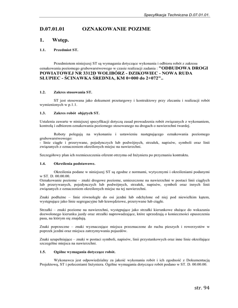 Specyfikacja Techniczna D.07.01.01. D.07.01.01 1. 1.1. OZNAKOWANIE POZIME Wstęp. Przedmiot ST. Przedmiotem niniejszej ST są wymagania dotyczące wykonania i odbioru robót z zakresu oznakowania poziomego grubowarstwowego w czasie realizacji zadania : "ODBUDOWA DROGI POWIATOWEJ NR 3312D WOLIBÓRZ - DZIKOWIEC - NOWA RUDA SŁUPIEC - ŚCINAWKA ŚREDNIA, KM 0+000 do 2+072".. 1.2. Zakres stosowania ST. ST jest stosowana jako dokument przetargowy i kontraktowy przy zlecaniu i realizacji robót wymienionych w p.1.1. 1.3. Zakres robót objętych ST. Ustalenia zawarte w niniejszej specyfikacji dotyczą zasad prowadzenia robót związanych z wykonaniem, kontrolą i odbiorem oznakowania poziomego stosowanego na drogach o nawierzchni twardej. Roboty polegają na wykonaniu i ustawieniu następującego oznakowania poziomego grubowarstwowego: - linie ciągłe i przerywane, pojedynczych lub podwójnych, strzałek, napisów, symboli oraz linii związanych z oznaczeniem określonych miejsc na nawierzchni. Szczegółowy plan ich rozmieszczenia oferent otrzyma od Inżyniera po przyznaniu kontraktu. 1.4. Określenia podstawowe. Określenia podane w niniejszej ST są zgodne z normami, wytycznymi i określeniami podanymi w ST. D. 00.00.00. Oznakowanie poziome – znaki drogowe poziome, umieszczone na nawierzchni w postaci linii ciągłych lub przerywanych, pojedynczych lub podwójnych, strzałek, napisów, symboli oraz innych linii związanych z oznaczeniem określonych miejsc na tej nawierzchni. Znaki podłużne – linie równoległe do osi jezdni lub odchylone od niej pod niewielkim kątem, występujące jako linie segregacyjne lub krawędziowe, przerywane lub ciągłe. Strzałki – znaki poziome na nawierzchni, występujące jako strzałki kierunkowe służące do wskazania dozwolonego kierunku jazdy oraz strzałki naprowadzające, które uprzedzają o konieczności opuszczenia pasa, na którym się znajdują. Znaki poprzeczne – znaki wyznaczające miejsca przeznaczone do ruchu pieszych i rowerzystów w poprzek jezdni oraz miejsca zatrzymywania pojazdów. Znaki uzupełniające – znaki w postaci symboli, napisów, linii przystankowych oraz inne linie określające szczególne miejsca na nawierzchni. 1.5. Ogólne wymagania dotyczące robót. Wykonawca jest odpowiedzialny za jakość wykonania robót i ich zgodność z Dokumentacją Projektową, ST i poleceniami Inżyniera. Ogólne wymagania dotyczące robót podano w ST. D. 00.00.00. str. 94 Specyfikacja Techniczna D.07.01.01. 2. Materiały. Materiały do poziomego znakowania dróg – materiały zawierające rozpuszczalniki, wolne od rozpuszczalników lub punktowe elementy odblaskowe, które mogą zostać naniesione albo wbudowane przez malowanie, natryskiwanie, odlewanie, wtłaczanie, rolowanie, klejenie itp. na nawierzchnie drogowe , stosowane w temperaturze otoczenia lub w temperaturze podwyższonej. Materiały do oznakowania grubowarstwowego – materiały nakładane warstwą o grubości 3,0 – 5,0 mm. Mogą być zastosowane chemoutwardzalne masy stosowane na zimno lub masy termoutwardzalne. Kulki szklane – materiał do posypywania lub narzucania pod ciśnieniem na oznakowanie wykonane materiałami w stanie ciekłym, w celu uzyskania widzialności oznakowania w nocy. 3. Sprzęt. Do wykonania oznakowania grubowarstwowego należy stosować mechaniczne lub ręczne układarki mas termoplastycznych i chemoutwardzalnych. Zastosowane układarki muszą zapewnić równomierną i o założonej grubości warstwę rozłożonego materiału, zachowując wymiary i ostrość krawędzi. 4. Transport. Do transportu służą dowolne środki transportowe zaakceptowane przez Inżyniera. 5. Wykonanie robót. 5.1. Nawierzchnia przygotowana do wykonania znakowania musi być czysta i sucha. 5.2. Przedznakowanie. W celu dokładnego wykonania poziomego oznakowania drogi, na odcinkach, na których wykonane będzie nowe oznakowanie należy wykonać przy użyciu sprzętu geodezyjnego przedznakowanie, stosując się do ustaleń zawartych w dokumentacji projektowej, „Szczegółowych warunkach technicznych dla znaków drogowych poziomych i warunkach ich umieszczania na drogach, SST i wskazaniach Inspektora Nadzoru, 5.3. Wykonanie znakowania drogi materiałami grubowarstwowymi Materiał znakujący należy nakładać równomierną warstwą o żądanej grubości 3,0 – 5,0 mm, zachowując wymiary i ostrość krawędzi. Ilość materiału zużyta w czasie prac, określona przez srednie zużycie na metr kwadratowy, nie może się różnić od ilości ustalonej, więcej niż 20%. 5.4. Oznakowanie i zabezpieczenie robót Wykonawca zapewnia oznakowanie i zabezpieczenie odcinka robót wg zatwierdzonego projektu organizacji ruchu. 6. Kontrola jakości robót. 6.1.Kontrola jakości robót polega na sprawdzeniu wykonania wg wymogów podanych w p. 2 i 5. 6.2. Oznakowanie poziome powinno się charakteryzować następującymi parametrami: - widzialność w dzień – współczynnik luminacji w świetle rozproszonym Qd powinien wynosić przy odbiorze robót co najmniej 130 mcd/m²lx - widzialność w nocy – powierzchniowy współczynnik odblasku R1 powinien wynosić w stanie suchym przy odbiorze robót minimum 300 mcd/m²/1x 6.3.Tolerancja wymiarów oznakowania Tolerancja wykonanego oznakowania poziomego, zgodnego z dokumentacją projektową i str. 95 Specyfikacja Techniczna D.07.01.01. „Szczegółowymi warunkami technicznymi dla znaków poziomych….”, powinna odpowiadać następującym warunkom: - szerokość linii może się różnić od wymaganego o ±5mm - długość linii może być mniejsza od wymaganej co najwyżej o 50 mm lub większa co najwyżej o 150 mm - dla linii przerywanych, długość cyklu składającego się z linii i przerwy nie może odbiegać od średniej liczonej z 10 kolejnych cykli o więcej niż o ± 50 mm długości wymaganej. - dla strzałek, liter i cyfr rozstaw punktów narożnikowych nie może mieć większej odchyłki od wymaganego wzoru niż ± 50 mm,