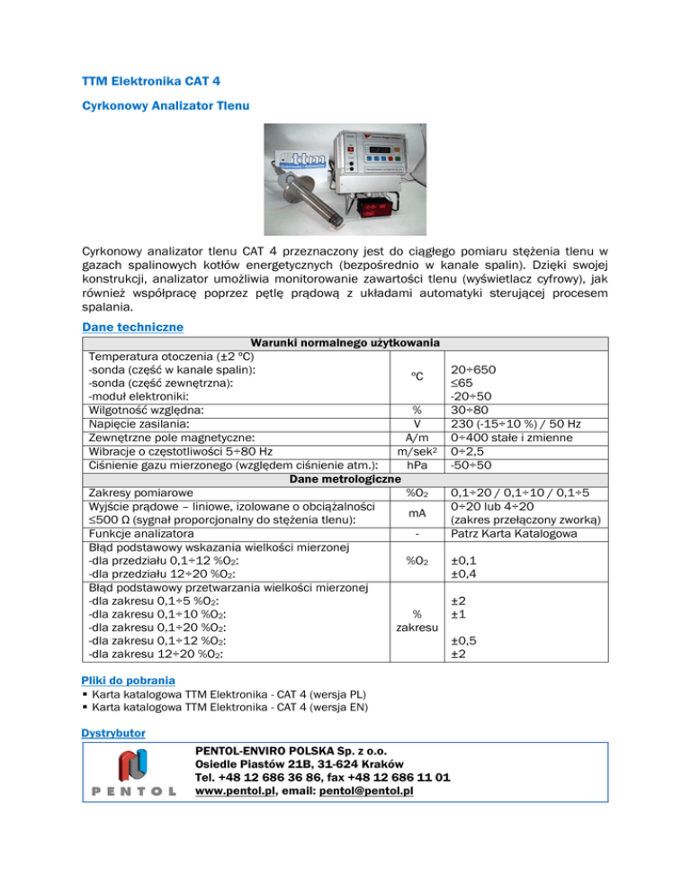 TTM Elektronika CAT 4 Cyrkonowy Analizator Tlenu Dane techniczne