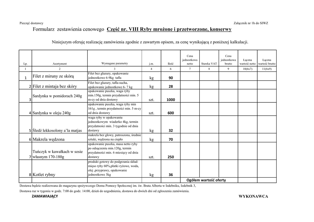 Pieczęć dostawcy Załącznik nr 1h do SIWZ Formularz zestawienia cenowego Część nr. VIII Ryby mrożone i przetworzone, konserwy Niniejszym oferuję realizację zamówienia zgodnie z zawartym opisem, za cenę wynikającą z poniższej kalkulacji. Lp. Asortyment 1 2 Filet z miruny ze skórą 1 2 Filet z mintaja bez skóry 3 Sardynka w pomidorach 240g 4 Sardynka w oleju 240g 5 Śledź lekkosolony a’la matjas 6 Makrela wędzona Tuńczyk w kawałkach w sosie 7 własnym 170-180g 8 Kotlet rybny Wymagane parametry j.m. Ilość Cena jednostkowa netto 3 4 6 7 kg 90 kg 28 szt. 1000 szt. 600 kg 32 kg 70 szt. 250 kg 36 Filet bez glazury, opakowanie jednostkowe 6-9kg tafla Filet bez glazury, tafla-sucha, opakowanie jednostkowe 6- 7 kg opakowanie puszka, waga ryby min.150g, termin przydatności min. 5 m-cy od dnia dostawy opakowanie puszka, waga ryby min 161g , termin przydatności min. 5 m-cy od dnia dostawy waga ryby w opakowaniu jednostkowym wiaderko 4kg, termin przydatności min. 3 tygodnie od dnia dostawy makrela bez głowy, patroszona, średnie sztuki, wędzona na ciepło opakowanie puszka, masa netto ryby po odsączeniu min.120g, termin przydatności min. 6 miesięcy od dnia dostawy produkt gotowy do podgrzania skład: mięso ryby 60%,płatki ryżowe, woda, olej ,przyprawy, opakowanie jednostkowe 3kg Stawka VAT Cena jednostkowa brutto 8 9 Łączna Łączna wartość netto wartość brutto 10(6x7) 11(6x9) Ogółem wartość oferty Dostawa będzie realizowana do magazynu spożywczego Domu Pomocy Społecznej im. św. Brata Alberta w Izdebniku, Izdebnik 3, Dostawa raz w tygoniu w godz. 7:00 do godz. 14:00, dzień do uzgodnienia, dostawa do dwóch dni od zgłoszenia zamówienia. ZAMAWIAJĄCY WYKONAWCA