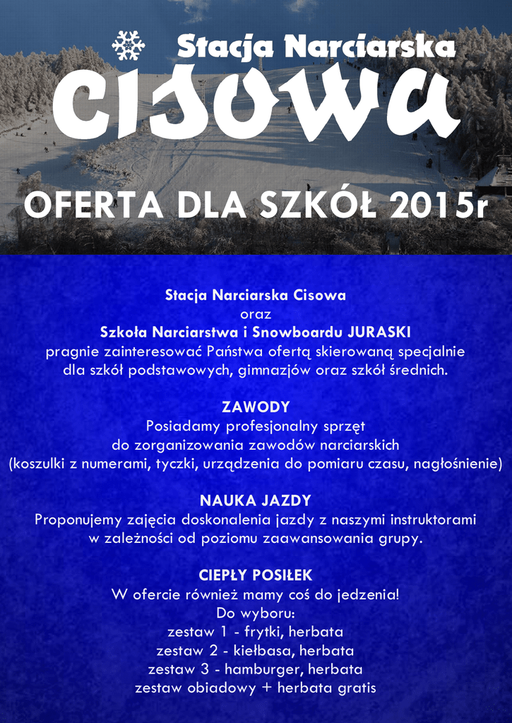 OFERTA DLA SZKÓŁ 2015r Stacja Narciarska Cisowa oraz Szkoła Narciarstwa i Snowboardu JURASKI pragnie zainteresować Państwa ofertą skierowaną specjalnie dla szkół podstawowych, gimnazjów oraz szkół średnich. ZAWODY Posiadamy profesjonalny sprzęt do zorganizowania zawodów narciarskich (koszulki z numerami, tyczki, urządzenia do pomiaru czasu, nagłośnienie) NAUKA JAZDY Proponujemy zajęcia doskonalenia jazdy z naszymi instruktorami w zależności od poziomu zaawansowania grupy. CIEPŁY POSIŁEK W ofercie również mamy coś do jedzenia! Do wyboru: zestaw 1 - frytki, herbata zestaw 2 - kiełbasa, herbata zestaw 3 - hamburger, herbata zestaw obiadowy + herbata gratis CENNIK: KARNETY Dla uczniów ceny według cennika www.cisowa.pl/cennik Dla nauczycieli darmowy karnet (1 opiekun na 10osób) ZAWODY Koszt całej obsługi zawodów dla szkoły 800zł (rozłożenie tyczek, nagłośnienie, pomiar czasu, ceremonia wręczenia nagród, koszulki startowe) NAUKA JAZDY grupy 4-8 osób 200zł za 2h doskonalenia jazdy z instruktorem inne opcje do ustalenia przez telefon POSIŁEK zestaw 1 - frytki, herbata 6zł zestaw 2 - kiełbasa, herbata 8zł zestaw 3 - hamburger, herbata 8zł zestaw obiadowy 12zł herbata gratis Istnieje również możliwość wypożyczenia sprzętu w naszej wypożyczalni. Grupa powyżej 10 osób dostanie zniżkę na sprzęt 10% KONTAKT. Stacja Narciarska Cisowa Robert Izydorczyk 533 663 700 [email protected]