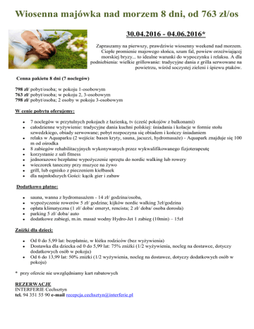 Wiosenna majówka nad morzem 8 dni, od 763 zł/os 30.04.2016 - 04.06.2016* Zapraszamy na pierwszy, prawdziwie wiosenny weekend nad morzem. Ciepłe promienie majowego słońca, szum fal, powiew orzeźwiającej morskiej bryzy... to idealne warunki do wypoczynku i relaksu. A dla podniebienia: wielkie grillowanie: tradycyjne dania z grilla serwowane na powietrzu, wśród soczystej zieleni i śpiewu ptaków. Cenna pakietu 8 dni (7 noclegów) 798 zł/ pobyt/osoba; w pokoju 1-osobowym 763 zł/ pobyt/osoba; w pokoju 2, 3-osobowym 798 zł/ pobyt/osoba; 2 osoby w pokoju 3-osobowym W cenie pobytu oferujemy: 7 noclegów w przytulnych pokojach z łazienką, tv (cześć pokojów z balkonami) całodzienne wyżywienie: tradycyjne dania kuchni polskiej: śniadania i kolacje w formie stołu szwedzkiego, obiady serwowane; pobyt rozpoczyna się obiadem i kończy śniadaniem relaks w Aquaparku (2 wejścia: basen kryty, sauna, jacuzzi, hydromasaże) - Aquapark znajduje się 100 m od ośrodka 8 zabiegów rehabilitacyjnych wykonywanych przez wykwalifikowanego fizjoterapeutę korzystanie z sali fitness jednorazowe bezpłatne wypożyczenie sprzętu do nordic walking lub rowery wieczorek taneczny przy muzyce na żywo grill, lub ognisko z pieczeniem kiełbasek dla najmłodszych Gości: kącik gier i zabaw Dodatkowo płatne: sauna, wanna z hydromasażem - 14 zł/ godzina/osoba, wypożyczenie rowerów 5 zł/ godzina; kijków nordic walking 3zł/godzina opłata klimatyczna (1 zł/ doba/ emeryt, rencista; 2 zł/ doba/ osoba dorosła) parking 5 zł/ doba/ auto dodatkowe zabiegi, m.in. masaż wodny Hydro-Jet 1 zabieg (10min) – 15zł Zniżki dla dzieci: Od 0 do 5,99 lat: bezpłatnie, w łóżku rodziców (bez wyżywienia) Dostawka dla dziecka od 0 do 5,99 lat: 75% zniżki (1/2 wyżywienia, nocleg na dostawce, dotyczy dodatkowych osób w pokoju) Od 6 do 13,99 lat: 50% zniżki (1/2 wyżywienia, nocleg na dostawce, dotyczy dodatkowych osób w pokoju) * przy ofercie nie uwzględniamy kart rabatowych REZERWACJE INTERFERIE Cechsztyn tel. 94 351 55 90 e-mail [email protected] Wiosenna majówka nad morzem 8 dni, od 763 zł/os 30.04.2016 - 04.06.2016* Zapraszamy na pierwszy, prawdziwie wiosenny weekend nad morzem. Ciepłe promienie majowego słońca, szum fal, powiew orzeźwiającej morskiej bryzy... to idealne warunki do wypoczynku i relaksu. A dla podniebienia: wielkie grillowanie: tradycyjne dania z grilla serwowane na powietrzu, wśród soczystej zieleni i śpiewu ptaków. Cenna pakietu 8 dni (7 noclegów) 798 zł/ pobyt/osoba; w pokoju 1-osobowym 763 zł/ pobyt/osoba; w pokoju 2, 3-osobowym 798 zł/ pobyt/osoba; 2 osoby w pokoju 3-osobowym W cenie pobytu oferujemy: 7 noclegów w przytulnych pokojach z łazienką, tv (cześć pokojów z balkonami) całodzienne wyżywienie: tradycyjne dania kuchni polskiej: śniadania i kolacje w formie stołu szwedzkiego, obiady serwowane; pobyt rozpoczyna się obiadem i kończy śniadaniem relaks w Aquaparku (2 wejścia: basen kryty, sauna, jacuzzi, hydromasaże) - Aquapark znajduje się 100 m od ośrodka 8 zabiegów rehabilitacyjnych wykonywanych przez wykwalifikowanego fizjoterapeutę korzystanie z sali fitness jednorazowe bezpłatne wypożyczenie sprzętu do nordic walking lub rowery wieczorek taneczny przy muzyce na żywo grill, lub ognisko z pieczeniem kiełbasek dla najmłodszych Gości: kącik gier i zabaw Dodatkowo płatne: sauna, wanna z hydromasażem - 14 zł/ godzina/osoba, wypożyczenie rowerów 5 zł/ godzina; kijków nordic walking 3zł/godzina opłata klimatyczna (1 zł/ doba/ emeryt, rencista; 2 zł/ doba/ osoba dorosła) parking 5 zł/ doba/ auto dodatkowe zabiegi, m.in. masaż wodny Hydro-Jet 1 zabieg (10min) – 15zł Zniżki dla dzieci: Od 0 do 5,99 lat: bezpłatnie, w łóżku rodziców (bez wyżywienia) Dostawka dla dziecka od 0 do 5,99 lat: 75% zniżki (1/2 wyżywienia, nocleg na dostawce, dotyczy dodatkowych osób w pokoju) Od 6 do 13,99 lat: 50% zniżki (1/2 wyżywienia, nocleg na dostawce, dotyczy dodatkowych osób w pokoju) * przy ofercie nie uwzględniamy kart rabatowych REZERWACJE INTERFERIE Cechsztyn tel. 94 351 55 90 e-mail [email protected]