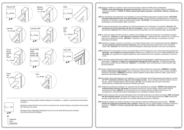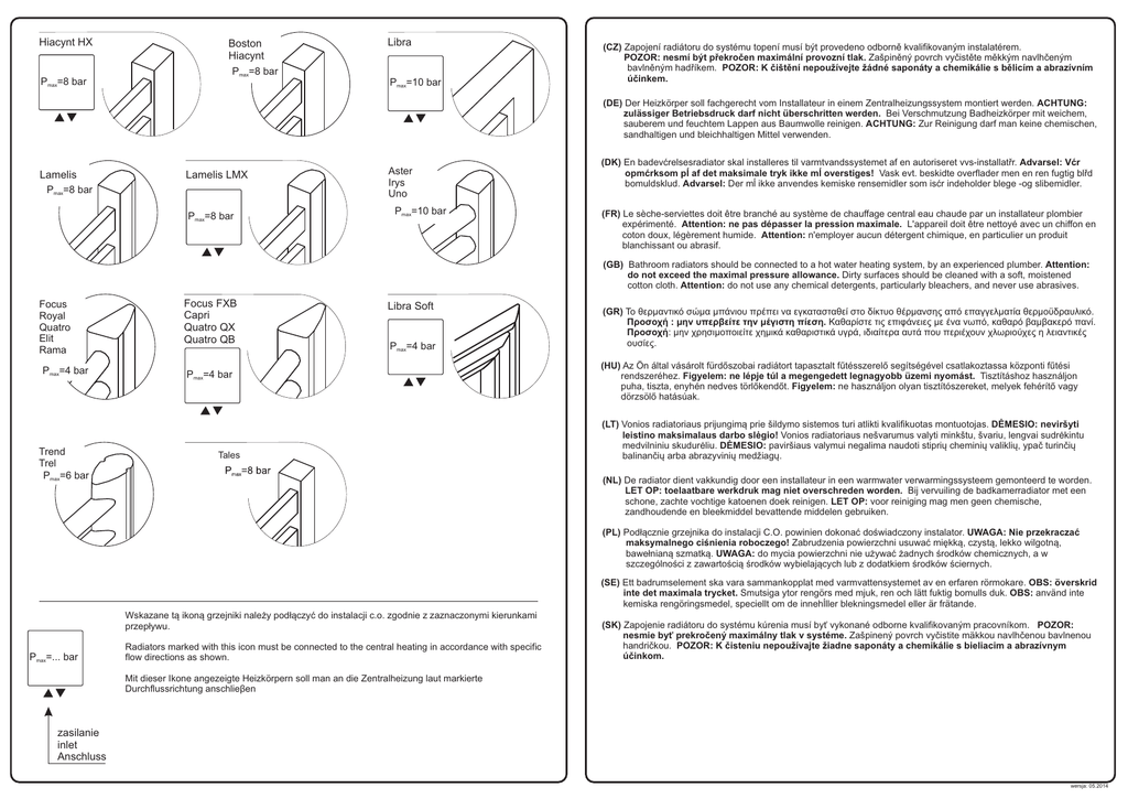 Hiacynt HX Pmax=8 bar Boston Hiacynt Pmax=8 bar Libra Pmax=10 bar (CZ) Zapojení radiátoru do systému topení musí být provedeno odborně kvalifikovaným instalatérem. POZOR: nesmí být překročen maximální provozní tlak. Zašpiněný povrch vyčistěte měkkým navlhčeným bavlněným hadříkem. POZOR: K čištění nepoužívejte žádné saponáty a chemikálie s bělicím a abrazívním účinkem. (DE) Der Heizkörper soll fachgerecht vom Installateur in einem Zentralheizungssystem montiert werden. ACHTUNG: zulässiger Betriebsdruck darf nicht überschritten werden. Bei Verschmutzung Badheizkörper mit weichem, sauberem und feuchtem Lappen aus Baumwolle reinigen. ACHTUNG: Zur Reinigung darf man keine chemischen, sandhaltigen und bleichhaltigen Mittel verwenden. Lamelis Pmax=8 bar Lamelis LMX Pmax=8 bar Aster Irys Uno Pmax=10 bar (DK) En badevćrelsesradiator skal installeres til varmtvandssystemet af en autoriseret vvs-installatřr. Advarsel: Vćr opmćrksom pĺ af det maksimale tryk ikke mĺ overstiges! Vask evt. beskidte overflader men en ren fugtig blřd bomuldsklud. Advarsel: Der mĺ ikke anvendes kemiske rensemidler som isćr indeholder blege -og slibemidler. (FR) Le sèche-serviettes doit être branché au système de chauffage central eau chaude par un installateur plombier expérimenté. Attention: ne pas dépasser la pression maximale. L'appareil doit être nettoyé avec un chiffon en coton doux, légèrement humide. Attention: n'employer aucun détergent chimique, en particulier un produit blanchissant ou abrasif. (GB) Bathroom radiators should be connected to a hot water heating system, by an experienced plumber. Attention: do not exceed the maximal pressure allowance. Dirty surfaces should be cleaned with a soft, moistened cotton cloth. Attention: do not use any chemical detergents, particularly bleachers, and never use abrasives. Focus Royal Quatro Elit Rama Pmax=4 bar Trend Trel Pmax=6 bar Focus FXB Capri Quatro QX Quatro QB Libra Soft Pmax=4 bar Pmax=4 bar Tales (GR) Το θερμαντικό σώμα μπάνιου πρέπει να εγκατασταθεί στο δίκτυο θέρμανσης από επαγγελματία θερμoϋδραυλικό. Προσοχή : μην υπερβείτε την μέγιστη πίεση. Καθαρίστε τις επιφάνειες με ένα νωπό, καθαρό βαμβακερό πανί. Προσοχή: μην χρησιμοποιείτε χημικά καθαριστικά υγρά, ιδιαίτερα αυτά που περιέχουν χλωριούχες η λειαντικές ουσίες. (HU) Az Ön által vásárolt fürdőszobai radiátort tapasztalt fűtésszerelő segítségével csatlakoztassa központi fűtési rendszeréhez. Figyelem: ne lépje túl a megengedett legnagyobb üzemi nyomást. Tisztításhoz használjon puha, tiszta, enyhén nedves törlőkendőt. Figyelem: ne használjon olyan tisztítószereket, melyek fehérítő vagy dörzsölő hatásúak. (LT) Vonios radiatoriaus prijungimą prie šildymo sistemos turi atlikti kvalifikuotas montuotojas. DĖMESIO: neviršyti leistino maksimalaus darbo slėgio! Vonios radiatoriaus nešvarumus valyti minkštu, švariu, lengvai sudrėkintu medvilniniu skudurėliu. DĖMESIO: paviršiaus valymui negalima naudoti stiprių cheminių valiklių, ypač turinčių balinančių arba abrazyvinių medžiagų. (NL) De radiator dient vakkundig door een installateur in een warmwater verwarmingssysteem gemonteerd te worden. LET OP: toelaatbare werkdruk mag niet overschreden worden. Bij vervuiling de badkamerradiator met een schone, zachte vochtige katoenen doek reinigen. LET OP: voor reiniging mag men geen chemische, zandhoudende en bleekmiddel bevattende middelen gebruiken. (PL) Podłącznie grzejnika do instalacji C.O. powinien dokonać doświadczony instalator. UWAGA: Nie przekraczać maksymalnego ciśnienia roboczego! Zabrudzenia powierzchni usuwać miękką, czystą, lekko wilgotną, bawełnianą szmatką. UWAGA: do mycia powierzchni nie używać żadnych środków chemicznych, a w szczególności z zawartością środków wybielających lub z dodatkiem środków ściernych. (SE) Ett badrumselement ska vara sammankopplat med varmvattensystemet av en erfaren rörmokare. OBS: överskrid inte det maximala trycket. Smutsiga ytor rengörs med mjuk, ren och lätt fuktig bomulls duk. OBS: använd inte kemiska rengöringsmedel, speciellt om de innehĺller blekningsmedel eller är frätande. Wskazane tą ikoną grzejniki należy podłączyć do instalacji c.o. zgodnie z zaznaczonymi kierunkami przepływu. Pmax=... bar Radiators marked with this icon must be connected to the central heating in accordance with specific flow directions as shown. (SK) Zapojenie radiátoru do systému kúrenia musí byť vykonané odborne kvalifikovaným pracovníkom. POZOR: nesmie byť prekročený maximálny tlak v systéme. Zašpinený povrch vyčistite mäkkou navlhčenou bavlnenou handričkou. POZOR: K čisteniu nepoužívajte žiadne saponáty a chemikálie s bieliacim a abrazívnym účinkom. Mit dieser Ikone angezeigte Heizkörpern soll man an die Zentralheizung laut markierte Durchflussrichtung anschlieβen zasilanie inlet Anschluss wersja: 05.2014 4x 4x A 4x Dia B 10 A mm Dia 0.2 mm 10 mm 1 2 min 5 5 min 1 55 A mm 55 m min 4 5m m 3 4 3 5 2 m 0m D 6 1 a1 7 Di C 2 B m 3 4 ±1.5 mm 7 ±1.5 mm B 5 6 8 4x 6 7 Dia C A 10 mm E F 0.0 8 mm 1 10 9 11 min 5 5m m 4 2 9 3 10 11 12 6 5 7 wersja: 05.2014