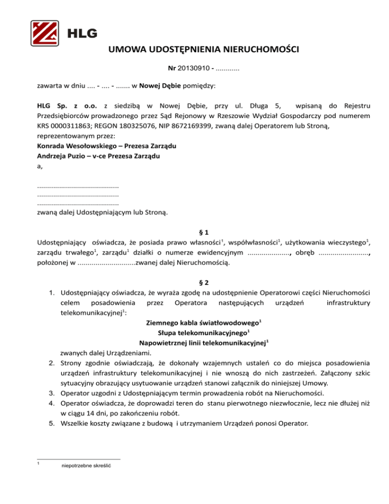UMOWA UDOSTĘPNIENIA NIERUCHOMOŚCI Nr 20130910 - ............ zawarta w dniu .... - .... - ....... w Nowej Dębie pomiędzy: HLG Sp. z o.o. z siedzibą w Nowej Dębie, przy ul. Długa 5, wpisaną do Rejestru Przedsiębiorców prowadzonego przez Sąd Rejonowy w Rzeszowie Wydział Gospodarczy pod numerem KRS 0000311863; REGON 180325076, NIP 8672169399, zwaną dalej Operatorem lub Stroną, reprezentowanym przez: Konrada Wesołowskiego – Prezesa Zarządu Andrzeja Puzio – v-ce Prezesa Zarządu a, ......................................... ......................................... ......................................... zwaną dalej Udostępniającym lub Stroną. §1 Udostępniający oświadcza, że posiada prawo własności 1, współwłasności1, użytkowania wieczystego1, zarządu trwałego1, zarządu1 działki o numerze ewidencyjnym ....................., obręb ........................., położonej w .............................zwanej dalej Nieruchomością. 1. 2. 3. 4. 5. 1 §2 Udostępniający oświadcza, że wyraża zgodę na udostępnienie Operatorowi części Nieruchomości celem posadowienia przez Operatora następujących urządzeń infrastruktury 1 telekomunikacyjnej : Ziemnego kabla światłowodowego1 Słupa telekomunikacyjnego1 Napowietrznej linii telekomunikacyjnej1 zwanych dalej Urządzeniami. Strony zgodnie oświadczają, że dokonały wzajemnych ustaleń co do miejsca posadowienia urządzeń infrastruktury telekomunikacyjnej i nie wnoszą do nich zastrzeżeń. Załączony szkic sytuacyjny obrazujący usytuowanie urządzeń stanowi załącznik do niniejszej Umowy. Operator uzgodni z Udostępniającym termin prowadzenia robót na Nieruchomości. Operator oświadcza, że doprowadzi teren do stanu pierwotnego niezwłocznie, lecz nie dłużej niż w ciągu 14 dni, po zakończeniu robót. Wszelkie koszty związane z budową i utrzymaniem Urządzeń ponosi Operator. niepotrzebne skreślić 1. 2. 3. 4. 5. §3 Udostępniający zobowiązuje się udostępnić przedstawicielowi Operatora każdorazowo wstęp na teren Nieruchomości celem przeprowadzenia planowych konserwacji, napraw, modernizacji lub wymiany Urządzeń. Za wynikłe z tych czynności ewentualne szkody każdorazowo będzie wypłacane odszkodowanie. Zakres szkód zostanie ustalony w protokole podpisanym przez Strony. Protokół ten stanowić będzie podstawę do ustalenia wysokości odszkodowania. W przypadku sporu co do wysokości odszkodowania lub zakresu nie usuniętych szkód, wysokość odszkodowania określi niezależny rzeczoznawca majątkowy. Koszt ekspertyzy rzeczoznawcy majątkowego ponosi Operator. Termin prac, o których mowa w ust. 1 zostanie uzgodniony z Udostępniającym, przy czym usuwanie awarii może odbywać się bez wcześniejszego powiadomienia. §4 1. Niniejsza Umowa obowiązuje na czas pozostawania Urządzeń Operatora na Nieruchomości i wiąże również następców prawnych Stron Umowy. 2. Udostępniający zobowiązuje się w przypadku przeniesienia prawa do Nieruchomości poinformować nabywcę o treści niniejszej Umowy. 3. Niniejsza Umowa wyczerpuje wszelkie roszczenia Udostępniającego względem Operatora z tytułu posadowienia Urządzeń na Nieruchomości. §5 1. Strony Umowy stwierdzają, że niniejsza umowa jest zawarta, między innymi, w celu wykazania się przez Operatora prawem do dysponowania nieruchomością na cele budowlane zgodnie z art. 32 ust. 4 pkt. 2 Ustawy – Prawo budowlane z dnia 7 lipca 1994r., jedynie w zakresie wynikającym z § 2 niniejszej Umowy i zgodnie z przedstawionym Udostępniającemu szkicem sytuacyjnym. 2. W sprawach nieuregulowanych niniejszą Umową mają zastosowanie przepisy Kodeksu Cywilnego, Ustawy Prawo telekomunikacyjne z dnia 16 lipca 2004r. Dz. U. Nr 171, poz. 1800 z póź. zm. oraz Ustawy o wspieraniu rozwoju usług i sieci telekomunikacyjnych z dnia 7 maja 2010 r. – Dz.U. nr 106 poz. 675. §6 Umowę sporządzono w trzech jednobrzmiących egzemplarzach, z czego jeden dla Udostępniającego, a dwa dla Operatora. §7 Integralną część niniejszej umowy stanowią następujące załączniki1: 1) Szkic sytuacyjny. 2) Wypis z rejestru gruntów Udostępniający Operator ………………………………………….. ………………………………………….. Czytelny podpis Czytelny podpis