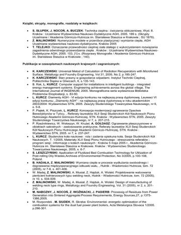 Książki, skrypty, monografie, rozdziały w książkach: S. SŁUPEK, J. NOCOŃ, A. BUCZEK: Technika cieplna : ćwiczenia obliczeniowe, Wyd. 8. Kraków : Uczelniane Wydawnictwa Naukowo-Dydaktyczne AGH, 2005. 189 s. (Skrypty Uczelniane / Akademia Górniczo-Hutnicza im. Stanisława Staszica w Krakowie ; SU 1676). Z. MALINOWSKI: Numeryczne modele w przeróbce plastycznej i wymianie ciepła, AGH Uczelniane wydawnictwa naukowo-dydaktyczne, Kraków 2005 T. TELEJKO: Oznaczanie przewodności cieplnej ciała stałego z wykorzystaniem rozwiązania zagadnienia odwrotnego przewodzenia ciepła . Kraków : Uczelniane Wydawnictwa NaukowoDydaktyczne AGH, 2005. 153, [1] s. (Rozprawy Monografie / Akademia Górniczo-Hutnicza im. Stanisława Staszica w Krakowie ; 140). Publikacje w czasopismach naukowych krajowych i zagranicznych: K. KARCZEWSKI: Universal Metod of Calculation of Radiotion Recuperators with Microfuned Surface. Metallurgy and Foundry Engineering, Vol 31, 2005, No 2, p.185-247. K. KARCZEWSKI: Stan prawny w gospodarce odpadami. Instytut Techniki Cieplnej, Politechnika Śląska w Gliwicach, 6, s.135-143. B. Rak, L. KURCZ: Computer support for installations in intelligent buildings - integrated energy management systems. Engineering achievements across the global village, The International Journal of INGENIUM, 2005. Monograficzna seria wydawnicza Biblioteka Problemów Eksploatacji, s. 83-90. L. KURCZ: Diamenty AGH - VI edycja konkursu na najlepszą pracę dyplomową. Laureaci VI edycji konkursu ,,Diamenty AGH'' : na najlepszą pracę dyplomową w roku akademickim 2003/2004: Wydawnictwo STN, 2005. Zeszyty Studenckiego Towarzystwa Naukowego, nr 6, s. 5-8. P. Piątek, K. Piszczek, L. KURCZ: Koncepcja modernizacji ogrzewania Opactwa Benedyktynów w Tyńcu. , Referaty laureatów XLII Sesji Studenckich Kół Naukowych Pionu Hutniczego Akademii Górniczo-Hutniczej, STN. Kraków : Wydawnictwo STN, 2005. Zeszyty Studenckiego Towarzystwa Naukowego, nr 7, s. 207-215. P. Rzeźnikiewicz, W. Wołoszyn, W. Krużel, A. GOŁDASZ: Ogrzewanie płaszczyznowe w obiektach sakralnych - zastosowanie praktyczne, Referaty laureatów XLII Sesji Studenckich Kół Naukowych Pionu Hutniczego Akademii Górniczo-Hutniczej, STN. Kraków : Wydawnictwo STN, 2005. nr 7, s. 237-247. L. KURCZ: Studenckie koła naukowe : rola i zadania opiekuna koła. Sesje Studenckich Kół Naukowych. T. 1/2005, Materiały XLII Sesji Pionu Hutniczego : streszczenia referatów ; program sesji ; informacje o kołach naukowych : Kraków 5 maja 2005 r., Akademia GórniczoHutnicza im. Stanisława Staszica w Krakowie. Kraków : Wydawnictwo Studenckiego Towarzystwa Naukowego, 2005, s. 6-7. S. LESZCZYŃSKI: Application of Fluidized Bed Combustion Technology for Utilization of Post-rolling Oily Wastes,Archives of Environmental Protection, No 3/2005, p.100-108, Poland. B. HADAŁA, Z. MALINOWSKI: Wymiana ciepła w procesie wydłużania swobodnego i dogrzewania międzyoperacyjnego odkuwki wału, , Hutnik - Wiadomości Hutnicze, tom. 72 (2005), nr 7-8, s. 401-406. W. Madej, Z. MALINOWSKI, A. Musiał, Z. Hajduk, A. Wolski: Projektowanie walcowania pierścieni kołnierzowych typu welding neck, Hutnik - Wiadomości Hutnicze, tom. 72 (2005), nr 10, s. 504-509. Z. MALINOWSKI, W. Madej, A. Musiał, Z. Hajduk, A. Wolski: Design of manufacturing of welding neck type rings, Metallurgy and Foundry Engineering, Vol. 31 (2005), nr 2, s. 201210. M. NABOZNY, J. NOCOŃ, Z. WOŹNIACKI, J. PASIERB: Processig of Residues from Power Generation into Sintered Aggregate:Process Requirements, Energy Sources,27, p.13751386,2005. M. Rozpondek , M. SIUDEK, R. Skraba: Environmental- energetic optimisation of the combustion systems for the dual fuel power plant boilers, Acta Metalurgica Slovaca 1/2005. p.296-301. M. Rozpondek, M. SIUDEK, R. Skraba, K. Wacławiak: Application of the coal and biomass co-firing in the ceramics furnaces, , Acta Metalurgica Slovaca 1/2005, p.302-308. S. SŁUPEK, M. Poskart, L. Szecówka: Obniżanie stężenia tlenków azotu i tlenku węgla w płomieniu gazu ziemnego metodami pierwotnymi, Hutnik -Wiadomości Hutnicze nr 4, 2005 str.212. J. Iwanciw, Z. KALICKA, E. KAWECKA-CEBULA, K. PYTEL: Determination of the surface tension for binary ionic solutions by means of Butler model , Metallurgy & Foundry Engineering, vol.31 (2005), s.75-86. Publikacje w materiałach konferencji naukowych krajowych i zagranicznych: E. KAWECKA-CEBULA, Z. KALICKA: Analiza teoretyczna adhezji wtrąceń niemetalicznych w stali na powierzchniach ceramicznych, , XV International Scientific Conference Iron and Steelmaking, Malenovice-Frydlant nad Ostravici,14-16.09.2005, Czechy, Materiały Konferencyjne, str.110-113. A. GOŁDASZ, Z. MALINOWSKI: Analiza pola temperatury w czasie krzepnięcia i stygnięcia wlewka kuźniczego, KomPlasTech 2005, Informatyka w technologii metali, Materiały XII konferencji, Ustroń 16-19 stycznia 2005, eds. A.Piela, J. Lisok, F. Grosman. Kraków , Wydawnictwo Naukowe Akapit, 2005, s. 81-89. M. Rozpondek, R. Skraba, M. SIUDEK: Analiza pracy cieplnej dwupaliwowych kotłów OPG230. Gospodarka cieplna i eksploatacja pieców przemysłowych: XII ogólnopolska konferencja naukowo-techniczna : Poraj k. Częstochowy 29-30. 09. 2005, s. 187-193. M. Rozpondek, R. Skraba, M. SIUDEK: Analiza skuteczności odpylania hutniczych paliw odpadowych, XII Ogólnopolska Konferencja Naukowo-Techniczna pt.: Gospodarka Cieplna i Eksploatacja Pieców Przemysłowych - Poraj k. Częstochowy, 29-30.09.2005, s. 179 - 185. A. BUCZEK, T. TELEJKO: Determination of heat transfer coefficient and thermal conductivity using the solution of inverse heat conduction problem, Advanced technology of plasticity 2005 : proceedings of the 8th international conference on Technology of plasticity : Verona, October 9-13, 2005, ed. P. F. Bariani. Italy : Edizioni Progetto Padova, 2005. s. 285286. S. LESZCZYŃSKI: Energetyczne wykorzystanie kompostu, Seminarium naukowo techniczne Zintegrowana gospodarka strumienia