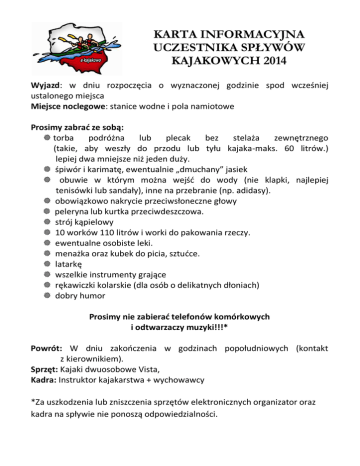 KARTA INFORMACYJNA UCZESTNIKA SPŁYWÓW KAJAKOWYCH 2014 Wyjazd: w dniu rozpoczęcia o wyznaczonej godzinie spod wcześniej ustalonego miejsca Miejsce noclegowe: stanice wodne i pola namiotowe Prosimy zabrać ze sobą: torba podróżna lub plecak bez stelaża zewnętrznego (takie, aby weszły do przodu lub tyłu kajaka-maks. 60 litrów.) lepiej dwa mniejsze niż jeden duży. śpiwór i karimatę, ewentualnie „dmuchany” jasiek obuwie w którym można wejść do wody (nie klapki, najlepiej tenisówki lub sandały), inne na przebranie (np. adidasy). obowiązkowo nakrycie przeciwsłoneczne głowy peleryna lub kurtka przeciwdeszczowa. strój kąpielowy 10 worków 110 litrów i worki do pakowania rzeczy. ewentualne osobiste leki. menażka oraz kubek do picia, sztućce. latarkę wszelkie instrumenty grające rękawiczki kolarskie (dla osób o delikatnych dłoniach) dobry humor Prosimy nie zabierać telefonów komórkowych i odtwarzaczy muzyki!!!* Powrót: W dniu zakończenia w godzinach popołudniowych (kontakt z kierownikiem). Sprzęt: Kajaki dwuosobowe Vista, Kadra: Instruktor kajakarstwa + wychowawcy *Za uszkodzenia lub zniszczenia sprzętów elektronicznych organizator oraz kadra na spływie nie ponoszą odpowiedzialności.