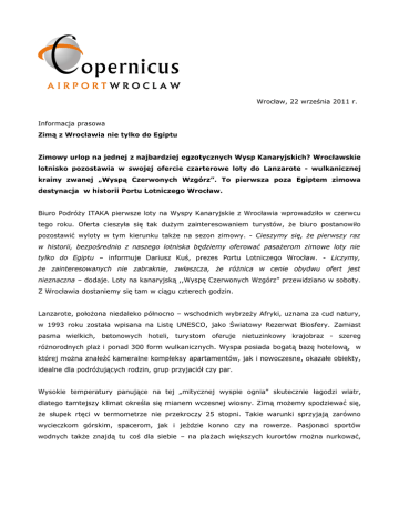 Wrocław, 22 września 2011 r. Informacja prasowa Zimą z Wrocławia nie tylko do Egiptu Zimowy urlop na jednej z najbardziej egzotycznych Wysp Kanaryjskich? Wrocławskie lotnisko pozostawia w swojej ofercie czarterowe loty do Lanzarote - wulkanicznej krainy zwanej „Wyspą Czerwonych Wzgórz”. To pierwsza poza Egiptem zimowa destynacja w historii Portu Lotniczego Wrocław. Biuro Podróży ITAKA pierwsze loty na Wyspy Kanaryjskie z Wrocławia wprowadziło w czerwcu tego roku. Oferta cieszyła się tak dużym zainteresowaniem turystów, że biuro postanowiło pozostawić wyloty w tym kierunku także na sezon zimowy. - Cieszymy się, że pierwszy raz w historii, bezpośrednio z naszego lotniska będziemy oferować pasażerom zimowe loty nie tylko do Egiptu – informuje Dariusz Kuś, prezes Portu Lotniczego Wrocław. - Liczymy, że zainteresowanych nie zabraknie, zwłaszcza, że różnica w cenie obydwu ofert jest nieznaczna – dodaje. Loty na kanaryjską ,,Wyspę Czerwonych Wzgórz” przewidziano w soboty. Z Wrocławia dostaniemy się tam w ciągu czterech godzin. Lanzarote, położona niedaleko północno – wschodnich wybrzeży Afryki, uznana za cud natury, w 1993 roku została wpisana na Listę UNESCO, jako Światowy Rezerwat Biosfery. Zamiast pasma wielkich, betonowych hoteli, turystom oferuje nietuzinkowy krajobraz - szereg różnorodnych plaż i ponad 300 form wulkanicznych. Wyspa posiada bogatą bazę hotelową, w której można znaleźć kameralne kompleksy apartamentów, jak i nowoczesne, okazałe obiekty, idealne dla podróżujących rodzin, grup przyjaciół czy par. Wysokie temperatury panujące na tej „mitycznej wyspie ognia” skutecznie łagodzi wiatr, dlatego tamtejszy klimat określa się mianem wczesnej wiosny. Zimą możemy spodziewać się, że słupek rtęci w termometrze nie przekroczy 25 stopni. Takie warunki sprzyjają zarówno wycieczkom górskim, spacerom, jak i jeździe konno czy na rowerze. Pasjonaci sportów wodnych także znajdą tu coś dla siebie – na plażach większych kurortów można nurkować, korzystać ze sprzętu do windsurfingu, żeglarstwa czy nart wodnych. Także zimą bogata infrastruktura sportowa większości obiektów gwarantuje szereg atrakcji fanom aktywnego wypoczynku. Więcej informacji Port Lotniczy im. Mikołaja Kopernika we Wrocławiu położony jest w południowo-zachodniej części Wrocławia, w odległości ok. 10 km od centrum miasta, w pobliżu Autostradowej Obwodnicy Wrocławia, która umożliwia bezpośredni dojazd na lotnisko z autostrady A4, z kierunku Kłodzko-Praga, Świdnica-Wałbrzych, a także od Poznania - z drogi krajowej nr 5 oraz z Warszawy przez łącznik Długołęka. Dynamiczny rozwój ruchu lotniczego port notuje od 2003 roku. W ciągu 5 lat liczba pasażerów wzrosła pięciokrotnie. Na jego terenie funkcjonuje baza operacyjna tanich linii lotniczych Wizz Air. Oferuje regularne połączenia lotnicze, m.in. z Paryżem, Mediolanem, Brukselą i Oslo. W roku 2011 Port Lotniczy Wrocław powiększy się o nowy terminal. Przepustowość wyniesie wtedy ponad 3 mln pasażerów rocznie, docelowo będzie można obsłużyć 7 mln osób. Kontakt dla mediów: Aleksandra Palus Profit Communications GSM + 48 509 065 [email protected]
