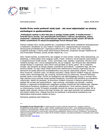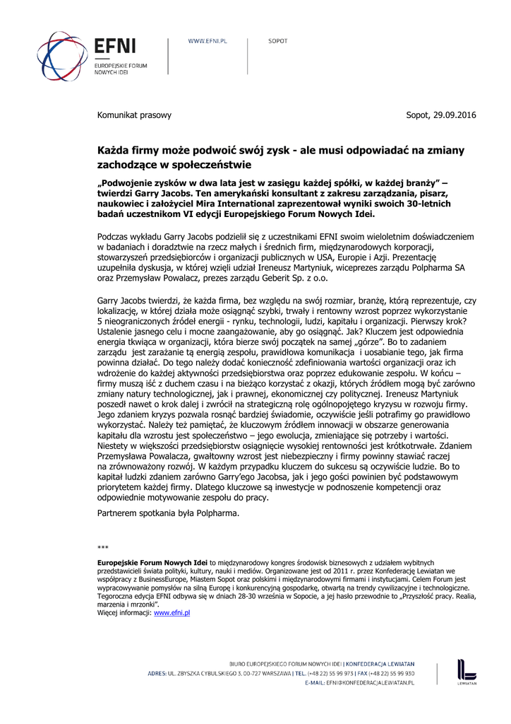 Komunikat prasowy Sopot, 29.09.2016 Każda firmy może podwoić swój zysk - ale musi odpowiadać na zmiany zachodzące w społeczeństwie „Podwojenie zysków w dwa lata jest w zasięgu każdej spółki, w każdej branży” – twierdzi Garry Jacobs. Ten amerykański konsultant z zakresu zarządzania, pisarz, naukowiec i założyciel Mira International zaprezentował wyniki swoich 30-letnich badań uczestnikom VI edycji Europejskiego Forum Nowych Idei. Podczas wykładu Garry Jacobs podzielił się z uczestnikami EFNI swoim wieloletnim doświadczeniem w badaniach i doradztwie na rzecz małych i średnich firm, międzynarodowych korporacji, stowarzyszeń przedsiębiorców i organizacji publicznych w USA, Europie i Azji. Prezentację uzupełniła dyskusja, w której wzięli udział Ireneusz Martyniuk, wiceprezes zarządu Polpharma SA oraz Przemysław Powalacz, prezes zarządu Geberit Sp. z o.o. Garry Jacobs twierdzi, że każda firma, bez względu na swój rozmiar, branżę, którą reprezentuje, czy lokalizację, w której działa może osiągnąć szybki, trwały i rentowny wzrost poprzez wykorzystanie 5 nieograniczonych źródeł energii - rynku, technologii, ludzi, kapitału i organizacji. Pierwszy krok? Ustalenie jasnego celu i mocne zaangażowanie, aby go osiągnąć. Jak? Kluczem jest odpowiednia energia tkwiąca w organizacji, która bierze swój początek na samej „górze”. Bo to zadaniem zarządu jest zarażanie tą energią zespołu, prawidłowa komunikacja i uosabianie tego, jak firma powinna działać. Do tego należy dodać konieczność zdefiniowania wartości organizacji oraz ich wdrożenie do każdej aktywności przedsiębiorstwa oraz poprzez edukowanie zespołu. W końcu – firmy muszą iść z duchem czasu i na bieżąco korzystać z okazji, których źródłem mogą być zarówno zmiany natury technologicznej, jak i prawnej, ekonomicznej czy politycznej. Ireneusz Martyniuk poszedł nawet o krok dalej i zwrócił na strategiczną rolę ogólnopojętego kryzysu w rozwoju firmy. Jego zdaniem kryzys pozwala rosnąć bardziej świadomie, oczywiście jeśli potrafimy go prawidłowo wykorzystać. Należy też pamiętać, że kluczowym źródłem innowacji w obszarze generowania kapitału dla wzrostu jest społeczeństwo – jego ewolucja, zmieniające się potrzeby i wartości. Niestety w większości przedsiębiorstw osiągnięcie wysokiej rentowności jest krótkotrwałe. Zdaniem Przemysława Powalacza, gwałtowny wzrost jest niebezpieczny i firmy powinny stawiać raczej na zrównoważony rozwój. W każdym przypadku kluczem do sukcesu są oczywiście ludzie. Bo to kapitał ludzki zdaniem zarówno Garry’ego Jacobsa, jak i jego gości powinien być podstawowym priorytetem każdej firmy. Dlatego kluczowe są inwestycje w podnoszenie kompetencji oraz odpowiednie motywowanie zespołu do pracy. Partnerem spotkania była Polpharma. *** Europejskie Forum Nowych Idei to międzynarodowy kongres środowisk biznesowych z udziałem wybitnych przedstawicieli świata polityki, kultury, nauki i mediów. Organizowane jest od 2011 r. przez Konfederację Lewiatan we współpracy z BusinessEurope, Miastem Sopot oraz polskimi i międzynarodowymi firmami i instytucjami. Celem Forum jest wypracowywanie pomysłów na silną Europę i konkurencyjną gospodarkę, otwartą na trendy cywilizacyjne i technologiczne. Tegoroczna edycja EFNI odbywa się w dniach 28-30 września w Sopocie, a jej hasło przewodnie to „Przyszłość pracy. Realia, marzenia i mrzonki”. Więcej informacji: www.efni.pl Patronat honorowy Partnerzy instytucjonalni Strategiczni partnerzy medialni Partner Gali otwarcia Partner Gali zamknięcia Partnerzy główni Partnerzy wspierający Partnerzy merytoryczni Producent wykonawczy Dodatkowe informacje: Zbigniew Maciąg [email protected] tel.: +48 604 589 080 Parlament Europejski Grupa Pracodawców EKES, Przedstawicielstwo Komisji Europejskiej w Polsce, Rada Dialogu Społecznego „Dziennik Gazeta Prawna”, Grupa Onet.pl Bank Pekao S.A. MetLife BMW Group, Citi Handlowy, „Do Rzeczy”, Fiat Chrysler Automobiles, „Forbes”, France 24, Intel, „Newsweek”, Orange Polska, „Parkiet”, POLITICO, Polskie Forum HR, Radio ZET, Związek Pracodawców Technologii Cyfrowych Lewiatan AMS, „Bloomberg Businessweek Polska”, „Gazeta Wyborcza”, Havas Media Group, IKEA, „Liberté!”, LINKLEADERS, „My Company Polska”, Polska Agencja Prasowa, „Puls Biznesu”, Quatro Por Quatro, Rada Firm Rodzinnych Konfederacji Lewiatan, Radio TOK FM, „Warsaw Business Journal Observer”, Związek Pracodawców Motoryzacji i Artykułów Przemysłowych Centrum Stosunków Międzynarodowych, European Council on Foreign Relations, Polityka Insight, Ośrodek THINKTANK, Global Compact Poland, Światowa Akademia Sztuki i Nauki Agencja IDFX