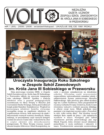 VOLT NIEZALEŻNA GAZETA UCZNIÓW ZESPOŁU SZKÓŁ ZAWODOWYCH IM. KRÓLA JANA III SOBIESKIEGO W PRZEWORSKU NR 1 (65) - 2008 / 2008 - wrzesień/listopad - UKAZUJE SIĘ OD 1991 ROKU Uroczysta Inauguracja Roku Szkolnego w Zespole Szkół Zawodowych im. Króla Jana III Sobieskiego w Przeworsku Dnia pierwszego września 2008r. w Zespole Szkół Zawodowych im. Króla Jana III Sobieskiego w Przeworsku odbyła się uroczysta inauguracja roku szkolnego 2008/09. Zgodnie z tradycją młodzież wraz z gronem pedagogicznym uczestniczyła we Mszy Świętej w Bazylice pod wezwaniem Ducha Świętego, której przewodniczył ksiądz prałat Stanisław Szałankiewicz. Wygłosił on poruszającą młodzież homilię zwracając szczególną uwagę na zagubienie młodzieży we współczesnym świecie, brak motywacji do nauki i lekceważenie ważnych wartości moralnych. Mamy nadzieję, że przynajmniej część naszych kolegów weźmie do serca te ważne rady i wskazówki by choć w części zmienić swe dotychczasowe postępowanie. Po Mszy Świętej wszyscy ruszyli ulicami księdza Ablewicza i Marii Konopnickiej, na czele z pocztem sztandarowym na dziedziniec s z k o l n y. O f i c j a l n ą c z ę ś ć u r o c z y s t o ś c i rozpoczęliśmy wprowadzeniem sztandaru szkoły i odśpiewaniem hymnu państwowego Mazurka Dąbrowskiego. Jako pierwszy głos zabrał dyrektor mgr inż. Lesław Ścisłowicz, który przypomniał 69 rocznicę wybuchu II wojny światowej, kiedy to nasi rówieśnicy walczyli o wolność ojczyzny składając w ofierze swoje życie. Młode pokolenie musi pamiętać o tej tragicznej rocznicy gdyż „Przeszłość to dziś, tylko trochę dalej”, Pan dyrektor życzył młodym dużo zapału do pracy i jak najlepszych wyników w nauce. Następnie głos zabrał wicestarosta powiatu przeworskiego pan mgr Marek Frączek, który również życzył młodzieży pomyślności w życiu osobistym i sukcesów w nauce. Przedstawiciele samorządu uczniowskiego 2 VOLT - NR 1 - 2008/2009 - wrzesień/listopad wręczyli zaproszonym gościom panu staroście, przewodniczącemu Rady Rodziców panu Zygmuntowi Nadbereżnemu oraz dyrektorowi szkoły wiązanki kwiatów. W dalszej części uroczystości byliśmy świadkami ślubowania i przyjęcia w poczet uczniów naszej szkoły pierwszoklasistów. Po części oficjalnej udaliśmy się do swoich klas na spotkanie z wychowawcami, by wraz z nimi podzielić się wrażeniami z wakacji. Nowy rok szkolny rozpoczął się, a wraz z nim nauka. Dzięki niemałym wysiłkom i staraniom naszej dyrekcji wracamy do odnowionej i wyremontowanej szkoły. Podczas wakacyjnej przerwy zostały zakończone remonty ostatnich sal nr.13, 14, 21 i 22. wszystkie pracownie zostały wyposażone w nowoczesne pomoce naukowe min. mapy, tablice, telewizory plazmowe. Sale pomalowano na odpowiednie kolory pomocne do odprężenia się, relaksu i odpowiedniego nastawienia do nauki. W klasach znajdują się nowe stoliki i krzesełka wykładziny. W takim otoczeniu na pewno łatwiej będzie nam zdobywać wiedzę i kształtować swoje charaktery. Pan dyrektor prosił, by nie niszczyć sprzętu, szanować dobro społeczne, a uczniowie z pewnością nie zmarnują tej szansy. Dzień pierwszego września był również okazją do spotkanie z przyjaciółmi, aby podzielić się swoimi przeżyciami z wakacji i snuć plany na przyszłość. Kokoszka Bartosz kl. II LO „a” PIELGRZYMKA MATURZYSTÓW 2008 W sobotę 4.10.2008 roku maturzyści z Zespołu Szkół Zawodowych z Przeworska wraz z dyrektorem szkoły, katechetami oraz wychowawcami wzięli udział w Pielgrzymce Maturzystów Archidiecezji Przemyskiej na Jasną Górę. O godzinie 3.30 spod Miejskiego Domu Kultury w Przeworsku ruszyły autokary z pielgrzymami. W programie pielgrzymki znalazł się obóz w Oświęcimiu do którego dotarliśmy około godziny 8 rano. Na bramie obozu widniał napis :„Praca czyni w o l n y m ”. Z pełnym podziwem wsłuchiwaliśmy się w opowiadania przewodnika który przedstawił nam losy obozu. Szczególnie wstrząsającym miejscem był widok rzeczy zgładzonych więźniów: warkocze, okulary, walizki. Następnie udaliśmy się do obozu koncentracyjnego Auschwitz II (Birkenau), na terenie wsi Brzezinka-w odległości 3 km od Oświęcimia. Tam mogliśmy się przekonać w jakich warunkach żyli więźniowie. Potem udaliśmy się na Jasna Górę. Tam uczestniczyliśmy między innymi w Drodze Krzyżowej na wałach jasnogórskich. Mimo deszczowej pogody młodzież chętnie brała w niej udział. Następnie została odprawiona Msza święta. Na zakończenie o godzinie 21 odbył się Apel Jasnogórski. Podczas Apelu dziękowaliśmy za udział w pielgrzymce oraz modliliśmy się o pomyślne zdanie matury. I tak pożegnaliśmy się z Częstochowa by powrócić do domów. Wyjazd do Częstochowy okazał się ogromnym przeżyciem, który na długo pozostanie w naszej pamięci. Anna Sierpińska VOLT - NR 1 - 2008/2009 - wrzesień/listopad 3 Turniej Szachowy w Zespole Szkół Zawodowych w Przeworsku W dniu 16 września 2008 r. na hali sportowej przy Zespole Szkół Zawodowych w Przeworsku odbył się wewnątrzszkolny Turniej Szachowy, zorganizowany przez nauczyciela WF Grzegorza Pałczyńskiego z ZSZ w Przeworsku. Wcześniej Turniej został szeroko rozreklamowany wśród młodzieży szkoły m.in. przez plakaty, radiowęzeł szkolny oraz powiadomienie uczniów przez nauczycieli na zajęciach wychowania fizycznego. Turniej miał na celu wychowanie poprzez sport, propagowanie dyscypliny szachowej, poznanie przepisów szachowych, zachęcenie młodzieży do gryw szachy. Turniej miał też na celu wyłowienie reprezentacji Powiatowej do Licealiady Szachowej, która odbędzie się w połowie października. Zespół Szkół Zawodowych reprezentować będą: M. Szular, S. Ćwioro, Ł. Zając oraz M. Zwolak. W turnieju wzięła udział liczna grupa młodzieży, grano systemem: każdy z każdym. W wyniku zaciętej rywalizacji wśród chłopców I 