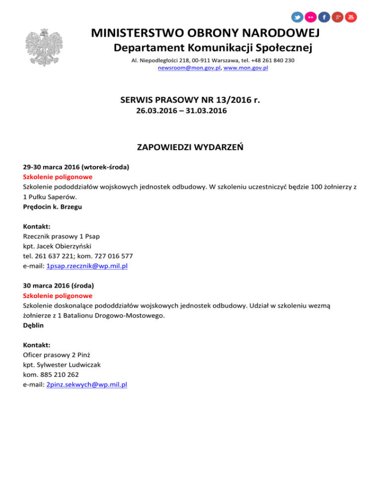 MINISTERSTWO OBRONY NARODOWEJ Departament Komunikacji Społecznej Al. Niepodległości 218, 00-911 Warszawa, tel. +48 261 840 230 [email protected], www.mon.gov.pl SERWIS PRASOWY NR 13/2016 r. 26.03.2016 – 31.03.2016 ZAPOWIEDZI WYDARZEŃ 29-30 marca 2016 (wtorek-środa) Szkolenie poligonowe Szkolenie pododdziałów wojskowych jednostek odbudowy. W szkoleniu uczestniczyć będzie 100 żołnierzy z 1 Pułku Saperów. Prędocin k. Brzegu Kontakt: Rzecznik prasowy 1 Psap kpt. Jacek Obierzyński tel. 261 637 221; kom. 727 016 577 e-mail: [email protected] 30 marca 2016 (środa) Szkolenie poligonowe Szkolenie doskonalące pododdziałów wojskowych jednostek odbudowy. Udział w szkoleniu wezmą żołnierze z 1 Batalionu Drogowo-Mostowego. Dęblin Kontakt: Oficer prasowy 2 Pinż kpt. Sylwester Ludwiczak kom. 885 210 262 e-mail: [email protected] KRONIKA 18 marca 2016 (piątek) Amerykańscy senatorzy w Polsce Ocena zagrożeń związanych z polityką Federacji Rosyjskiej, wymiana poglądów w zakresie Szczytu NATO, współpraca wywiadowcza oraz zagadnienia cyberbezpieczeństwa były głównymi tematami rozmowy ministra Antoniego Macierewicza z grupą amerykańskich senatorów z Komisji ds. wywiadu. Przewodniczący Komisji Richard M. Burr wraz z czterema członkami gościli z wizytą w Warszawie 18 marca br. Więcej... 18 marca 2016 (piątek) Minister Spraw Zagranicznych Sudanu z wizytą w Polsce W piątek 18 marca 2016 r. wiceminister Tomasz Szatkowski spotkał się z Ibrahimem Ahmed Abdelaziz Ghandour, ministrem spraw zagranicznych Republiki Sudanu. Więcej... 19 marca 2016 (sobota) Minister obrony narodowej na ćwiczeniach organizacji proobronnych Obrona terytorialna jest i będzie pełnoprawną częścią armii polskiej – powiedział minister obrony narodowej Antoni Macierewicz podczas pobytu na ćwiczeniach organizacji proobronnych w Mińsku Mazowieckim. Więcej... 21 marca 2016 (poniedziałek) Odprawa attaché obrony W poniedziałek minister obrony narodowej Antoni Macierewicz spotkał się z uczestnikami XII odprawy attaché obrony, która w dniach 21–25 marca odbywa się w Warszawie. Więcej... 22 marca 2016 (wtorek) Spotkanie szefa MON z ambasadorem Republiki Włoskiej Minister obrony narodowej Antoni Macierewicz spotkał się 22 marca br. z ambasadorem Republiki Włoskiej, JE Alessandro De Pedysem. Więcej... 22 marca 2016 (wtorek) Świąteczne spotkanie z żołnierzami Rodzinie żandarmskiej z okazji zbliżających się świąt Wielkiej Nocy życzę wszystkiego najlepszego. W te szczególne dni życzę pokoju, spokoju i rodzinnego szczęścia – powiedział podczas świątecznego spotkania z żołnierzami minister obrony narodowej Antoni Macierewicz. Więcej... 22 marca 2016 (wtorek) Specustawa dotycząca szczytu NATO podpisana W poniedziałek, 21 marca, prezydent Andrzej Duda podpisał ustawę o szczególnych rozwiązaniach związanych z organizacją Szczytu NATO, zgodnie z którą zamówienie na dostawy, usługi i roboty budowalne w związku z zaplanowanym na lipiec szczytem NATO w Warszawie będą wyłączone spod Prawa zamówień publicznych, przy zachowaniu podstawowych standardów. Więcej... 22 marca 2016 (wtorek) Spotkanie wiceministra ze związkami zawodowymi We wtorek podsekretarz stanu w MON Bartłomiej Grabski spotkał się z przedstawicielami czterech związków zawodowych (ZZ Poligrafów, NSZZ Zawodowego ,,Solidarność” – 80, ZZ Militaria, ZPW TARCZA) reprezentujących pracowników cywilnych resortu obrony narodowej. Więcej... 23 marca 2016 (środa) Ambasadorowie na spotkaniu u szefa MON Minister obrony narodowej Antoni Macierewicz spotkał się w środę w siedzibie MON z ambasadorami Węgier, Bułgarii, Czech, Estonii, Litwy, Łotwy, Rumunii i Słowacji. Więcej... 23 marca 2016 (środa) Rozmowa ministra Antoniego Macierewicza z hiszpańskim ambasadorem Przygotowania do szczytu NATO, zamachy w Brukseli i kryzys migracyjny były głównymi tematami rozmowy ministra obrony narodowej Antoniego Macierewicza z ambasadorem Królestwa Hiszpanii JE Augustinem Nunezem Martinezem. Więcej... 23 marca 2016 (środa) Karabinki reprezentacyjne dla jednostek reprezentacyjnych WP W środę, w siedzibie „Łucznika” w Radomiu, podpisano umowę pomiędzy Inspektoratem Uzbrojenia a Fabryką Broni „Łucznik” – Radom Sp. z o.o. Więcej... 23 marca 2016 (środa) Szef MON na spotkaniu dotyczącym polityki historycznej Polityka historyczna to mówienie prawdy o własnej historii - w wypadku Polski - niestety tak długo prawdy ukrywanej – powiedział minister obrony narodowej Antoni Macierewicz podczas spotkania z młodzieżą i Żołnierzami Wyklętymi oraz ich rodzinami. Więcej... 23 marca 2016 (środa) Minister Antoni Macierewicz o przygotowaniach do szczytu NATO Zaledwie 107 dni dzieli nas od szczytu NATO. Tutaj na tym stadionie spotkają się wszyscy najważniejsi przywódcy świata zachodniego, spotkają się przywódcy Paktu Północnoatlantyckiego, by podjąć decyzje dotyczące naszego wspólnego bezpieczeństwa – powiedział minister obrony narodowej Antoni Macierewicz podczas spotkania z mediami. Więcej... 23 marca 2016 (środa) Solidarność z Belgami Jesteśmy wstrząśnięci, ale nie przerażeni. Cała Europa się jednoczy. Polacy są solidarni z Belgami. Nigdy nie poddamy się przemocy mówił minister obrony narodowej Antoni Macierewicz przed ambasadą Królestwa Belgii. Więcej... 23 marca 2016 (środa) Prezydent i szef MON na spotkaniu wielkanocnym z żołnierzami - Życzę Państwu spokojnych świąt, dni w domowej atmosferze, choć wiem, że niektórzy z Was będą pełnili wtedy służbę – powiedział prezydent RP Andrzej Duda podczas spotkania z żołnierzami z okazji zbliżających się świąt wielkanocnych. Więcej... 24 marca 2016 (czwartek) Nowy rektor-komendant AON-u W czwartek minister obrony narodowej Antoni Macierewicz wyznaczył podpułkownika Ryszarda Parafianowicza na stanowisko rektora – komendanta Akademii Obrony Narodowej. Wię