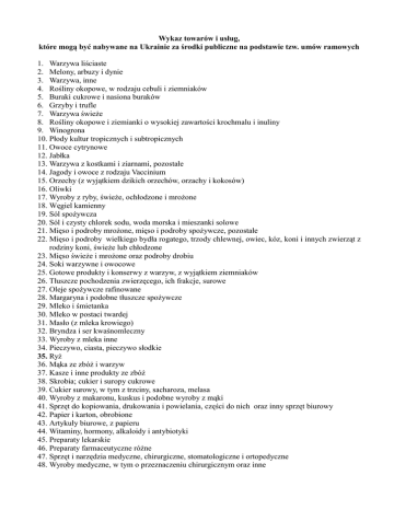 Wykaz towarów i usług, które mogą być nabywane na Ukrainie za środki publiczne na podstawie tzw. umów ramowych 1. Warzywa liściaste 2. Melony, arbuzy i dynie 3. Warzywa, inne 4. Rośliny okopowe, w rodzaju cebuli i ziemniaków 5. Buraki cukrowe i nasiona buraków 6. Grzyby i trufle 7. Warzywa świeże 8. Rośliny okopowe i ziemianki o wysokiej zawartości krochmalu i inuliny 9. Winogrona 10. Płody kultur tropicznych i subtropicznych 11. Owoce cytrynowe 12. Jabłka 13. Warzywa z kostkami i ziarnami, pozostałe 14. Jagody i owoce z rodzaju Vaccinium 15. Orzechy (z wyjątkiem dzikich orzechów, orzachy i kokosów) 16. Oliwki 17. Wyroby z ryby, świeże, ochłodzone i mrożone 18. Węgiel kamienny 19. Sól spożywcza 20. Sól i czysty chlorek sodu, woda morska i mieszanki solowe 21. Mięso i podroby mrożone, mięso i podroby spożywcze, pozostałe 22. Mięso i podroby wielkiego bydła rogatego, trzody chlewnej, owiec, kóz, koni i innych zwierząt z rodziny koni, świeże lub chłodzone 23. Mięso świeże i mrożone oraz podroby drobiu 24. Soki warzywne i owocowe 25. Gotowe produkty i konserwy z warzyw, z wyjątkiem ziemniaków 26. Tłuszcze pochodzenia zwierzęcego, ich frakcje, surowe 27. Oleje spożywcze rafinowane 28. Margaryna i podobne tłuszcze spożywcze 29. Mleko i śmietanka 30. Mleko w postaci twardej 31. Masło (z mleka krowiego) 32. Bryndza i ser kwaśnomleczny 33. Wyroby z mleka inne 34. Pieczywo, ciasta, pieczywo słodkie 35. Ryż 36. Mąka ze zbóż i warzyw 37. Kasze i inne produkty ze zbóż 38. Skrobia; cukier i suropy cukrowe 39. Cukier surowy, w tym z trzciny, sacharoza, melasa 40. Wyroby z makaronu, kuskus i podobne wyroby z mąki 41. Sprzęt do kopiowania, drukowania i powielania, części do nich oraz inny sprzęt biurowy 42. Papier i karton, obrobione 43. Artykuły biurowe, z papieru 44. Witaminy, hormony, alkaloidy i antybiotyki 45. Preparaty lekarskie 46. Preparaty farmaceutyczne różne 47. Sprzęt i narzędzia medyczne, chirurgiczne, stomatologiczne i ortopedyczne 48. Wyroby medyczne, w tym o przeznaczeniu chirurgicznym oraz inne 49. Samochody o przeznaczeniu specjalnym 50. Usługi taksówkarskie oraz usługi dzierżawy samochodów pasażerskich z kierowcą 51. Usługi miejscowej łączności telefonicznej ogólnego korzystania 52. Usługi łączności komórkowej i Internetu sieciami przewodowymi 53. Usługi sieci łączności biznesowej o dostępie zbiorczym 54. Usługi łączności telefonicznej międzymiastowej 55. Usługi w zakresie obsługi technicznej i remontu maszyn o ogólnym przeznaczeniu 56. Usługi w zakresie obsługi technicznej i remontu sprzętu komputerowego oraz innych 57. Windy i wyposażenie 58. Wyroby chemiczne fotograficzne 59. Periodyki 60. Mydło, środki do zmywania i preparaty czyszczące 61. Usługi w zakresie obsługi technicznej i remontu samochodów pasażerskich i dostawczych 62. Usługi w zakresie obsługi technicznej i remontu innych samochodów 63. Usługi w zakresie prowadzenie postępowań śledczych i zapewnienia bezpieczeństwa 64. Usługi ze sprzątania tradycyjnego oraz innego 65. Usługi w zakresie transportu lądowego międzymiejskiego i specjalnego pasażerskiego, wg rozkładu 66. Usługi w zakresie przewozu pasażerów transportem lądowym nie wg rozkładu 67. Usługi w zakresie pasażerskiego transportu powietrznego 68. Usługi w zakresie remontów bieżących 69. Lokomotywy oraz przetargi z nimi związane 70. Wagony,w tym tramwajowe oraz platformy otwarte z wyłączeniem środków transportu wykorzystywanych przy pracach remontowych oraz związanych z obsługą techniczną 71. Tabor kolejowy, inny 72. Części lokomotyw, wagonów tramwajowych oraz taboru kolejowego, łączniki i oprawy oraz ich częsci; urządzenia mechaniczne sterowania ruchem 73. Usługi w zakresie modernizacji i wyposażenia lokomotyw, wagonów tramwajowych i taboru kolejowego; podwykonawstwo przy produkcji lokomotyw i taboru kolejowego 74. Pestycydy oraz inne agrochemikalia 75. Usługi w zakresie zapewnienia wyżywienia przewidzianego w kontrakcie 76. Produkty chemiczne różne 77. Gotowe produkty spożywcze homogenizowane dla dzieci i dietetyczne 78. Paliwo płynne i gaz; smjary 79. Gaz naftowy oraz inne węglowodory gazowe z wyłączeniem gazu ziemnego 80. Źwir i piasek 81. Bitum i asfalt naturalne; asfalty 82. Wyroby mineralne niemetalowe, inne