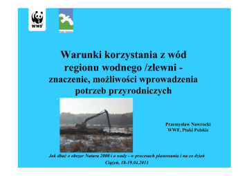 Warunki korzystania z wód regionu wodnego /zlewni znaczenie, możliwości wprowadzenia potrzeb przyrodniczych Przemysław Nawrocki WWF, Ptaki Polskie Jak dbać o obszar Natura 2000 i o wody - w procesach planowania i na co dzień Ciążeń, 18-19.04.2011 Kontekst - wymogi Ramowej Dyrektywy Wodnej: • „Program środków działania” (art. 11 RDW) – zestaw narzędzi prawnych i organizacyjnych • „Plany gospodarowania wodami w dorzeczu” (art. 13 RDW) – dokument planistyczny • Ustawa prawo wodne przez 6 lat niewłaściwie transponujące RDW, brak oceny ekologicznego stanu wód, monitoringu stanu wód, itp. • „Program wodno-środowiskowy kraju” – dokument planistyczny • „Plany gospodarowania wodami w dorzeczach” – dokument planistyczny • „ Warunki korzystania z wód regionu wodnego” – dokument planistyczny Umocowanie prawne „Warunków korzystania z wód regionu wodnego”: Art. 115 ustawy Prawo wodne 1. Warunki korzystania z wód regionu wodnego określają: 1) szczegółowe wymagania w zakresie stanu wód wynikające z ustalonych celów środowiskowych; 2) priorytety w zaspokajaniu potrzeb wodnych; 3) ograniczenia w korzystaniu z wód na obszarze regionu wodnego lub jego części albo dla wskazanych jednolitych części wód niezbędne dla osiągnięcia ustalonych celów środowiskowych, w szczególności w zakresie: a) poboru wód powierzchniowych lub podziemnych, b) wprowadzania ścieków do wód lub do ziemi, c) wprowadzania substancji szczególnie szkodliwych dla środowiska wodnego do wód, do ziemi lub do urządzeń kanalizacyjnych, d) wykonywania nowych urządzeń wodnych. Umocowanie prawne „Warunków korzystania z wód regionu wodnego”: Art. 115 ustawy Prawo wodne 2. Przy sporządzaniu warunków korzystania z wód regionu wodnego uwzględnia się: 1) ustalenia planów zagospodarowania przestrzennego; 2) ustalenia zawarte w dokumentacjach hydrogeologicznych dotyczących w szczególności ustalenia zasobów wód podziemnych oraz określenia warunków hydrogeologicznych w związku z ustanawianiem obszarów ochronnych zbiorników wód podziemnych. Znaczenie „Warunków korzystania z wód regionu wodnego”: • • „Warunki” nie są wymagane przez KE „Warunki” są najważniejszym dokumentem planistycznym dotyczącym praktyki gospodarowania wodami, gdyż: „kierując się ustaleniami Planów gospodarowania wodami, dyrektor RZGW, w drodze aktu prawa miejscowego ustali warunki korzystania z wód regionu wodnego a następnie warunki korzystania z wód zlewni. Zawiadomienie o przystąpieniu do sporządzania warunków korzystania z wód ogłoszone zostanie niezwłocznie po zatwierdzeniu planów.” • „Warunki” są b. ważnym narzędziem zarządzania zasobami wód, gdyż są nadrzędne nad pozwoleniami wodno-prawnymi (mogą stanowić podstawę cofnięcia, weryfikacji albo odmowy wydania pozwolenia wodno-prawnego) Co wiemy na temat „Warunków korzystania z wód regionu wodnego”? • Dotyczą „regionów wodnych” zarządzanych przez 7 Regionalnych Zarządów Gospodarki Wodnej – 21 regionów (dorzecze Wisły – 4; dorzecze Odry – 4, pozostałe 13 – niewielkie fragmenty zlewni, Łaby, Dunaju, Dniestry, itp.) Co wiemy na temat „Warunków korzystania z wód regionu wodnego”? • Powinny być opracowane przez poszczególne RZGW (zakładano, że do końca czerwca 2010) • Podstawa opracowania: „Metodyka opracowywania warunków korzystania z wód regionu wodnego oraz warunków korzystania z wód zlewni”, 2008r Co wiemy na temat „Warunków korzystania z wód regionu wodnego”? • „Metodyka opracowywania warunków korzystania z wód regionu wodnego oraz warunków korzystania z wód zlewni”: • • • zlecona przez RZGW Kraków opracowana przez zespół specjalistów z dziedziny hydrologii/ inżynierii wodnej silnie akcentuje kwestię tzw. bilansów wodno-gospodarczych (Opracowanie „Planów gospodarowania wodami w dorzeczach” nie było poprzedzone wykonaniem analiz bilansowych na poziomie umożliwiającym zdefiniowanie ilościowych ograniczeń w korzystaniu wód w zakresie poborów wody i zrzutu ścieków) • • nie uwzględnia transpozycji Dyrektywy Powodziowej do polskiego prawodawstwa (nie definiowano warunków i ograniczeń wynikających z DP) w niewielkim stopniu odnosi się do kwestii ekologicznego stanu wód (odwołania do celów środowiskowych dla wód ustanowionych przez „Plany gospodarowania wodami w dorzeczach” oraz „Program wodno-środowiskowy kraju” oraz zapisy dotyczące obszarów chronionej przyrody (Natura 2000, parki narodowe, krajobrazowe, itp.) Co wiemy na temat „Warunków korzystania z wód regionu wodnego”? • Dwa poziomy szczegółowości: • • • Warunki korzystania z wód regionu wodnego Warunki korzystania z wód zlewni – jeśli w wyniku ustaleń „Planu gospodarowania wodami w dorzeczu” jest konieczne określenie szczególnych zasad ochrony zasobów wodnych w celu osiągnięcia dobrego stanu wód (zlewnie zagrożone nie osiągnięciem do 2015 r dobrego stanu/ potencjału wód) Forma przedstawienia: • • „Katalog warunków i ograniczeń w korzystaniu z wód regionu wodnego” w formie tabeli zawierającej zestawienie wprowadzonych ograniczeń w zakresie korzystania z wód z opisem zasięgu przestrzennego i terminów obowiązywania wraz z załącznikiem kartograficznym Wyciąg z „Planu gospodarowania wodami w dorzeczach” oraz z „Planu wodno-środowiskowego kraju” będą stanowiły załącznik do „Warunków” Co wiemy na temat „Warunków korzystania z wód regionu wodnego”? • Tryb opracowania: • • • • • • • • Zgłoszenie przez RZGW do publicznej wiadomości przystąpienia do opracowania „Warunków” Opracowanie wstępnej wersji „Warunków” Strategiczna ocena oddziaływania na środowisko (zakres oceny ustalony przez GDOŚ) Opiniowanie przez RDOŚ i Państwowych Wojewódzkich Inspektorów Sanitarnych Konsultacje społe