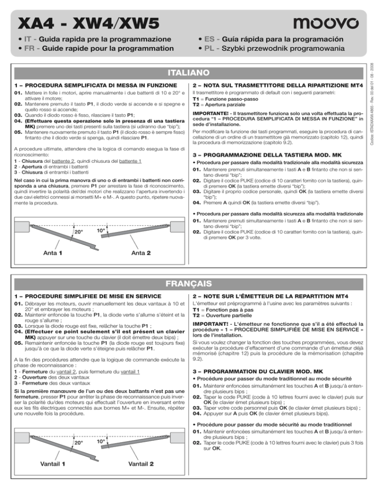 XA4 - XW4/XW5 • ES - Guía rápida para la programación • PL - Szybki przewodnik programowania ITALIANO 1 – PROCEDURA SEMPLIFICATA DI MESSA IN FUNZIONE 2 – NOTA SUL TRASMETTITORE DELLA RIPARTIZIONE MT4 01. Mettere in folle i motori, aprire manualmente i due battenti di 10 e 20° e attivare il motore; 02. Mantenere premuto il tasto P1, il diodo verde si accende e si spegne e quello rosso si accende; 03. Quando il diodo rosso è fisso, rilasciare il tasto P1; 04. (Effettuare questa operazione solo in presenza di una tastiera MK) premere uno dei tasti presenti sulla tastiera (si udiranno due “bip”); 05. Mantenere nuovamente premuto il tasto P1 (il diodo rosso è sempre fisso) fintanto che il diodo verde si spenga, quindi rilasciare P1. Il trasmettitore è programmato di default con i seguenti parametri: T1 = Funzione passo-passo T2 = Apertura parziale A procedure ultimate, attendere che la logica di comando esegua la fase di riconoscimento: 1 - Chiusura del battente 2, quindi chiusura del battente 1 2 - Apertura di entrambi i battenti 3 - Chiusura di entrambi i battenti Nel caso in cui la prima manovra di uno o di entrambi i battenti non corrisponda a una chiusura, premere P1 per arrestare la fase di riconoscimento, quindi invertire la polarità del/dei motori che realizzano l’apertura invertendo i due cavi elettrici connessi ai morsetti M+ e M-. A questo punto, ripetere nuovamente la procedura. IMPORTANTE! - Il trasmettitore funziona solo una volta effettuata la procedura “1 – PROCEDURA SEMPLIFICATA DI MESSA IN FUNZIONE” in sede d’installazione. Per modificare la funzione dei tasti programmati, eseguire la procedura di cancellazione di un ordine di un trasmettitore già memorizzato (capitolo 12), quindi la procedura di memorizzazione (capitolo 9.2). 3 – PROGRAMMAZIONE DELLA TASTIERA MOD. MK • Procedura per passare dalla modalità tradizionale alla modalità sicurezza 01. Mantenere premuti simultaneamente i tasti A e B fintanto che non si sentano diversi “bip”; 02. Digitare il codice PUKE (codice di 10 caratteri fornito con la tastiera), quindi premere OK (la tastiera emette diversi “bip”); 03. Digitare il proprio codice personale, quindi OK (la tastiera emette diversi “bip”); 04. Premere A quindi OK (la tastiera emette diversi “bip”). • Procedura per passare dalla modalità sicurezza alla modalità tradizionale 01. Mantenere premuti simultaneamente i tasti A e B fintanto che non si sentano diversi “bip”; 02. Digitare il codice PUKE (codice di 10 caratteri fornito con la tastiera), quindi premere OK per 3 volte. Anta 1 Anta 2 FRANÇAIS 1 – PROCEDURE SIMPLIFIEE DE MISE EN SERVICE 2 – NOTE SUR L'ÉMETTEUR DE LA REPARTITION MT4 01. Débrayer les moteurs, ouvrir manuellement les deux vantaux à 10 et 20° et embrayer les moteurs ; 02. Maintenir enfoncée la touche P1, la diode verte s’allume s’éteint et la rouge s’allume ; 03. Lorsque la diode rouge est fixe, relâcher la touche P1 ; 04. (Effectuer ce point seulement s’il est présent un clavier MK) appuyer sur une touche du clavier (il doit émettre deux bips) ; 05. Remaintenir enfoncée la touche P1 (la diode rouge est toujours fixe) jusqu’à ce que la diode verte s’éteigne puis relâcher P1. L'émetteur est préprogrammé à l'usine avec les paramètres suivants : T1 = Fonction pas à pas T2 = Ouverture partielle A la fin des procédures attendre que la logique de commande exécute la phase de reconnaissance : 1 - Fermeture du vantail 2, puis fermeture du vantail 1 2 - Ouverture des deux vantaux 3 - Fermeture des deux vantaux Si la première manœuvre de l’un ou des deux battants n’est pas une fermeture, presser P1 pour arrêter la phase de reconnaissance puis inverser la polarité du/des moteurs qui effectuait l’ouverture en inversant entre eux les fils électriques connectés aux bornes M+ et M-. Ensuite, répéter une nouvelle fois la procédure. IMPORTANT! - L'émetteur ne fonctionne que s’il a été effectué la procédure « 1 – PROCEDURE SIMPLIFIÉE DE MISE EN SERVICE » lors de l'installation. Si vous voulez changer la fonction des touches programmées, vous devez exécuter la procédure d’effacement d’une commande d’un émetteur déjà mémorisé (chapitre 12) puis la procédure de la mémorisation (chapitre 9.2). 3 – PROGRAMMATION DU CLAVIER MOD. MK • Procédure pour passer du mode traditionnel au mode sécurité 01. Maintenir enfoncées simultanément les touches A et B jusqu'à entendre plusieurs bips ; 02. Taper le code PUKE (code à 10 lettres fourni avec le clavier) puis sur OK (le clavier émet plusieurs bips) ; 03. Taper votre code personnel puis OK (le clavier émet plusieurs bips) ; 04. Appuyer sur A puis OK (le clavier émet plusieurs bips). • Procédure pour passer du mode sécurité au mode traditionnel 01. Maintenir enfoncées simultanément les touches A et B jusqu'à entendre plusieurs bips ; 02. Taper le code PUKE (code à 10 lettres fourni avec le clavier) puis 3 fois sur OK. Vantail 1 Vantail 2 Codice: ISTADXAXW.4865 - Rev. 00 del 01 - 08 - 2008 • IT - Guida rapida pre la programmazione • FR - Guide rapide pour la programmation ESPAÑOL 1 – PROCEDIMIENTO SIMPLIFICADO DE PUESTA EN FUNCIONAMIENTO 2 – NOTA ACERCA DEL TRATAMIENTO DE LA DISTRIBUCIÓN MT4 01. Desembragar los motores, abrir manualmente los dos batientes de 10 y 20° y activar el motor; 02. Mantener presionada la tecla P1, el diodo verde se enciende y se apaga, y el rojo se enciende; 03. Soltar la tecla P1, cuando el diodo rojo esté fijo; 04. (Realizar esta operación solo en presencia de un teclado MK) presionar una de las teclas del teclado (se escucharán dos “bip”); 05. Mantener presionada la tecla P1 (el diodo rojo está siempre fijo) hasta que se apague el diodo verde, entonces suelte P1. El transmisor está programado por defecto con los siguientes parámetros: T1 = Función paso-paso T2 = Apertura parcial Una vez finalizado el procedimiento, esper