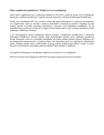 Masz wątpliwości podatkowe? Wejdź na www.szybkipit.pl Jeżeli masz wątpliwości przy rozliczaniu podatku za rok 2014 wejdź na stronę www.szybkipit.pl, skorzystaj z aplikacji pytaniowej i zapytaj naszych ekspertów z Krajowej Informacji Podatkowej. Każdy, kto wypełniając PIT, chce uzyskać istotne dla niego informacje nt. rozliczeń, ma problemy czy wątpliwości, może je rozwiać z pomocą materiałów zawartych na stronie. Znajdują się tam między innymi wszystkie potrzebne formularze i broszury oraz kalkulatory podatkowe. Za jej pośrednictwem można też wysłać do swojego urzędu skarbowego roczne zeznania podatkowe przez aplikację e-Deklaracje Desktop. A co najważniejsze strona szybkipit.pl ułatwia kontakt z ekspertami podatkowymi z Krajowej Informacji Podatkowej, którym można zadać bezpośrednio pytanie przez aplikację pytaniową. Każdy internauta może też swobodnie przeglądać wszystkie zadane pytania poprzez aplikację, np. po kategoriach tematycznych, za pomocą tagów lub najciekawszych czy najczęściej zadawanych pytań. Zadanie pytania przez użytkownika wymaga jedynie podania jego adresu e-mail, na który otrzyma on ID pytania, powalające później odnaleźć dane pytanie w aplikacji. Szczegółowe informacje o działaniach znajdziesz na stronie www.szybkipit.pl Obserwuj również nasz fanpage Szybki PIT na portalu społecznościowym Facebook.