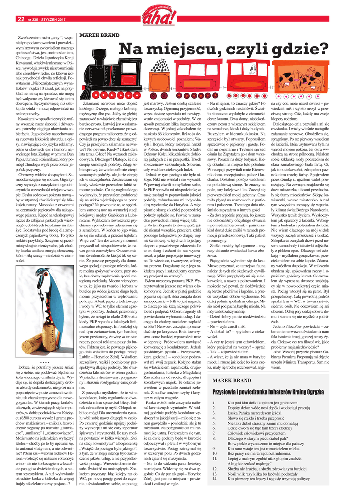 22 nr 235 - STYCZEŃ 2017 Zwieńczeniem ruchu „anty-”, wspania³ym podsumowaniem i prawdzi-wym krzywym zwierciad³em naszego spo³eczeństwa, jest, moim zdaniem, Chindogu. Dzie³a Japończyka Kenji Kawakami, w³aściwie nieznane w Polsce, wywo³uj¹ zwykle niezrozumienie albo chorobliwy rechot, po którym jednak przychodzi chwila refleksji. Powstaniem „Niebezużytecznych wynalazków” rz¹dzi 10 zasad, jak na przyk³ad, że nie s¹ na sprzedaż, nie mog¹ być wulgarne czy kierować się tanim dowcipem. S¹ czymś więcej niż sztuk¹ dla sztuki – musz¹ odpowiadać na realne potrzeby. Kawakami w sposób niezwykle trafny wskazuje nasze s³abostki i dziwactwa, potrzebę ci¹g³ego u³atwiania sobie życia. Jego obiekty nacechowane s¹ cudowna lekkości¹ absurdu, a opisy, nawi¹zuj¹ce do języka reklamy, pe³ne s¹ s³ownych gier i humoru najwyższego lotu. Zas³ugę w tym ma Dan Papia, t³umacz i dziennikarz, który pomóg³ Chindogu wyjść poza obszar japońskojezyczny. Obrotowy widelec do spaghetti. Samoodświeżaj¹ce się obuwie. Gigantyczny scyzoryk z narzędziami ogrodniczymi dla oszczędności miejsca w szopie. Deska sedesowa pokryta traw¹ – by w intymnej chwili cieszyć się bliskości¹ natury. Maseczka z otworami na czternaście papierosów dla na³ogowego palacza. Kapeć na teleskopowej r¹czce do zabijania paskudnych wielonogów, do których brzydzimy się zbliżyć. Podstawka pod brodę dla zmęczonych papierkow¹ robot¹. To tylko niektóre przyk³ady. Szczytem s¹ przedmioty skrajnie nieużywalne, jak choćby latarka zasilana energi¹ s³oneczn¹, która – si³¹ rzeczy – nie dzia³a w ciemności. ---Dobrze, że potrafimy jeszcze śmiać się z siebie, nie poddawać b³ędnemu ko³u wiecznego umilania życia. Wydaje się, że dopóki dostrzegamy drobne absurdy codzienności, nie grozi nam popadnięcie w puste samozadowolenie, tak charakterystyczne dla naszego gatunku. W kieracie pracy, korków ulicznych, zawieszaj¹cych się komputerów, w dobie pochówków na Księżycu (6500 euro za wywóz 1 grama prochów; ma³żeństwa – zniżka), łatwo i chętnie sięgamy po rozmaite „u³atwiacze”, „umilacze” i „odstresowiacze”. Może warto na jeden dzień wyłączyć telefon – choćby po to, by upewnić się, że automat s³uży nam, a nie odwrotnie? Potem zaś – wzorem rodaków Herona – roz³ożyć się na trawie i otworzyć wino – ale nie korkoci¹giem w kszta³cie papugi za dwieście z³otych, a starym scyzorykiem. A nuż wy³awianie okruchów korka z kieliszka da więcej frajdy niż elektroniczny pasjans...? MAREK BRAND Na miejscu, czyli gdzie? Za³amanie nerwowe może dopaść każdego. Dużego, ma³ego, kobietę, mężczyznę albo psa. Jakby się g³ębiej zastanowić to w³aściwie z³amać się jest bardzo prosto. Łatwiej jest o za³amanie nerwowe niż przekonanie prowadz¹cego program milionerzy, że tę odpowiedź na pewno chce się zaznaczyć. Czy ja przeży³em za³amanie nerwowe? No pewnie. Kiedy? Jakieś dwa lata temu. Gdzie? Na wczasach zakładowych. Dlaczego? Dlatego, że nie cierpię samotnych podróży. Zdaję sobie sprawę, że wiele osób nie cierpi samotnych podróży, ale ja nie cierpię ich w szczególności. Zastanawiam się kiedy właściwie przestałem lubić samotne podróże. Co się nagle takiego wydarzy³o, że przesta³em podniecać się na widok wjeżdżaj¹cego na peron pociągu? Na pewno nie to, że spędzi³em samotn¹ noc na wymar³ej stacji kolejowej między Grabikiem a Lubanicami. Wykluczam również uraz psychiczny spowodowany zderzeniem się z semaforem. W końcu to jego wina, że się nie odsun¹³, a przecież tr¹biłem. Więc co? Ten dziwaczny moment przyszed³ tak niespodziewanie, że nawet go nie zauważy³em. Owszem mia³em świadomość, że kiedyś tak się stanie. ¯e porzucę przygody dla domowego spokoju i ptasiego mleczka, które można spożywać w domu przy stole, bez obawy zaplamienia spodni roztopion¹ czekolad¹. Mocno wierzyłem w to, że jajko na twardo i herbata w butelce po wódce jeszcze d³ugo będ¹ moimi przyjació³mi w wędrowaniu po kraju. A brak papieru toaletowego i wody w WC, to tylko element egzotyki w podróży. Jednak przekonany by³em, że nast¹pi to oko³o 2010 roku, kiedy PKP wycofa z lokalnych linii, muzealne eksponaty. Im bardziej się nad tym zastanawiam, tym bardziej jestem przekonany, że winę za ten stan rzeczy ponosi reklama pasty do butów. Faktem jest, że pewnego pięknego dnia wsiad³em do poci¹gu relacji Lublin – Horyniec Zdrój. Wsiad³em szczęśliwy, rześki i podniecony perspektyw¹ d³ugiej podróży. Sto dwadzieścia kilometrów w osiem godzin. Wysiad³em sfrustrowany, przygaszony i strasznie rozdygotany emocjonalnie. Z pocz¹tku myśla³em, że to wina konduktora, który regularnie co dwadzieścia minut sprawdza³ bilety. Jednak odrzuci³em tę myśl. Ch³opak robi³ co móg³. Dla urozmaicenia rytuału wbi³ sobie nawet d³ugopis w czo³o. Po czwartej godzinie upojnej podróży wyczerpa³ mi się ca³y repertuar œpiewany i recytatorski. Ile razy można powtarzać w kó³ko wierszyk „Stoi na stacji lokomotywa” albo piosenkę „Wsi¹ść do poci¹gu byle jakiego”, z tym, że w mojej intencji by³o zaznaczenie jakości us³ug, a nie przypadkowości poci¹gu. Wreszcie do mnie dotar³o. Świat³ość na mnie sp³ynęła. Znalaz³em przyczynę. Id¹c kolejny raz do WC, po now¹ porcję gazet do czytania, uświadomi³em sobie, że pociąg jest martwy. Jestem osob¹ szalenie towarzysk¹. Ogromn¹ przyjemność, wręcz ekstazę sprawia³o mi nawiązywanie znajomości w podróży. W ten sposób pozna³em kilka interesuj¹cych dziewcz¹t. W jednej zakocha³em się na oko³o 66 kilometrów. Ileż to ja ciekawych osobowości pozna³em; Wasyla i Borysa, którzy rozkręcali handel w Polsce, dwóch sierżantów Służby Ochrony Kolei, kilkudziesięciu żo³nierzy jad¹cych z i na przepustki. Trzech zboczeńców seksualnych. S³owem, ca³y wachlarz c