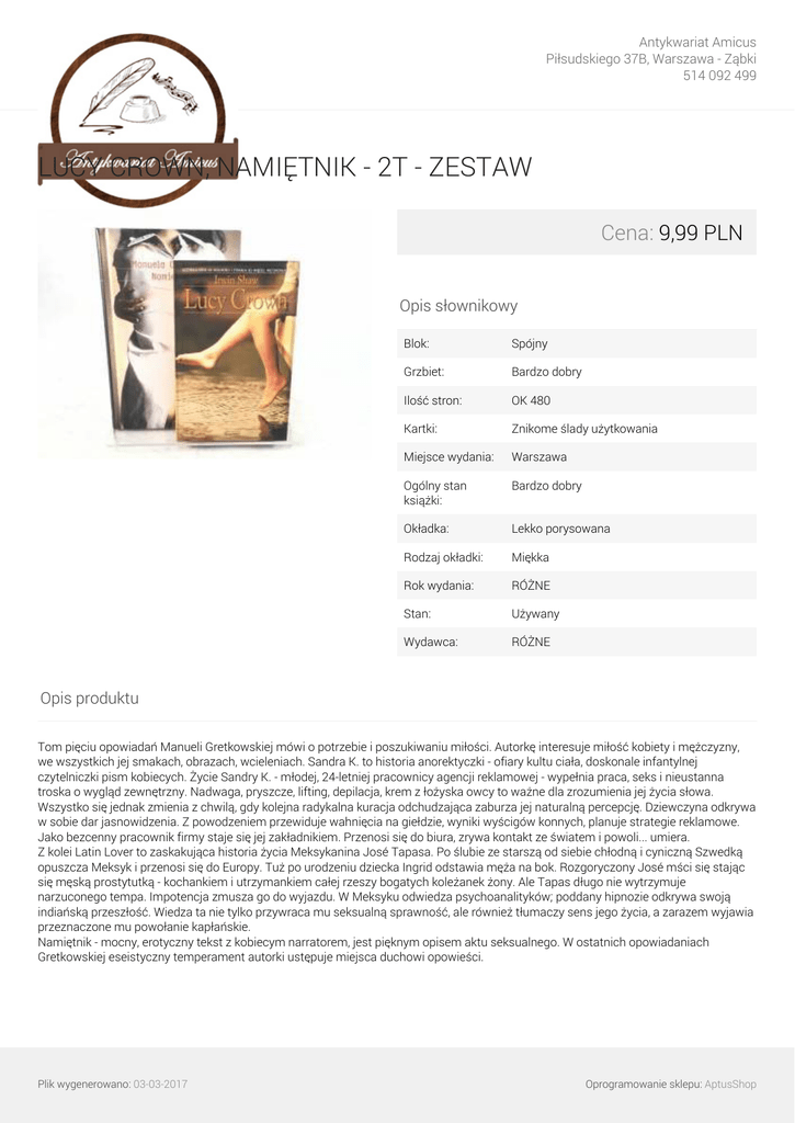 Antykwariat Amicus Piłsudskiego 37B, Warszawa - Ząbki 514 092 499 LUCY CROWN, NAMIĘTNIK - 2T - ZESTAW Cena: 9,99 PLN Opis słownikowy Blok: Spójny Grzbiet: Bardzo dobry Ilość stron: OK 480 Kartki: Znikome ślady użytkowania Miejsce wydania: Warszawa Ogólny stan książki: Bardzo dobry Okładka: Lekko porysowana Rodzaj okładki: Miękka Rok wydania: RÓŻNE Stan: Używany Wydawca: RÓŻNE Opis produktu Tom pięciu opowiadań Manueli Gretkowskiej mówi o potrzebie i poszukiwaniu miłości. Autorkę interesuje miłość kobiety i mężczyzny, we wszystkich jej smakach, obrazach, wcieleniach. Sandra K. to historia anorektyczki - ofiary kultu ciała, doskonale infantylnej czytelniczki pism kobiecych. Życie Sandry K. - młodej, 24-letniej pracownicy agencji reklamowej - wypełnia praca, seks i nieustanna troska o wygląd zewnętrzny. Nadwaga, pryszcze, lifting, depilacja, krem z łożyska owcy to ważne dla zrozumienia jej życia słowa. Wszystko się jednak zmienia z chwilą, gdy kolejna radykalna kuracja odchudzająca zaburza jej naturalną percepcję. Dziewczyna odkrywa w sobie dar jasnowidzenia. Z powodzeniem przewiduje wahnięcia na giełdzie, wyniki wyścigów konnych, planuje strategie reklamowe. Jako bezcenny pracownik firmy staje się jej zakładnikiem. Przenosi się do biura, zrywa kontakt ze światem i powoli... umiera. Z kolei Latin Lover to zaskakująca historia życia Meksykanina José Tapasa. Po ślubie ze starszą od siebie chłodną i cyniczną Szwedką opuszcza Meksyk i przenosi się do Europy. Tuż po urodzeniu dziecka Ingrid odstawia męża na bok. Rozgoryczony José mści się stając się męską prostytutką - kochankiem i utrzymankiem całej rzeszy bogatych koleżanek żony. Ale Tapas długo nie wytrzymuje narzuconego tempa. Impotencja zmusza go do wyjazdu. W Meksyku odwiedza psychoanalityków; poddany hipnozie odkrywa swoją indiańską przeszłość. Wiedza ta nie tylko przywraca mu seksualną sprawność, ale również tłumaczy sens jego życia, a zarazem wyjawia przeznaczone mu powołanie kapłańskie. Namiętnik - mocny, erotyczny tekst z kobiecym narratorem, jest pięknym opisem aktu seksualnego. W ostatnich opowiadaniach Gretkowskiej eseistyczny temperament autorki ustępuje miejsca duchowi opowieści. Plik wygenerowano: 03-03-2017 Oprogramowanie sklepu: AptusShop Antykwariat Amicus Piłsudskiego 37B, Warszawa - Ząbki 514 092 499 Galeria Plik wygenerowano: 03-03-2017 Powered by TCPDF (www.tcpdf.org) Oprogramowanie sklepu: AptusShop