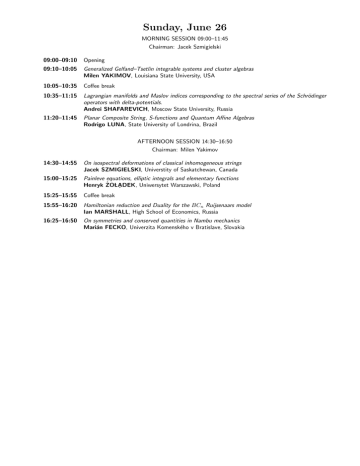 Sunday, June 26 MORNING SESSION 09:00–11:45 Chairman: Jacek Szmigielski 09:00–09:10 Opening 09:10–10:05 Generalized Gelfand–Tsetlin integrable systems and cluster algebras Milen YAKIMOV, Louisiana State University, USA 10:05–10:35 Coffee break 10:35–11:15 Lagrangian manifolds and Maslov indices corresponding to the spectral series of the Schrödinger operators with delta-potentials. Andrei SHAFAREVICH, Moscow State University, Russia 11:20–11:45 Planar Composite String, S-functions and Quantum Affine Algebras Rodrigo LUNA, State University of Londrina, Brazil AFTERNOON SESSION 14:30–16:50 Chairman: Milen Yakimov 14:30–14:55 On isospectral deformations of classical inhomogeneous strings Jacek SZMIGIELSKI, Universtity of Saskatchewan, Canada 15:00–15:25 Painleve equations, elliptic integrals and elementary functions Henryk ŻOLA̧DEK, Uniwersytet Warszawski, Poland 15:25–15:55 Coffee break 15:55–16:20 Hamiltonian reduction and Duality for the BCn Ruijsenaars model Ian MARSHALL, High School of Economics, Russia 16:25–16:50 On symmetries and conserved quantities in Nambu mechanics Marián FECKO, Univerzita Komenského v Bratislave, Slovakia Monday, June 27 MORNING SESSION 09:00–12:35 Chairman: Ruben Mkrtchyan 09:00–09:55 Supergeometry of gauge PDE and AKSZ sigma models Maxim GRIGORIEV, Lebedev Physical Institute, Russia 10:00–10:40 Deformation quantization with separation of variables on a split supermanifold Alexander KARABEGOV, Abilene Christian University, USA 10:40–11:10 Coffee break 11:10–11:50 Thickening and quantization of the category of (super)manifolds Theodore VORONOV, University of Manchester, UK 11:55–12:35 Higher Koszul brackets Hovhannes KHUDAVERDIAN, University of Manchester, UK AFTERNOON SESSION 14:30–16:50 Chairman: Andrei Shafarevich 14:30–14:55 An adaptation of the WKB approximation to deformation quantisation Jaromir TOSIEK, Politechnika Lódzka, Poland 15:00–15:25 String Lie theory and diffeomorphism groups Wojciech WOJTYŃSKI, Uniwersytet w Bialymstoku, Poland 15:25–15:55 Coffee break 15:55–16:20 The Shmushkevich method for higher symmetry groups Goce CHADZITASKOS, České Vysoké Učenı́ Technické v Praze, Czech Republic 16:25–16:50 Hamilton Operators and Related Integrable Differential-Algebraic Novikov–Leibniz Structures Anatolij PRYKARPATSKI, Akademia Górniczo-Hutnicza, Poland Tuesday, June 28 MORNING SESSION 09:00–12:35 Chairman: Hovhannes Khudaverdian 09:00–09:55 An infinite dimensional Lie algebra and conserved charges in String theory Dorothea BAHNS, Universität Göttingen, Germany 10:00–10:40 Noncommutative gauge theory of generalized (quantum) Weyl algebras Tomasz BRZEZIŃSKI, Uniwersytet w Bialymstoku / Swansea University, Poland / UK 10:40–11:10 Coffee break 11:10–11:35 Generalized Fock spaces and second quantization as examples of hypercontractive semigroups Marek BOŻEJKO, Uniwersytet Wroclawski, Poland 11:40–12:05 Quasi-periodic algebras and their automorphisms Anatolij ANTONEVICH, Uniwersytet w Bialymstoku, Poland 12:10–12:35 Coadjoint dynamical systems and group C ∗ -algebras Daniel BELTIŢǍ, Institute of Mathematics “Simion Stoilow” of the Romanian Academy, Romania AFTERNOON SESSION 14:30–16:35 Chairman: Alexander Karabegov 14:30–15:10 Poisson transforms for tensor products of representations of SL(2, R) Vladimir MOLCHANOV, Derzhavin Tambov State University, Russia 15:10–15:40 Coffee break 15:40–16:05 Local optimality of sub-Riemannian geodesics Michal JÓŹWIKOWSKI, Instytut Matematyczny Polskiej Akademii Nauk, Poland 16:10–16:35 Celestial geometry of Lorentzian manifolds Innocenti MARESIN, Steklov Mathematical Institute, Russia Wednesday, June 29 MORNING SESSION 09:00–12:00 Chairman: Tomasz Brzeziński 09:00–09:55 Universality in simple Lie algebras and Chern–Simons theory Ruben MKRTCHYAN, Yerevan Physics Institute, Armenia 10:00–10:40 Geometric structures canonically related to a W ∗ -algebra Anatol ODZIJEWICZ, Uniwersytet w Bialymstoku, Poland 10:40–11:05 Coffee break 11:05–11:30 Partial Poisson structure Fernand PELLETIER, Université de Savoie, France 11:35–12:00 Banach Poisson Lie groups and the restricted Grassmannian Alice Barbara TUMPACH, Laboratoire Painlevé, France POSTER SESSION 12:00–13:00 Thursday, June 30 MORNING SESSION 09:00–12:20 Chairman: Alexei Rybkin 09:00–09:55 An algebraic background for hierarchies of PDE in dimension (2|1) Claude ROGER, Université Claude-Bernard Lyon 1, France 10:00–10:25 Conformal symmetry and nonlinear Maxwell fields Gerald GOLDIN, Rutgers University, USA 10:25–10:55 Coffee break 10:55–11:20 Wigner function for a qubit Jerzy KIJOWSKI, Centrum Fizyki Teoretycznej, PAN, Poland 11:25–11:50 The complete list of normal forms for germs of vector fields with quadratic leading part Ewa STRÓŻYNA, Politechnika Warszawska, Poland 11:55–12:20 In Memoriam: S. Twareque Ali Gerald GOLDIN, Rutgers University, USA AFTERNOON SESSION 14:30–17:20 Chairman: Jerzy Kijowski 14:30–15:25 Symmetry breaking operators for infinite-dimensional representations Michael PEVZNER, Université de Reims, France 15:30–15:55 Holomorphic functions on the symmetrized bidisk Tirthankar BHATTACHARYYA, Indian Institute of Science, India 15:55–16:25 Coffee break 16:25–16:50 The puzzle of empty bottle in quantum mechanics Bogdan MIELNIK, CINVESTAV, Mexico 16:55–17:20 Electronic properties of carbon nanostructures Jan SMOTLACHA, Joint Institute of Nuclear Research, Russia Friday, July 1 AFTERNOON SESSION 14:00–17:30 Chairman: Emma Previato 14:00–14:10 Opening 14:10–15:05 Schrödinger operator with continuous spectrum and turbulence in integrable systems Vladimir ZAKHAROV, University of Arizona, USA 15:10–16:05 Integrable Probability and the Role of Painlevé Functions Craig TRACY, University of California, Davis, USA 16:05–16:35 Coffee break 16:35–17:00 Soliton hierarchies and matrix loop algebras Wen-Xiu M