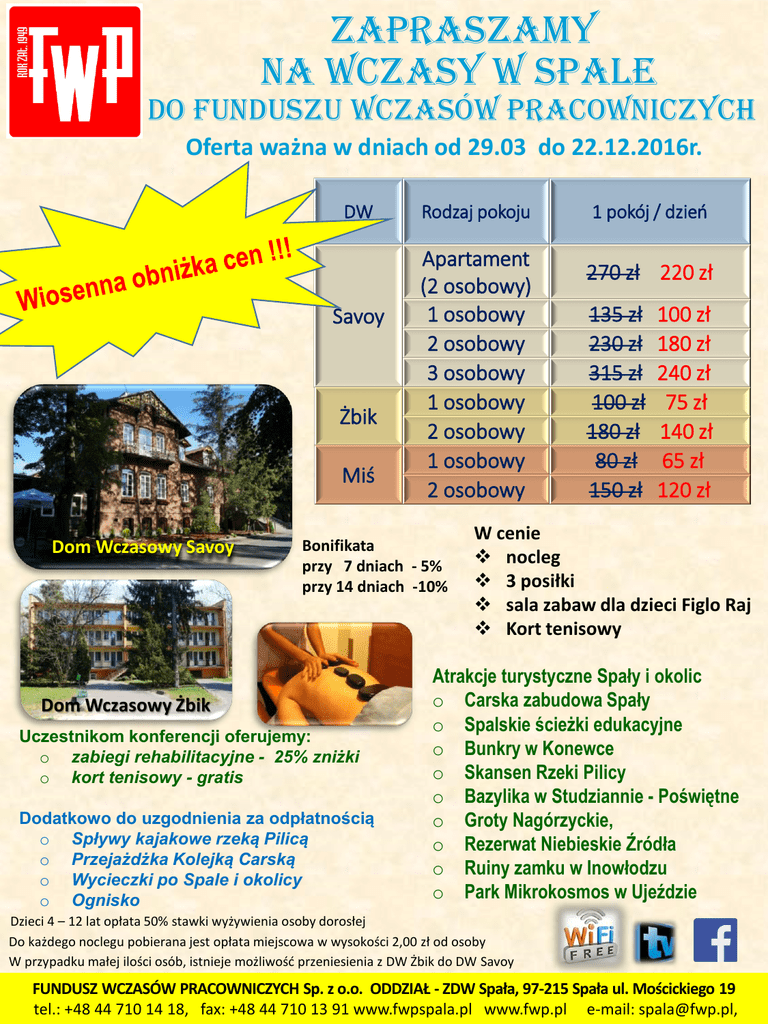Zapraszamy na wczasy w Spale do Funduszu Wczasów Pracowniczych Oferta ważna w dniach od 29.03 do 22.12.2016r. DW Savoy Żbik Miś Dom Wczasowy Savoy Rodzaj pokoju Apartament (2 osobowy) 1 osobowy 2 osobowy 3 osobowy 1 osobowy 2 osobowy 1 osobowy 2 osobowy Bonifikata przy 7 dniach - 5% przy 14 dniach -10% Dom Wczasowy Żbik Uczestnikom konferencji oferujemy: o zabiegi rehabilitacyjne - 25% zniżki o kort tenisowy - gratis Dodatkowo do uzgodnienia za odpłatnością o Spływy kajakowe rzeką Pilicą o Przejażdżka Kolejką Carską o Wycieczki po Spale i okolicy o Ognisko 1 pokój / dzień 270 zł 220 zł 135 zł 230 zł 315 zł 100 zł 180 zł 80 zł 150 zł 100 zł 180 zł 240 zł 75 zł 140 zł 65 zł 120 zł W cenie nocleg 3 posiłki sala zabaw dla dzieci Figlo Raj Kort tenisowy Atrakcje turystyczne Spały i okolic o Carska zabudowa Spały o Spalskie ścieżki edukacyjne o Bunkry w Konewce o Skansen Rzeki Pilicy o Bazylika w Studziannie - Poświętne o Groty Nagórzyckie, o Rezerwat Niebieskie Źródła o Ruiny zamku w Inowłodzu o Park Mikrokosmos w Ujeździe Dzieci 4 – 12 lat opłata 50% stawki wyżywienia osoby dorosłej Do każdego noclegu pobierana jest opłata miejscowa w wysokości 2,00 zł od osoby W przypadku małej ilości osób, istnieje możliwość przeniesienia z DW Żbik do DW Savoy FUNDUSZ WCZASÓW PRACOWNICZYCH Sp. z o.o. ODDZIAŁ - ZDW Spała, 97-215 Spała ul. Mościckiego 19 tel.: +48 44 710 14 18, fax: +48 44 710 13 91 www.fwpspala.pl www.fwp.pl e-mail: [email protected],