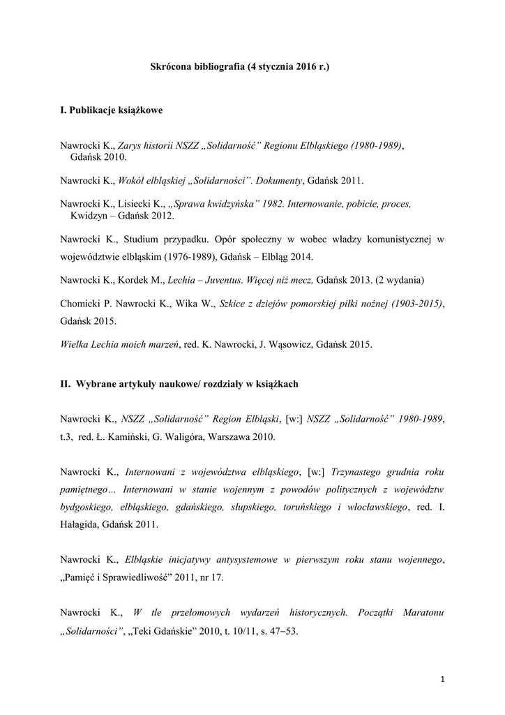 Skrócona bibliografia (4 stycznia 2016 r.) I. Publikacje książkowe Nawrocki K., Zarys historii NSZZ „Solidarność” Regionu Elbląskiego (1980-1989), Gdańsk 2010. Nawrocki K., Wokół elbląskiej „Solidarności”. Dokumenty, Gdańsk 2011. Nawrocki K., Lisiecki K., „Sprawa kwidzyńska” 1982. Internowanie, pobicie, proces, Kwidzyn – Gdańsk 2012. Nawrocki K., Studium przypadku. Opór społeczny w wobec władzy komunistycznej w województwie elbląskim (1976-1989), Gdańsk – Elbląg 2014. Nawrocki K., Kordek M., Lechia – Juventus. Więcej niż mecz, Gdańsk 2013. (2 wydania) Chomicki P. Nawrocki K., Wika W., Szkice z dziejów pomorskiej piłki nożnej (1903-2015), Gdańsk 2015. Wielka Lechia moich marzeń, red. K. Nawrocki, J. Wąsowicz, Gdańsk 2015. II. Wybrane artykuły naukowe/ rozdziały w książkach Nawrocki K., NSZZ „Solidarność” Region Elbląski, [w:] NSZZ „Solidarność” 1980-1989, t.3, red. Ł. Kamiński, G. Waligóra, Warszawa 2010. Nawrocki K., Internowani z województwa elbląskiego, [w:] Trzynastego grudnia roku pamiętnego… Internowani w stanie wojennym z powodów politycznych z województw bydgoskiego, elbląskiego, gdańskiego, słupskiego, toruńskiego i włocławskiego, red. I. Hałagida, Gdańsk 2011. Nawrocki K., Elbląskie inicjatywy antysystemowe w pierwszym roku stanu wojennego, „Pamięć i Sprawiedliwość” 2011, nr 17. Nawrocki K., W tle przełomowych wydarzeń historycznych. Początki Maratonu „Solidarności”, „Teki Gdańskie” 2010, t. 10/11, s. 4753. 1 Nawrocki K., W obronie Solidarności. Manifestacje patriotyczne w Elblągu w pierwszym roku stanu wojennego, [w:] O Polskę wolną, o Polskę solidarną, red. W. Polak, Toruń 2011. Nawrocki K., Wbrew trudnościom. Tworzenie struktur organizacyjnych NSZZ „Solidarność” w regionie elbląskim, [w:] Szkice z dziejów NSZZ „Solidarność” na Pomorzu Nadwiślańskim i Kujawach (1980-1990), red. I. Hałagida, Bydgoszcz – Gdańsk 2012. Nawrocki K., Elbląski Komitet Obywatelski przed, w trakcie i po wyborach z 4 czerwca 1989 r., [w:] Tam też była „Solidarność”. Małe ośrodki ruchu związkowego i ich rola w latach 1980-1990, red. A. Pyżewska, M. Zwolski, Białystok 2012, s. 219-227. Nawrocki K., Elbląska prasa podziemna 1982-1986, [w:] Wbrew partii cenzurze, red. P. Kardela, P. Warot, T. Wolsza, Warszawa 2012. Nawrocki K., Uciec, ale dokąd? Przypadek Bogusława Szybalskiego, [w:] Stan wojenny na Pomorzu Nadwiślańskim (1981-1983), red. P. Brzeziński, Gdańsk 2012. Nawrocki K., Ostatnia deska ratunku. Skargi i zażalenia kierowane do KW PZPR w Gdańsku w latach 1976-1980, [w:] Szkice z życia codziennego w Gdańsku w latach 1945-1989, red. G. Berendt, E Kizik, Gdańsk 2012. Nawrocki K., Astronom, podziemny wydawca, poseł. Sylwetka Edmunda „Marcina” Krasowskiego, [w:] Czas bibuły. Mechanizmy, ludzie, idee, red. R. Wróblewski, Wrocława 2013. Nawrocki K., Przejawy działań opozycyjnych w Elblągu w latach 1976-1980, [w:] Opozycja demokratyczna w PRL w latach 1976-1981, red. W. Polak, J. Kufel, P. Ruchlewski, Gdańsk 2012. Girzyński Z., Nawrocki K., Kwidzyn 1975-1990, [w:] Kwidzyn. Dzieje miasta, red. J. Liguz, K. Mikulski, Kwidzyn 2013. Nawrocki K., Milicjanci i złodzieje. Zorganizowane i mniej zorganizowane grupy przestępcze w województwie gdańskim w latach 80., [w:] Społeczeństwo polskie w latach 1980-1989, red. N. Jarska, J. Oleszek, Warszawa 2015. 2 Wybrane teksty popularno-naukowe Nawrocki K., Więcej niż mecz. Lechia – Juventus, [w:] Nieczysta gra. Tajne służby a piłka nożna, Videograf, Chorzów 2012, s. 151-160. Nawrocki K., Bunt w Kwidzynie, „Pamięć.pl” 2012, nr 4-5. Nawrocki K., Sierpień’80 w Elblągu, „Biuletyn IPN” 2010, nr 9-10, s.82 – 86. Nawrocki K., Zatrzymać Szarmacha, „Magazyn Solidarność” 2011, nr 2. Nawrocki K., Tajny Kolejowy Komitet Koordynacyjny Obszaru Północnego NSZZ „Solidarność” 1982- 1983, „Magazyn Solidarność” 2010, nr 7. Nawrocki. K., Nie zgadzam się. Strajk w stanie wojennym w ZNTK w Gdańsku, „Magazyn Solidarność”2009, nr 12. Nawrocki K., Majchrzak G., Mecz polityczny, „Polityka” 2013, nr 39. Nawrocki K., Pseudonim „Impresor”, „Do Rzeczy Historia”, nr 3 2013. Nawrocki K., Gangi PRL, „Do Rzeczy Historia”, nr 1 2015. Artykuły popularnonaukowe w portalu historycznym histmag.org (2008-2011): - Od Urugwaju do RPA, historia piłkarskich Mistrzostw Świata - Inicjatywa sportowa I sekretarza KC PZPR. Wojewódzka Federacja Sportu w Gdańsku - Panna „S” w sportowym dresie - W służbie partii, stoczni i futbolu. Zarys kariery Henryka Klocka (www.histmag.org) - Bieg ku zwycięstwu wszystkich. Maraton „Solidarności” - Sportowy akcent dekady Gierka na przykładzie Wojewódzkiej Fedreacji Sportu - „Niezniszczalni”. Reakcje działaczy gdańskiej piłki nożnej na nastroje polityczne po 1989 roku - Pojedynek na trzech płaszczyznach. 3-5 maja w Gdańsku - Syjonizm i futbol. Krótka historia Beitaru Jerozolima - Subtelni propagandyści. „Dziennik Bałtycki” o Mundialu w Argentynie - Komercyjny totalitaryzm - Sukces piłkarzy sukcesem I sekretarza) - Imieniny i urodziny systemu komunistycznego w Polsce 3 - Michał Sokolnicki i fenomen odzyskania niepodległości Komunikaty popularnonaukowe na portalu trojmiasto.pl (2010-2012): - Nie takie krwawe derb - Dzielnicowe memento. Z dala od polityki i partii - Władza wobec kibiców za komuny; Wybrane wygłoszone na referaty naukowe: Gdańsk, 24 IV 2009, Konferencja naukowa, Referat: Ostatnia deska ratunku - skargi i zażalenia kierowane do KW PZPR w Gdańsku w latach 1976-1980. Gdańsk, 17 XII 2009, Spotkania w Galerii Mariackiej, Referat: W tle przełomowych wydarzeń historycznych. Początki Maratonu Solidarności. Gdańsk 27-28 VIII 2010 r., Konferencja naukowa, Referat: Wbrew trudnościom. Tworzenie struktur organizacyjnych NSZZ „Solidarność” w regionie elbląskim. Lębork 4 IX 2010 r., obchod