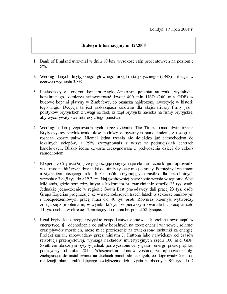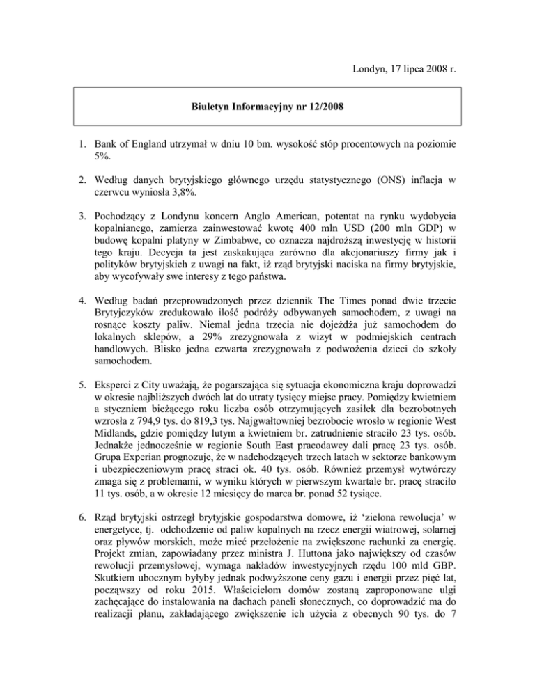 Londyn, 17 lipca 2008 r. Biuletyn Informacyjny nr 12/2008 1. Bank of England utrzymał w dniu 10 bm. wysokość stóp procentowych na poziomie 5%. 2. Według danych brytyjskiego głównego urzędu statystycznego (ONS) inflacja w czerwcu wyniosła 3,8%. 3. Pochodzący z Londynu koncern Anglo American, potentat na rynku wydobycia kopalnianego, zamierza zainwestować kwotę 400 mln USD (200 mln GDP) w budowę kopalni platyny w Zimbabwe, co oznacza najdroższą inwestycję w historii tego kraju. Decycja ta jest zaskakująca zarówno dla akcjonariuszy firmy jak i polityków brytyjskich z uwagi na fakt, iż rząd brytyjski naciska na firmy brytyjskie, aby wycofywały swe interesy z tego państwa. 4. Według badań przeprowadzonych przez dziennik The Times ponad dwie trzecie Brytyjczyków zredukowało ilość podróży odbywanych samochodem, z uwagi na rosnące koszty paliw. Niemal jedna trzecia nie dojeżdża już samochodem do lokalnych sklepów, a 29% zrezygnowała z wizyt w podmiejskich centrach handlowych. Blisko jedna czwarta zrezygnowała z podwożenia dzieci do szkoły samochodem. 5. Eksperci z City uważają, że pogarszająca się sytuacja ekonomiczna kraju doprowadzi w okresie najbliższych dwóch lat do utraty tysięcy miejsc pracy. Pomiędzy kwietniem a styczniem bieżącego roku liczba osób otrzymujących zasiłek dla bezrobotnych wzrosła z 794,9 tys. do 819,3 tys. Najgwałtowniej bezrobocie wrosło w regionie West Midlands, gdzie pomiędzy lutym a kwietniem br. zatrudnienie straciło 23 tys. osób. Jednakże jednocześnie w regionie South East pracodawcy dali pracę 23 tys. osób. Grupa Experian prognozuje, że w nadchodzących trzech latach w sektorze bankowym i ubezpieczeniowym pracę straci ok. 40 tys. osób. Również przemysł wytwórczy zmaga się z problemami, w wyniku których w pierwszym kwartale br. pracę straciło 11 tys. osób, a w okresie 12 miesięcy do marca br. ponad 52 tysiące. 6. Rząd brytyjski ostrzegł brytyjskie gospodarstwa domowe, iż ‘zielona rewolucja’ w energetyce, tj. odchodzenie od paliw kopalnych na rzecz energii wiatrowej, solarnej oraz pływów morskich, może mieć przełożenie na zwiększone rachunki za energię. Projekt zmian, zapowiadany przez ministra J. Huttona jako największy od czasów rewolucji przemysłowej, wymaga nakładów inwestycyjnych rzędu 100 mld GBP. Skutkiem ubocznym byłyby jednak podwyższone ceny gazu i energii przez pięć lat, począwszy od roku 2015. Właścicielom domów zostaną zaproponowane ulgi zachęcające do instalowania na dachach paneli słonecznych, co doprowadzić ma do realizacji planu, zakładającego zwiększenie ich użycia z obecnych 90 tys. do 7 milionów w okresie nadchodzących 12 lat. Plan zakłada również 90%-owy wzrost użytkowania pomp cieplnych, pobierających ciepło z ziemi oraz powietrza. 7. Jednocześnie w roku bieżącym konsumenci powinni liczyć się z potencjalnymi podwyżkami cen energii rzędu 40% w wyniku rosnących cen hurtowych gazu, które uległy niemal potrojeniu w ostatnim roku. 8. Qatar Investment Authority (QIA) zainwestowało 1,7 mld GBP, przejmując 7,7% udziałów w Barclays, trzecim co do wielkości banku w Wielkiej Brytanii. Celem banku jest pozyskanie łącznie 4,5 mld GBP. 9. Network Rail, odpowiedzialna za brytyjską infrastrukturę kolejową, twierdzi, że rządowe plany zwiększenia wydajności kolei o 22,5% do roku 2014 nie przystają do rzeczywistości, gdyż na niektórych odcinkach wymagane jest zwiększenie wydajności o 10% w skali roku. Bardzo silnie rośnie popyt na usługi kolejowe, wynikający głównie z wysokich kosztów mieszkania w Londynie oraz rosnących cen paliw. W ostatnich dziesięciu latach liczba pasażerów kolei wzrosła o 40%, a transportowanych ładunków o 60%, przy jednoczesnym zwiększeniu liczby pociągów jedynie o 20%. 10. Gordon Brown popiera projekt wybudowania w ciągu najbliższych 15 lat co najmniej 8 nowych elektrowni atomowych. Brown stał się zagorzałym zwolennikiem energii jądrowej po ujawnieniu wyników badań wskazujących, że świat będzie musiał wybudować tysiąc nowych elektrowni atomowych, aby osiągnąć cele zakładane w polityce redukcji emisji CO2 i zmniejszenia uzależnienia od paliw kopalnych. Wszystkie dotychczasowe brytyjskie elektrownie atomowe, oprócz siłowni Sizewell B uruchomionej w 1995 roku, zostaną wyłączone w ciągu najbliższych 15 lat. W Wielkiej Brytanii znajduje się 10 elektrowni atomowych generujących 10 gigawatów energii, tj. 19% brytyjskiego zapotrzebowania. 11. Koncern Scottish Coal będzie dostarczać węgiel dla Scottish Power za kwotę 700 milionów GBP w ciągu pięciu najbliższych lat. Większość spalanego w siłowniach Scottish Power węgla (4-6 mln ton rocznie) jest importowana, jednakże przy dynamicznie rosnących cenach na rynku światowym wytwórcy energii w Wielkiej Brytanii zaczynają się obawiać o koszty związane z wykorzystaniem importowanego węgla. Scottish Coal zdecydował się sprzedawać rocznie 2 miliony ton węgla, czyli połowę swojego rocznego wydobycia Scottish Power, żeby zasilić dwie elektrownie węglowe. Dzięki zawarciu umowy spodziewane jest powstanie stu nowych stanowisk pracy. 12. BAE Systems i VT Group podpisały kontrakt na budowę dwóch lotniskowców dla Royal Navy, co zwiększy przychody obu przedsiębiorstw o 3 miliardy GBP i pozwoli na utworzenie 10 tysięcy nowych miejsc pracy. Brytyjskie Ministerstwo Obrony podkreśliło, że okręty wejdą do służby w latach 2014–16. Okręty mają przenosić myśliwce nowego typu i będą nosić imiona: HMS Queen Elizabeth i HMS Prince of Wales. 13. Parlamentarzyści brytyjscy ostrzegają, że koszty utylizacji instalacji umieszczonych w starych elektrowniach atomowych mogą znacząco przekroczyć szacowane przez rząd 73 miliardy GBP, co oznacza ich wzrost o 30% od 2003 roku, przy czym niewykluczony jest dalszy wzrost nakładów. Informacje te pojawiły się w czasie, gdy National Dec
