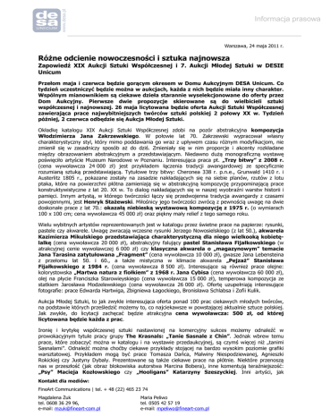 Informacja prasowa Warszawa, 24 maja 2011 r. Różne odcienie nowoczesności i sztuka najnowsza Zapowiedź XIX Aukcji Sztuki Współczesnej i 7. Aukcji Młodej Sztuki w DESIE Unicum Przełom maja i czerwca będzie gorącym okresem w Domu Aukcyjnym DESA Unicum. Co tydzień uczestniczyć będzie można w aukcjach, każda z nich będzie miała inny charakter. Wspólnym mianownikiem są ciekawe dzieła starannie wyselekcjonowane do oferty przez Dom Aukcyjny. Pierwsze dwie propozycje skierowane są do wielbicieli sztuki współczesnej i najnowszej. 26 maja licytowana będzie oferta Aukcji Sztuki Współczesnej zawierająca prace najwybitniejszych twórców sztuki polskiej 2 połowy XX w. Tydzień później, 2 czerwca odbędzie się Aukcja Młodej Sztuki. Okładkę katalogu XIX Aukcji Sztuki Współczesnej zdobi na pozór abstrakcyjna kompozycja Włodzimierza Jana Zakrzewskiego. W połowie lat 70. Zakrzewski wypracował własny charakterystyczny styl, który mimo poddawania go wraz z upływem czasu różnym modyfikacjom, nie zmienił się w zasadniczy sposób aż do dziś. Zmieniały się w nim proporcje i akcenty rozkładane między obrazowaniem abstrakcyjnym a przedstawiającym. Niedawno dużą monograficzną wystawę poświęciło artyście Muzeum Narodowe w Poznaniu. Interesująca praca pt. „Trzy bitwy” z 2008 r. (cena wywoławcza 24 000 zł) jest przykładem łączenia tradycji awangardowej ze specyficznie rozumianą sztuką przedstawiającą. Tytułowe trzy bitwy: Cheronea 338 r. p.n.e., Grunwald 1410 r. i Austerlitz 1805 r., pokazane zostały na zasadzie nakładających się na siebie planów, rzutów z lotu ptaka, które na powierzchni płótna zamieniają się w abstrakcyjną kompozycję przypominającą prace konstruktywistyczne z lat 20. XX w. To dialog nakładających się w naszej wyobraźni warstw historii i pamięci. Innym artystą, w którego twórczości łączy się przedwojenna tradycja awangardy z czasami powojennymi, jest Henryk Stażewski. Miłośnicy jego twórczości zwrócą z pewnością uwagę na dwie doskonałe prace z lat 70.: okazałą niebieską wystawową kompozycję z 1975 r. (o wymiarach 100 x 100 cm; cena wywoławcza 45 000 zł) oraz piękny mały relief z tego samego roku. Wielu wybitnych artystów reprezentowanych jest w katalogu przez świetne prace na papierze: rysunki, pastele czy akwarele. Uwagę zwracają wczesne rysunki Jerzego Nowosielskiego (z lat 50.), akwarela Kazimierza Mikulskiego przedstawiająca charakterystyczną dla niego wielkooką kobietęlalkę (cena wywoławcza 20 000 zł), abstrakcyjny falujący pastel Stanisława Fijałkowskiego (w atrakcyjnej cenie wywoławczej 6 000 zł) czy klasyczna akwarela o „magazynowym” temacie Jana Tarasina zatytułowana „Fragment” (cena wywoławcza 10 000 zł), gwasze Jana Lebensteina z przełomu lat 50. i 60., a także mistyczna w klimacie akwarela „Pejzaż” Stanisława Fijałkowskiego z 1984 r. (cena wywoławcza 8 500 zł). Interesujące są również prace olejne: kolorystowska „Martwa natura z fiołkiem” z 1968 r. Jana Cybisa (cena wywoławcza 60 000 zł), olej na płycie Franciszka Starowieyskiego (cena wywoławcza 15 000 zł), temperowa kompozycja ze statkiem Jarosława Modzelewskiego (cena wywoławcza 26 000 zł). Ofertę uzupełniają interesujące fotografie: prace Edwarda Hartwiga, Zbigniewa Łagockiego, Bronisława Schlabsa i Zofii Kulik. Aukcja Młodej Sztuki, to jak zwykle interesująca oferta ponad 100 prac ciekawych młodych twórców, na podstawie których prześledzić możemy to, co najciekawsze w powstającej aktualnie sztuce polskiej. Jak zwykle, do licytacji zachęcać będzie atrakcyjna cena wywoławcza: 500 zł, od której licytowana będzie każda z prac. Ironię i krytykę współczesnej sztuki nastawionej na komercyjny sukces możemy odnaleźć w prowokacyjnym tytule pracy grupy The Krasnals: „Tanie Sasnale z Chin”. Jednak wbrew temu prace, które zobaczyć można w katalogu i na wystawie przedaukcyjnej, są czymś więcej niż „tanimi Sasnalami”. Odnaleźć można choćby ciekawe przykłady stojącej na bardzo wysokim poziomie grafiki warsztatowej. Przykładem mogą być prace Tomasza Dańca, Malwiny Niespodziewanej, Agnieszki Rokickiej czy Justyny Dybaly. Prezentowane są także ciekawe prace na płótnie. Niektóre przenoszą nas w przeszłość (jak obraz blokowiska autorstwa Marcina Bobera), inne komentują teraźniejszość: „Psy” Macieja Kozłowskiego czy „Hooligans” Katarzyny Szeszyckiej. Inni artyści, jak Kontakt dla mediów: FineArt Communications | tel. + 48 (22) 465 23 74 Magdalena Żuk tel. 0608 36 29 96, e-mail: [email protected] Maria Peliwo tel. 0505 42 57 19 e-mail: [email protected] Informacja prasowa Katarzyna Skrobiszewska, Robert Motelski, czy Michał Zawada, zwracają się ku wysmakowanej abstrakcji sięgającej korzeniami do tradycji awangardy, choć przetwarzając ją we wrażliwy sposób. Podczas aukcji nie zabraknie również obiektów reprezentujących modną ostatnio sztukę street-artu, będącą w ścisłym kontakcie z codziennością i pulsem ulicy. Ten kierunek reprezentuje Igor Chołda „Aqualoopa” i Daniel „Chazme” Kaliński. Uważane za „najgorętsze” ostatnio poznańskie środowisko młodych artystów reprezentują prace Radka Szlagi (ironiczne „Malarstwo” namalowane czcionką z papierosów Marlboro), Oli Mróz i Magdaleny Starskiej. Pełną ofertę obejrzeć można na www.desa.pl Wystawa obiektów aukcyjnych XIX Aukcji Sztuki Współczesnej: Dom Aukcyjny Desa Unicum, Marszałkowska 34/50, Warszawa, 12-26 maja, w godzinach: 11 – 19 (od poniedziałku do piątku) oraz 11 – 16 (w soboty). Aukcja odbędzie się 26 maja (czwartek) w domu aukcyjnym DESA Unicum, ul. Marszałkowska 34-50 o godz. 19. Wystawa obiektów aukcyjnych 7 Aukcji Młodej Sztuki: Salon Wystawowy Marchand, Pl. Konstytucji 2, Warszawa, 25 maja-2 czerwca, w godzinach: 11 – 19 (od poniedziałku do piątku) oraz 11 – 16 (w soboty
