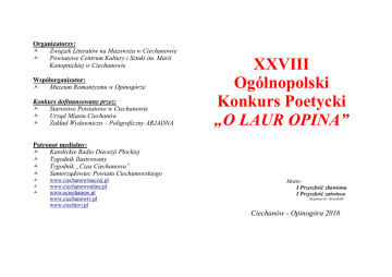 Organizatorzy: Związek Literatów na Mazowszu w Ciechanowie Powiatowe Centrum Kultury i Sztuki im. Marii Konopnickiej w Ciechanowie Współorganizator: Muzeum Romantyzmu w Opinogórze Konkurs dofinansowany przez: Starostwo Powiatowe w Ciechanowie Urząd Miasta Ciechanów Zakład Wydawniczo – Poligraficzny ARJADNA XXVIII Ogólnopolski Konkurs Poetycki „O LAUR OPINA” Patronat medialny: Katolickie Radio Diecezji Płockiej Tygodnik Ilustrowany Tygodnik „Czas Ciechanowa” Samorządowiec Powiatu Ciechanowskiego www.ciechanowinaczej.pl www.ciechanowonline.pl www.eciechanow.pl www.ciechanowtv.pl www.ciechtivi.pl Motto: I Przeszłość zbawiona I Przyszłość zaświeca /Zygmunt hr. Krasiński/ Ciechanów - Opinogóra 2016 Cele Konkursu: - Konfrontacja twórczości poetyckiej Ożywienie życia literackiego Ziemi Ciechanowskiej Propagowanie i promocja współczesnej poezji 10. Zasady uczestnictwa: 1. 2. 3. 4. 5. 6. 7. 8. 9. Tematyka konkursu jest dowolna Konkurs ma charakter otwarty Uczestnicy nadsyłają maksymalnie 5 utworów poetyckich /każdy w 4 egzemplarzach/ wyłącznie w maszynopisie Utwory nadesłane nie mogą być wcześniej publikowane i nagradzane w innych konkursach i są pracą własną autora. Wiersze należy nadesłać na adres: Powiatowe Centrum Kultury i Sztuki im. Marii Konopnickiej ul. Strażacka 5 06-400 Ciechanów Każdy wiersz należy opatrzyć godłem z dopiskiem „O Laur Opina” i do zestawu dołączyć zamkniętą kopertę opatrzoną takim samym godłem zawierającą dane o autorze, adres i telefon kontaktowy Termin nadsyłania prac upływa 2 września 2016 roku / decyduje data stempla pocztowego/ Ogłoszenie wyników i wręczenie nagród nastąpi w Muzeum Romantyzmu w Opinogórze podczas XXI Ciechanowskiej Jesieni Poezji /6 października 2016/. O wręczeniu nagród powiadomione zostaną tylko osoby nagrodzone. Jury, powołane przez organizatorów, decyduje o podziale nagród. Organizatorzy przewidują 3 nagrody główne, 3 wyróżnienia w tematyce dowolnej, nagrody specjalne za utwory związane z tematyką: - Ciechanów lub Ziemia Ciechanowska 11. 12. 13. - Zygmunt Krasiński lub Opinogóra Organizatorzy przewidują wydanie „Jednodniówki poetyckiej” z wierszami nagrodzonymi oraz w przyszłości wydanie tomiku dekadowego z utworami nagrodzonymi w konkursie (w związku z tym zastrzegają sobie prawo druku tych wierszy bez honorariów autorskich). Prace nie spełniające wymogów regulaminu nie będą uwzględniane w konkursie. Organizatorzy nie zwracają nadesłanych prac. Organizatorzy nie wysyłają nagród. Nagrody nieodebrane osobiście przez osoby nagrodzone przechodzą do puli na rok następny. Organizatorzy nie zwracają osobom nagrodzonym kosztów przejazdu. 15. Udział w konkursie jest równoznaczny z wyrażeniem przez osoby uczestniczące zgody na przetwarzanie przez organizatora ich danych osobowych na potrzeby konkursu oraz w celach marketingowych organizatora/ustawa o ochronie danych osobowych z dnia 29.08.1997 r. Dz.U. Nr 133 poz.883 z póz. zm./. Osoby uczestniczące w konkursie potwierdzają swoją zgodę na powyższe w formie przesłania do organizatora oświadczenia zgodnie z zał. do niniejszego regulaminu. Bliższych informacji udzielają pracownicy Działu Kultury i Sztuki PCKiSz. Tel. 23 672 35 09, 23 672 42 92