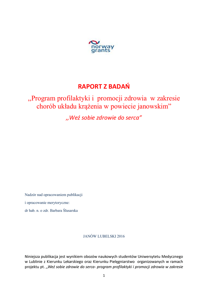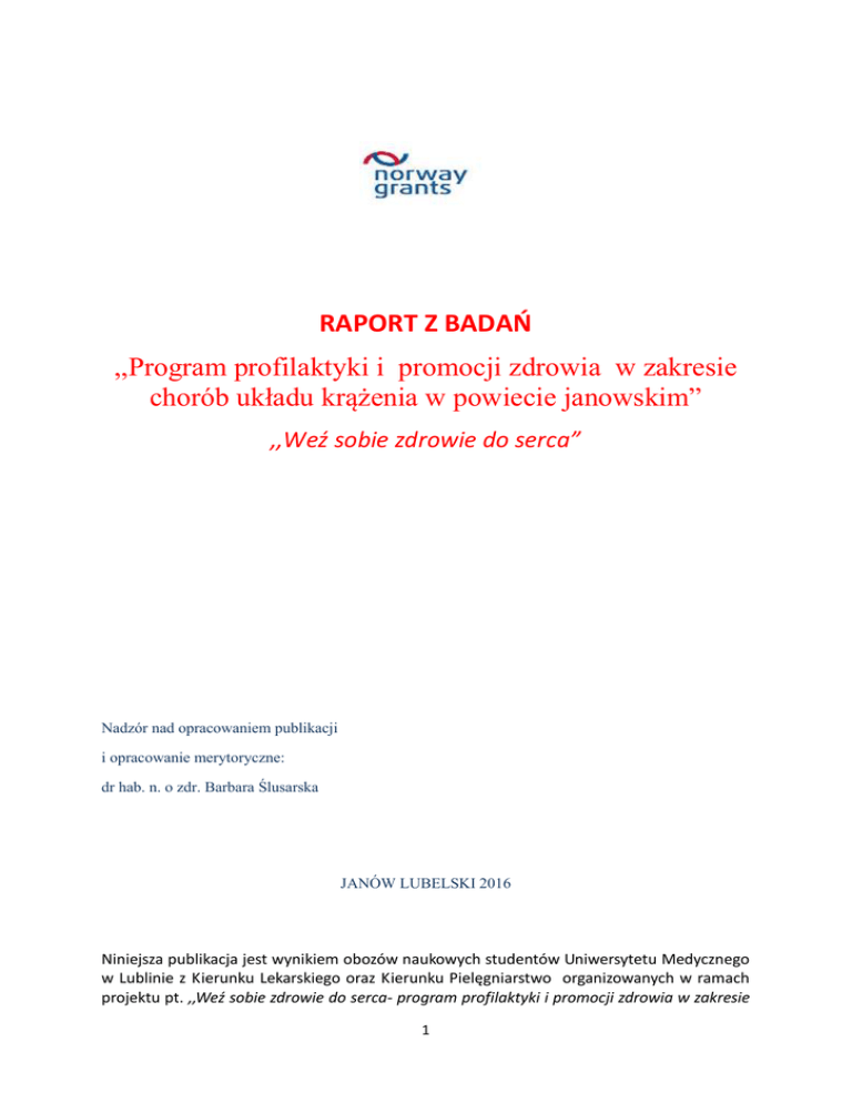 RAPORT Z BADAŃ ,,Program profilaktyki i promocji zdrowia w zakresie chorób układu krążenia w powiecie janowskim” ,,Weź sobie zdrowie do serca” Nadzór nad opracowaniem publikacji i opracowanie merytoryczne: dr hab. n. o zdr. Barbara Ślusarska JANÓW LUBELSKI 2016 Niniejsza publikacja jest wynikiem obozów naukowych studentów Uniwersytetu Medycznego w Lublinie z Kierunku Lekarskiego oraz Kierunku Pielęgniarstwo organizowanych w ramach projektu pt. ,,Weź sobie zdrowie do serca- program profilaktyki i promocji zdrowia w zakresie 1 chorób układu krążenia w powiecie janowskim” finansowanego ze środków Norweskiego Mechanizmu Finansowego 2009-2014 w ramach Programu PL 13 ,,Ograniczanie społecznych nierówności w zdrowiu” oraz budżetu państwa. Opiekę nad studentami sprawowali: Pan Grzegorz Dzida, Pan Michał Trojnar, Pani Katarzyna Kocka oraz Pan Grzegorz Nowicki. Charakterystyka zrealizowanego Programu Cele programu: Celem ogólnym Programu było zmniejszenie zachorowalności na choroby związane ze stylem życia – tj. choroby układu krążenia w powiecie janowskim wśród osób w wieku 35-64 lata. Cel ten jest zgodny z zaplanowanym rezultatem Programu PL 13 i został określony na podstawie dokonanej oceny potrzeb zdrowotnych w powiecie janowskim. Celem szczegółowym, planowanym do osiągnięcia do końca kwietnia 2016 roku było zwiększenie dostępu do badań diagnostycznych w kierunku wykrywalności chorób układu krążenia wśród mieszkańców powiatu janowskiego w wieku 35-64 lata oraz promocja zdrowia wśród mieszkańców powiatu janowskiego poprzez upowszechnienie zachowań prozdrowotnych w powiecie janowskim. Cel ten miał zostać osiągnięty poprzez zwiększenie liczby osób w powiecie janowskim wobec których zastosowano badania profilaktyczne w kierunku chorób układu krążenia4000 oraz poprzez realizację szeregu działań promocyjnych. Przebieg Programu Okres realizacji badań profilaktycznych przesiewowych w ramach programu - 14.06.2015- 20.03.2016 r. Liczba pacjentów zbadanych w Punktach Porad: Mobilnym i Stacjonarnym - 4040 osoby Liczba skierowań wydanych na pogłębione badania diagnostyczne - 3180 Ogólna liczba uczestników w pogłębionych badaniach diagnostycznych- 3050 (liczba osób, u których zostały wykonane pogłębione badania laboratoryjne) 2 Opis działań zrealizowanych w ramach programu Grupę docelową programu stanowiły osoby zamieszkałe na terenie powiatu janowskiego w wieku 35-64 lata. Działania w ramach programu składały się z dwóch komponentów: 1. Realizacja działań profilaktycznych, która następowała w kolejnych etapach: badania przesiewowe w ramach Punktów Porad – Mobilnego i Stacjonarnego poprzez badania ankietowe, realizację pomiarów antropometrycznych oraz badań krwi włośniczkowej (glukoza i cholesterol), badania EKG oraz ocenę stanu zdrowia podczas konsultacji lekarskiej, podczas której lekarz decydował na podstawie kryteriów czynników ryzyka chorób układu krążenia (SCORE) o ewentualnym skierowaniu do etapu pogłębionych badań diagnostycznych. W Mobilnym Punkcie Porad pacjenci mogli również skorzystać z konsultacji dietetyka i instruktora rekreacji ruchowej; pogłębione badania diagnostyczne- konsultacje lekarskie (wstępna i ponowna) oraz specjalistyczne badania diagnostyczne: laboratoryjne (morfologia, kreatynina, lipidogram pełny: cholesterol całkowity, cholesterol HDL, cholesterol LDL, trójglicerydy), EKG spoczynkowe, EKG wysiłkowe, Holter EKG, Holter RR ciśnieniowy, badanie Doppler naczyń, badanie echokardiologiczne; wsparcie dietetyka na indywidualnych konsultacjach dietetycznych i uczestnictwo w zajęciach aktywności ruchowej po skierowaniu przez lekarza w podczas wizyt w ramach pogłębionych badań diagnostycznych; 2. Promocja zdrowia w zakresie chorób układu krążenia -promowanie zdrowego stylu życia podczas pikników zdrowotnych, pogadanek zdrowotnych i przez książkę kucharską pt .,,Powiat Janowski od kuchni-kuchnia od serca i dla serca” z przepisami przekazanymi przez mieszkańców powiatu i zmodyfikowanymi przez dietetyka. Teren badań Badania przeprowadzono w okresie od 14.06.2015 r. do 20.03.2016 r. wśród osób w wieku 35-64 lata zamieszkałych na terenie powiatu janowskiego w 15 miejscowościach w ramach funkcjonowania Mobilnego Punktu Porad , zgodnie z wykazem zaprezentowanym w 3 Tabeli 1 oraz w Stacjonarnym Punkcie Porad, który funkcjonował w Samodzielnym Publicznym Zespole Zakładów Opieki Zdrowotnej w Janowie Lubelskim. Najliczniejsze grupy objęte badaniem rekrutowały się z następujących miejscowości: Janów Lubelski, Potok Wielki, Godziszów, Modliborzyce, Batorz, Zdziłowice. Łącznie spośród 4040 osób objętych badaniem wydano 3180 skierowań na pogłębione badania diagnostyczne. Wyniki szczegółowe prezentuje Tabela 1. Tabela 1. Miejsce i czas realizacji badań oraz ilość pacjentów przebadanych w Punktach Porad: Mobilnym(MPP) i Stacjonarnym(SPP) Lp. Miejscowość Termin realizacji badań Liczba osób poddanych badaniom 1. Janów Lubelski (MPP) 14.06.2015-20.03.2016 1784 2. Janów Lubelski (SPP) 08-12.2015 200 2. Batorz (MPP) 20.06-5.07.2015 139 3. Otrocz (MPP) 05-06.09.2016 25 4. Chrzanów Trzeci(MPP) 11-13.09.2015 134 5. Malinie (MPP) 18-20.09.2015 54 6. Branew Szlachecka (MPP) 26-27.09.2015 57 7. Dzwola (MPP) 02-04.10.2016 75 8. Kocudza Pierwsza (MPP) 09-18.10.2016 122 9. Krzemień Pierwszy (MPP) 23.10.-08.11.2016 71 10. Godziszów (MPP) 14-29.11.2015 297 11. Zdziłowice (MPP) 04-13.12.2015 144 12. Stojeszyn (MPP) 19-20.12.2015 75 13. Wierzchowiska Drugie(MPP) 08-10.01.2016 109 14. Modliborzyce(MPP) 15-31.01.2016 272 15. Potok Wielki(MPP) 06.02-06.03.2016 482 OGÓŁEM 4040 Ogólna liczba zbadanych osób 4 Na terenie powiatu janowskiego mieszka 47 500 osób. W wyodrębnionej grupie wiekowej 35 - 64 lata (tj. szczególnego ryzyka zachorowań na choroby układu krążenia) znajduje się zgodnie z danymi GUS, BDL za