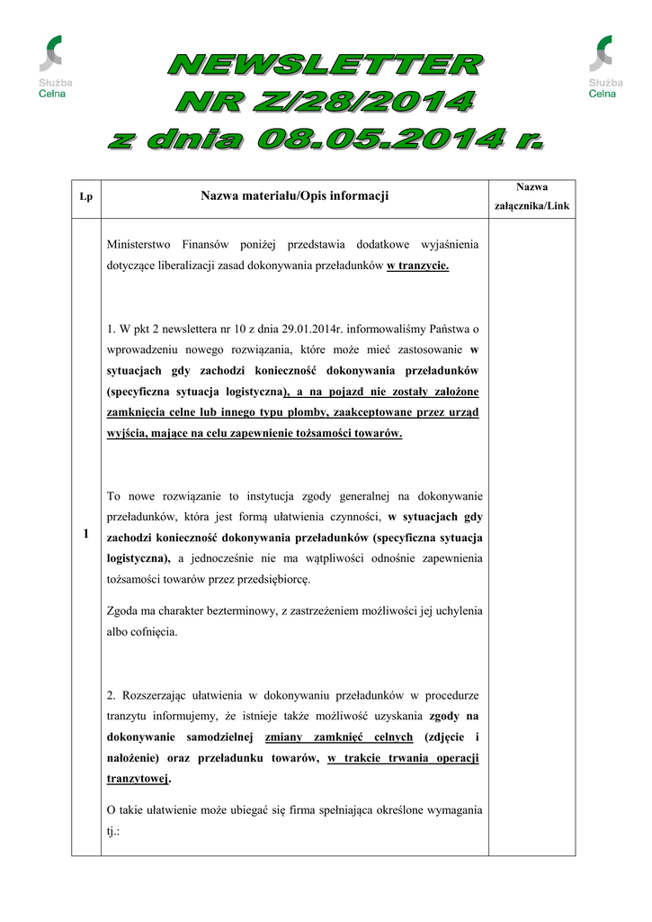 Nazwa materiału/Opis informacji Lp Ministerstwo Finansów poniżej przedstawia dodatkowe wyjaśnienia dotyczące liberalizacji zasad dokonywania przeładunków w tranzycie. 1. W pkt 2 newslettera nr 10 z dnia 29.01.2014r. informowaliśmy Państwa o wprowadzeniu nowego rozwiązania, które może mieć zastosowanie w sytuacjach gdy zachodzi konieczność dokonywania przeładunków (specyficzna sytuacja logistyczna), a na pojazd nie zostały założone zamknięcia celne lub innego typu plomby, zaakceptowane przez urząd wyjścia, mające na celu zapewnienie tożsamości towarów. To nowe rozwiązanie to instytucja zgody generalnej na dokonywanie przeładunków, która jest formą ułatwienia czynności, w sytuacjach gdy 1 zachodzi konieczność dokonywania przeładunków (specyficzna sytuacja logistyczna), a jednocześnie nie ma wątpliwości odnośnie zapewnienia tożsamości towarów przez przedsiębiorcę. Zgoda ma charakter bezterminowy, z zastrzeżeniem możliwości jej uchylenia albo cofnięcia. 2. Rozszerzając ułatwienia w dokonywaniu przeładunków w procedurze tranzytu informujemy, że istnieje także możliwość uzyskania zgody na dokonywanie samodzielnej zmiany zamknięć celnych (zdjęcie i nałożenie) oraz przeładunku towarów, w trakcie trwania operacji tranzytowej. O takie ułatwienie może ubiegać się firma spełniająca określone wymagania tj.: Nazwa załącznika/Link - musi posiadać status AEO, - musi posiadać pozwolenia na uproszczenia - upoważniony nadawca i upoważniony odbiorca w tranzycie wspólnotowym/wspólnym, - musi realizować przewozy przesyłek dedykowanych do wielu różnych klientów – odbiorców, dokonując konsolidacji przesyłek. Jeżeli miejscem dokonywania przeładunków (konsolidacji) ma być miejsce uznane w ramach uproszczeń tranzytowych, to zarówno w przypadku zgody na zmianę zamknięć celnych (zdjęcie i nałożenie) i przeładunku towarów, jak i zgody dotyczącej przeładunków przesyłek bez zamknięć celnych, możliwość ta wiąże się z uzyskaniem stosownej wcześniejszej zgody organu celnego, wyrażonej w pozwoleniach na otwieranie oraz zamykanie procedur tranzytu wspólnotowego/wspólnego dotyczących przedmiotowego miejsca uznanego. Nie ma także żadnych przeciwwskazań, aby wydawana w ramach pozwoleń na uproszczenia zgoda obejmowała swym zakresem, na wniosek strony, także sytuacje gdy przy objęciu towaru procedurą tranzytu na towar/pojazd nie zostały nałożone zamknięcia celne, natomiast są one nakładane dopiero przez dokonującego konsolidacji w miejscu uznanym. Przedsiębiorca, który spełnia kryteria podmiotowe i dokonuje konsolidacji przesyłek w ramach procedury tranzytu, może ubiegać się o przyznanie mu przez organ celny – w celu przeładunku i konsolidacji przesyłek – stosownego upoważnienia, wnioskując o wydanie nowych albo zmianę dotychczasowych pozwoleń na uproszczenia. Dodać należy, że analogiczne rozwiązanie zostało przyjęte dla zmiany zamknięć w trakcie procedury wywozu (pkt 1 newslettera nr 10 z dnia 29.01.2014r.). Powyższe ułatwienie (inaczej niż w wywozie) dotyczy nie tylko operacji otwartych w kraju, lecz także operacji tranzytowych otwartych przez zagraniczne urzędy wyjścia/upoważnionych nadawców. Towar objęty procedurą tranzytu z założonymi zamknięciami celnymi (na towar lub środek transportu) dostarczany jest do miejsca realizacji uproszczenia, gdzie w ramach procesu konsolidacji przeładowywany jest na inny środek transportu, ewentualnie środek transportu pozostaje ten sam, tylko następuje doładunek towarów objętych innym zgłoszeniem tranzytowym i zmiana zamknięć celnych. Należy podkreślić, iż podobnie jak w wywozie, nie musi zachodzić tożsamość pomiędzy osobą nadawcy/głównego zobowiązanego a podmiotem dokonującym przeładunku i konsolidacji. Reasumując: 1. Znajdująca się w specyficznej sytuacji logistycznej firma posiadająca pozwolenia na uproszczenia przy obejmowaniu towarów procedurą tranzytu i zamykaniu procedury tranzytu w systemie NCTS, oraz status AEO, może realizować oba wyżej opisane ułatwienia. Organem właściwym do rozpatrzenia wniosku jest Dyrektor Izby Celnej, który wydał pozwolenia na przedmiotowe uproszczenia dotyczące danego miejsca uznanego. 2. Znajdująca się w specyficznej sytuacji logistycznej firma posiadająca pozwolenia na uproszczenia przy obejmowaniu towarów procedurą tranzytu i zamykaniu procedury tranzytu w systemie NCTS, ale nie posiadająca statusu AEO, może ubiegać się w ramach ww. pozwoleń o wyrażenie zgody na dokonywanie w miejscu uznanym przeładunków przesyłek bez zamknięć celnych. Organem właściwym do rozpatrzenia wniosku jest Dyrektor Izby Celnej, który wydał pozwolenia na przedmiotowe uproszczenia dotyczące danego miejsca uznanego. 3. Natomiast znajdująca się w specyficznej sytuacji logistycznej firma nieposiadająca ww. pozwoleń na uproszczenia w tranzycie w miejscu uznanym, może wystąpić z wnioskiem o wydanie w formie decyzji administracyjnej wyprzedzającej, generalnej zgody na dokonywanie przeładunków w odniesieniu do przesyłek bez zamknięć celnych. Organem właściwym do rozpatrzenia wniosku jest naczelnik urzędu celnego właściwy dla miejsca przeładunku. Odnosząc się do obydwu instytucji opisanych powyżej w pkt 1 i 2, Ministerstwo Finansów zastrzega ponadto, że: - Zgoda na przeładunki dotyczy wyłącznie przewozów w ramach tranzytu wspólnotowego/wspólnego, realizowanych w systemie NCTS, w transporcie drogowym. Przeładunek związany ze zmianą rodzaju transportu (kolej drogowy) wiązałby się z koniecznością złożenia nowego zgłoszenia tranzytowego. - Z możliwości stosowania wyżej opisanych ułatwień wyłączony jest tranzyt towarów podlegających kontroli weterynaryjnej z założoną plombą weterynaryjną oraz towarów podlegających kontroli fitosanitarnej z założoną plombą fitosanitarną. - Fakt dokonania przeładunku 