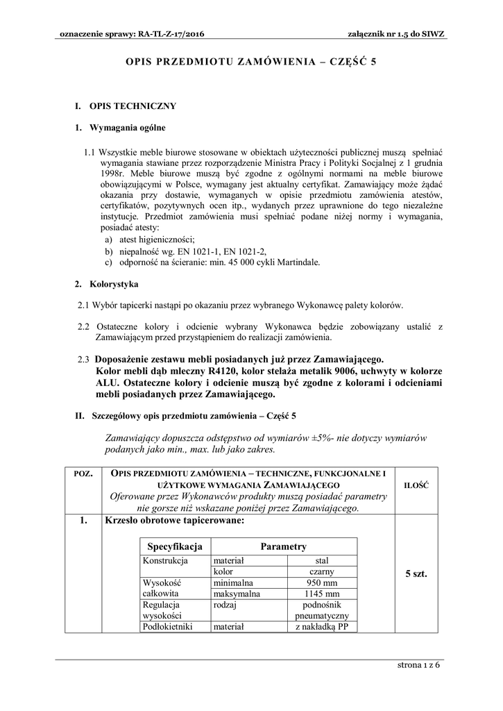 oznaczenie sprawy: RA-TL-Z-17/2016 załącznik nr 1.5 do SIWZ OPIS PRZEDMIO TU ZAMÓWIENIA – CZĘŚ Ć 5 I. OPIS TECHNICZNY 1. Wymagania ogólne 1.1 Wszystkie meble biurowe stosowane w obiektach użyteczności publicznej muszą spełniać wymagania stawiane przez rozporządzenie Ministra Pracy i Polityki Socjalnej z 1 grudnia 1998r. Meble biurowe muszą być zgodne z ogólnymi normami na meble biurowe obowiązującymi w Polsce, wymagany jest aktualny certyfikat. Zamawiający może żądać okazania przy dostawie, wymaganych w opisie przedmiotu zamówienia atestów, certyfikatów, pozytywnych ocen itp., wydanych przez uprawnione do tego niezależne instytucje. Przedmiot zamówienia musi spełniać podane niżej normy i wymagania, posiadać atesty: a) atest higieniczności; b) niepalność wg. EN 1021-1, EN 1021-2, c) odporność na ścieranie: min. 45 000 cykli Martindale. 2. Kolorystyka 2.1 Wybór tapicerki nastąpi po okazaniu przez wybranego Wykonawcę palety kolorów. 2.2 Ostateczne kolory i odcienie wybrany Wykonawca będzie zobowiązany ustalić z Zamawiającym przed przystąpieniem do realizacji zamówienia. 2.3 Doposażenie zestawu mebli posiadanych już przez Zamawiającego. Kolor mebli dąb mleczny R4120, kolor stelaża metalik 9006, uchwyty w kolorze ALU. Ostateczne kolory i odcienie muszą być zgodne z kolorami i odcieniami mebli posiadanych przez Zamawiającego. II. Szczegółowy opis przedmiotu zamówienia – Część 5 Zamawiający dopuszcza odstępstwo od wymiarów ±5%- nie dotyczy wymiarów podanych jako min., max. lub jako zakres. POZ. 1. OPIS PRZEDMIOTU ZAMÓWIENIA – TECHNICZNE, FUNKCJONALNE I UŻYTKOWE WYMAGANIA ZAMAWIAJĄCEGO Oferowane przez Wykonawców produkty muszą posiadać parametry nie gorsze niż wskazane poniżej przez Zamawiającego. Krzesło obrotowe tapicerowane: Specyfikacja Konstrukcja Wysokość całkowita Regulacja wysokości Podłokietniki ILOŚĆ Parametry materiał kolor minimalna maksymalna rodzaj materiał stal czarny 950 mm 1145 mm podnośnik pneumatyczny z nakładką PP 5 szt. strona 1 z 6 oznaczenie sprawy: RA-TL-Z-17/2016 załącznik nr 1.5 do SIWZ OPIS PRZEDMIO TU ZAMÓWIENIA – CZĘŚ Ć 5 regulacja Podstawa Oparcie kolor 5-ramienna kółka wykończenie kolor regulacja Siedzisko podparcie lędźwiowe wysokość regulowana tkanina kolor regulacja szerokość góra-dół i na boki czarny czarny gumowane tworzywo z tapicerką czarny wysokości i kąta odchylenia 425 – 555 mm materiałowa Szary/grafit siły sprężystości 460 mm Zdjęcie poglądowe: 2. Biurko wykładowcy: 1) wymiary biurka1600 x700x750 mm; 2) biurko z szafką oraz kontenera 4- szufladowego z centralnym zamkiem; 3) krawędzie boczne zabezpieczone obrzeżem PCV w kolorze biurka – blaty 2 mm, pozostałe 1 mm; 4) grubość blatu 2,8mm, grubość pozostałych płyt 1,8 mm; 5) kolorystyka: dąb mleczny. 2 szt. Zdjęcie poglądowe: strona 2 z 6 oznaczenie sprawy: RA-TL-Z-17/2016 załącznik nr 1.5 do SIWZ OPIS PRZEDMIO TU ZAMÓWIENIA – CZĘŚ Ć 5 3. Stół konferencyjny 4-6 osobowy: Specyfikacja Wymiary całkowite Stelaż (ramiak z nogami) Blat Parametry wysokość 780 mm długość 1600 mm szerokość 1000 mm materiał Metal, kolor srebrny lub szary ramiak przekrój 50 mm x 30 mm nogi Ø 60 mm ze stopkami regulowanymi materiał płyta MDF laminowana 28 mm kolor dąb mleczny krawędzie PCV 2 mm 3 szt. Zdjęcie poglądowe: strona 3 z 6 oznaczenie sprawy: RA-TL-Z-17/2016 załącznik nr 1.5 do SIWZ OPIS PRZEDMIO TU ZAMÓWIENIA – CZĘŚ Ć 5 4. Stół konferencyjny 8 osobowy: Specyfikacja Parametry Wymiary wysokość 780 mm całkowite długość 2000 mm szerokość 1000 mm Stelaż (ramiak z materiał Metal, kolor nogami) srebrny lub szary ramiak przekrój 50 mm x 30 mm nogi Ø 60 mm ze stopkami regulowanymi Blat materiał płyta MDF laminowana 28 mm kolor dąb mleczny krawędzie PCV 2 mm 1 szt. Zdjęcie poglądowe: 5. Krzesło konferencyjne: 1) na czteroramiennej metalowej podstawie, w kolorze czarnym, malowanej proszkowo; 2) siedzisko tapicerowane tkaniną w kolorze grafitowym/szarym o parametrach nie gorszych niż: a) ścieralność: 45 000 cykli Martindale wg EN ISO 12947-2:2007; b) trudnopalność na papierosa i zapałkę (BS EN1021-1; BS EN 10212); c) odporność na pilling 4-5; d) gramatura 350 g/mb 16 szt. Zdjęcie poglądowe: strona 4 z 6 oznaczenie sprawy: RA-TL-Z-17/2016 załącznik nr 1.5 do SIWZ OPIS PRZEDMIO TU ZAMÓWIENIA – CZĘŚ Ć 5 6. Regał biurowy otwarty: 1) wymiary: a) szerokość: 800 mm, b) głębokość: 400 mm, c) wysokość: 1850 mm; 2) całość krawędzi zabezpieczona obrzeżem PCV 2 mm; 3) plecy tylne w jednym elemencie w kolorze dąb mleczny; 4) regał posiada stopki regulowane do „poziomowania”. 7. 1 szt. Szafa aktowa zamknięta, 2-drzwiowa z zamkiem patentowym Specyfikacja Wymiary całkowite Półki Cokół dolny Obrzeże Kolorystyka Parametry wysokość 1850 mm szerokość 800 mm głębokość 400 mm ilość 4 regulowane tak wysokość 80 mm PCV 2 mm dąb mleczny 2 szt. Zdjęcie poglądowe: 8. Regał gabinetowy niski z drzwiami szklanymi: 1) regał gabinetowy trzysegregatorowy o poniższych wymiarach; 2) regał stojący zamykany po dwóch stronach drzwiczkami wykonanymi ze szkła frontami skrzydłowymi; 1 szt. strona 5 z 6 oznaczenie sprawy: RA-TL-Z-17/2016 załącznik nr 1.5 do SIWZ OPIS PRZEDMIO TU ZAMÓWIENIA – CZĘŚ Ć 5 3) drzwi wykonane ze szkła satynowego w ramce drewnianej o grubości 50-150 mm, bez zamka, z uchwytami. Specyfikacja Wymiary całkowite Półki Cokół dolny Obrzeże Kolorystyka 9. Parametry wysokość 1200 mm szerokość 1400 mm głębokość 400 mm ilość 3 regulowane tak wysokość 80 mm PCV 2 mm Dąb mleczny Kontener gabinetowy: 1) wykończony obrzeżem PCV lub ABS gr min. 2 mm w kolorze płyty, nachodzący na szuflady, licowany z frontem szuflad, wieniec dolny zasłonięty frontem szuflady; 2) kontener wyposażony w 5 szuflad; 3) kontener powinien mieć możliwość wysunięcia tylko jednej szuflady. 