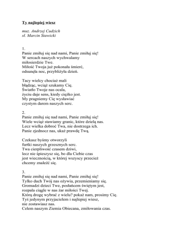 Ty najlepiej wiesz muz. Andrzej Cudzich sł. Marcin Stawicki 1. Panie zmiłuj się nad nami, Panie zmiłuj się! W sercach naszych wychwalamy miłosierdzie Twe. Miłość Twoja już pokonała śmierć, odsunęła noc, przybliżyła dzień. Tacy wielcy chociaż mali błądząc, wciąż szukamy Cię. Światło Twoje nas ocala, życiu daje sens, kiedy ciężko jest. My pragniemy Cię wysławiać czystym darem naszych serc. 2. Panie zmiłuj się nad nami, Panie zmiłuj się! Wiele wciąż stawiamy granic, które dzielą nas. Lecz wielka dobroć Twa, nie dostrzega ich. Panie zjednocz nas, ukaż prawdę Twą. Czekasz byśmy otworzyli furtki naszych grzesznych serc. Twa cierpliwość czasem dziwi, lecz nie śpieszysz się, bo dla Ciebie czas jest wiecznością, w której wszyscy przecież chcemy znaleźć się. 3. Panie zmiłuj się nad nami, Panie zmiłuj się! Tylko duch Twój nas ożywia, przemieniamy się. Gromadzi dzieci Twe, posłańcem świętym jest, rozpala ciągle w nas żar miłości Twej. Którą drogę wybrać z wielu? pokaż nam, prosimy Cię. Tyś jedynym przyjacielem i najlepiej wiesz, nie zostawiasz nas. Celem naszym Ziemia Obiecana, zmiłowania czas.