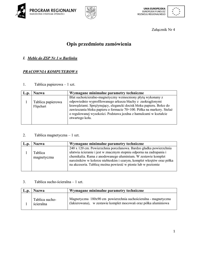 ` Załącznik Nr 4 Opis przedmiotu zamówienia I. Meble do ZSP Nr 1 w Barlinku PRACOWNIA KOMPUTEROWA 1. Tablica papierowa – 1 szt. L.p. Nazwa 1 Tablica papierowa Flipchart 2. 3. Tablica magnetyczna Wymagane minimalne parametry techniczne 240 x 120 cm. Powierzchnia porcelanowa. Bardzo gładka powierzchnia ułatwia ścieranie i jest w znacznym stopniu odporna na zadrapania i chemikalia. Rama z anodowanego aluminium. W zestawie komplet narożników w kolorze niebieskim i szarym, komplet wkrętów oraz półka na akcesoria. Tablicę można powiesić w pionie lub w poziomie Tablica sucho-ścieralna – 1 szt. L.p. Nazwa 1 Blat suchościeralno-magnetyczny wzmocniony płytą wykonany z odpowiednio wyprofilowanego arkusza blachy z zaokrąglonymi krawędziami. Sprężynujący, elegancki docisk bloku papieru. Bolce do zawieszania bloku papieru o formacie 70×100. Półka na markery. Stelaż o regulowanej wysokości. Podstawa jezdna z hamulcami w kształcie otwartego koła. Tablica magnetyczna – 1 szt. L.p. Nazwa 1 Wymagane minimalne parametry techniczne Tablica suchościeralna Wymagane minimalne parametry techniczne Magnetyczna 180x90 cm powierzchnia suchościeralna - magnetyczna (lakierowana), w zestawie komplet mocowań oraz półka aluminiowa 1 ` Literatura – 1 kpl. 4. Literatura - Pozycja 1 - Pracownia komputerowa Linux. Księga eksperta Access 2007 PL. Biblia Zestaw Szkoleniowy MCITP (Egzaminy 70640, 70-642, 70-646): Administrowanie Windows Server 2008 Język C++. Szkoła programowania. Wydanie V PHP i MySQL. Tworzenie stron WWW. Vademecum profesjonalisty. Wydanie czwarte Autor Tim Parker Zespół Autorów Rok wydania 1999 2007 Wydawnictwo Helion Helion Ilość 1 1 Dan Holme, Daniele Ruest, Nelson Ruest 2008 Microsoft Press 1 Stephen Prata 2006 Helion 1 Luke Welling, Lura Thomson 2009 Helion 1 PRACOWNIA OBRÓBKI PLASTYCZNEJ 1. Literatura – 1 kpl. Kowalstwo i metaloplastyka. Podróż przez epoki i style. Kowalstwo. Techniki warsztatowe krok po kroku. Metaloplastyka - techniki formowania, kucia i spajania 2. Rok wydania Wydawnictwo Ilość 2010 Arkady 2 Ares Jose Antonio 2008 Arkady 3 Ares Jose Antonio 2006 Arkady 3 Tablica – 1 szt. L.p. Nazwa 1 Autor Lagnasco C. A. Reynerdi Tablica Wymagane minimalne parametry techniczne Tablica szkolna100x170 cm magnetyczna,- powierzchni zielonej, magnetycznej, do kredy miękkiej,- powierzchnia tablicy wykonana z blachy lakierowanej,- dodatkowo utwardzana,- rama wykonana z profilu aluminiowego,- tył tablicy wzmocniony grubą płytą,komplet powinien zawierać półkę, elementy montażowe, instrukcję oraz gwarancję 2 ` PRACOWNIA OBRÓBKI MECHANICZNEJ 1. Literatura – 1 kpl. Podstawy obróbki CNC Programowanie obrabiarek NC/CNC Elastyczna automatyzacja wytwarzania. Obrabiarki i systemy obróbkowe Obsługa i programowanie obrabiarek CNC Podręcznik operatora Autor praca zbiorowa Wit Grzesik, Piotr Niesłony, Marian Bartoszuk Rok wydania 2008 Wydawnictwo Rea Ilość 3 2008 WNT 2 Jerzy Honczarenko 2000 WNT 3 W.Habrat 2007 KaBe 3 2. Tablica – 1 szt. L.p. Nazwa 1 Tablica Wymagane minimalne parametry techniczne Tablica szkolna100x170 cm magnetyczna,- powierzchni zielonej, magnetycznej, do kredy miękkiej,- powierzchnia tablicy wykonana z blachy lakierowanej,- dodatkowo utwardzana,- rama wykonana z profilu aluminiowego,- tył tablicy wzmocniony grubą płytą,- komplet powinien zawierać półkę, elementy montażowe, instrukcję oraz gwarancję PRACOWNIA NAPRAW POJAZDÓW SAMOCHODOWYCH 1. Tablica papierowa – 1 szt. L.p. Nazwa 1 Tablica papierowa Wymagane minimalne parametry techniczne Tablica Papierowa Flipchart. Blat wzmocniony płytą wykonany z odpowiednio wyprofilowanego arkusza blachy z zaokrąglonymi krawędziami. Sprężynujący, elegancki docisk bloku papieru. Bolce do zawieszania bloku papieru o formacie 70×100. Półka na markery. Stelaż o regulowanej wysokości. Podstawa jezdna z hamulcami w kształcie otwartego koła 3 ` 2. Tablica magnetyczna– 1 szt. L.p. Nazwa 1 Tablica magnetyczna 3. 240 x 120 cm uchwyty do zawieszenia na ścianie rama wykonana z aluminium, tył tablicy z płyty metalowej półka na markery ruchoma, z możliwością demontażu przystosowana do pisania tylko markerami suchościeralnymi oraz mocowania kartek z informacjami za pomocą magnesów Powierzchnia porcelanowa z gwarancją 25-letnią. Bardzo gładka powierzchnia ułatwia ścieranie i jest w znacznym stopniu odporna na zadrapania i chemikalia. Rama z anodowanego aluminium. W zestawie komplet narożników Tablicę można powiesić w pionie lub w poziomie Tablica sucho ścieralna – 1 szt. L.p. Nazwa 1 Wymagane minimalne parametry techniczne Tablica sucho ścieralna Wymagane minimalne parametry techniczne 80x90 cm powierzchnia suchościeralna - magnetyczna (lakierowana), w zestawie komplet mocowań oraz półka aluminiowa PRACOWNIA TECHNOLOGII MECHANICZNEJ 1. Literatura – 1 kpl. Autor Pomiary długości i kąta w budowie maszyn Obsługa i programowanie obrabiarek CNC. Podręcznik operatora +CD Technologia Ogolna. Podstawy technologii mechanicznych. Podstawy automatyki i robotyki Części maszyn Obrabiarki sterowane numerycznie Podstawy projektowania procesów technologicznych typowych części maszyn Narzędzia skrawające Rok wydania Wydawnictwo Ilość Jan Malinowski 1998 WSiP 10 Witold Habrat 2007 KaBe 4 Aleksander Górecki Klimasara Wojciech, Pilat Zbigniew Andrzej Rutkowski Jerzy Honczarenko 2010 WSiP 10 2006 2011 2009 WSiP WSiP WNT 2 4 4 Mieczysław Feld Piotr Cichosz 2009 2006 WNT WNT 8 4 4 ` Podstawy technologii maszyn Ćwiczenia konstrukcyjne Rysunek techniczny maszynowy Naprawa i obsługa pojazdów samochodowych Elektrotechnika i elektronika pojzadów Obróbka metali z materiałoznawstwem Józef Zawora Kazimierz Okraszewski Tadeusz Dobrzański 2011 1999 2004 WSiP WSiP WNT 4 4 14 Seweryn Orzełowski Jerzy Ocioszyński Stanisław Mac 2011 2007 1999 WSiP WSiP WSiP 14 5 3 Zero 1 2. Filmy dydaktyczne Film DVD do systemu Zero-OSN (1 komplet zawiera 4 pł