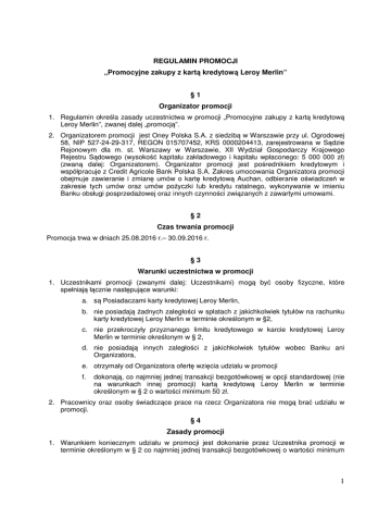 REGULAMIN PROMOCJI „Promocyjne zakupy z kartą kredytową Leroy Merlin” §1 Organizator promocji 1. Regulamin określa zasady uczestnictwa w promocji „Promocyjne zakupy z kartą kredytową Leroy Merlin”, zwanej dalej „promocją”. 2. Organizatorem promocji jest Oney Polska S.A. z siedzibą w Warszawie przy ul. Ogrodowej 58, NIP 527-24-29-317, REGON 015707452, KRS 0000204413, zarejestrowana w Sądzie Rejonowym dla m. st. Warszawy w Warszawie, XII Wydział Gospodarczy Krajowego Rejestru Sądowego (wysokość kapitału zakładowego i kapitału wpłaconego: 5 000 000 zł) (zwaną dalej: Organizatorem). Organizator promocji jest pośrednikiem kredytowym i współpracuje z Credit Agricole Bank Polska S.A. Zakres umocowania Organizatora promocji obejmuje zawieranie i zmianę umów o kartę kredytową Auchan, odbieranie oświadczeń w zakresie tych umów oraz umów pożyczki lub kredytu ratalnego, wykonywanie w imieniu Banku obsługi posprzedażowej oraz innych czynności związanych z zawartymi umowami. §2 Czas trwania promocji Promocja trwa w dniach 25.08.2016 r.– 30.09.2016 r. §3 Warunki uczestnictwa w promocji 1. Uczestnikami promocji (zwanymi dalej: Uczestnikami) mogą być osoby fizyczne, które spełniają łącznie następujące warunki: a. są Posiadaczami karty kredytowej Leroy Merlin, b. nie posiadają żadnych zaległości w spłatach z jakichkolwiek tytułów na rachunku karty kredytowej Leroy Merlin w terminie określonym w §2, c. nie przekroczyły przyznanego limitu kredytowego w karcie kredytowej Leroy Merlin w terminie określonym w § 2, d. nie posiadają innych zaległości z jakichkolwiek tytułów wobec Banku ani Organizatora, e. otrzymały od Organizatora ofertę wzięcia udziału w promocji f. dokonają, co najmniej jednej transakcji bezgotówkowej w opcji standardowej (nie na warunkach innej promocji) kartą kredytową Leroy Merlin w terminie określonym w § 2 o wartości minimum 50 zł. 2. Pracownicy oraz osoby świadczące prace na rzecz Organizatora nie mogą brać udziału w promocji. §4 Zasady promocji 1. Warunkiem koniecznym udziału w promocji jest dokonanie przez Uczestnika promocji w terminie określonym w § 2 co najmniej jednej transakcji bezgotówkowej o wartości minimum 1 50 zł w opcji standardowej (nie na warunkach innej promocji Organizatora) kartą kredytową Leroy Merlin. 2. Każdy Uczestnik, który spełni warunki określone w niniejszym Regulaminie otrzyma od Organizatora zwrot 10% sumy transakcji bezgotówkowych dokonanych kartą kredytową Leroy Merlin w terminie określonym w § 2, ale nie więcej niż 30 zł. 3. Kwota, o której mowa powyżej, zostanie wyksięgowana z rachunku karty kredytowej Leroy Merlin jako pomniejszenie kwoty zadłużenia wynikającego z sumy transakcji bezgotówkowych dokonanych kartą kredytową Leroy Merlin w czasie trwania promocji. 4. O wyksięgowaniu 10% kwoty kapitału transakcji, o których mowa w punkcie 2 niniejszego paragrafu z rachunku limitu karty kredytowej Leroy Merlin Uczestnik zostanie poinformowany najpóźniej na wyciągu z karty kredytowej Leroy Merlin generowanym dnia 17.10.2016 r. 5. Promocja nie łączy sie z innymi promocjami Organizatora. 6. Promocja dotyczy jedynie transakcji o wartości minimum 50 zł. §5 Tryb składania i rozpatrywania reklamacji 1. Każdemu Uczestnikowi przysługuje prawo do wniesienia reklamacji w zakresie niezgodności przeprowadzenia promocji z niniejszym Regulaminem. 2. Reklamacja powinna zostać złożona w jeden z następujących sposobów 2.1 ustnie: a. osobiście w dowolnej placówce Banku lub dowolnym Punkcie Kredytowym lub b. złożona za pośrednictwem Serwisu Telefonicznego Oney 2.2 w formie pisemnej: a. wysłana pocztą na adres Banku do doręczeń i korespondencji, to jest: Oney Polska S.A., ul. Ogrodowa 58, 00-876 Warszawa, z dopiskiem „Promocyjne zakupy z kartą kredytową Leroy Merlin” lub b. złożona osobiście w dowolnej placówce Banku lub dowolnym Punkcie Kredytowym 2.3 w formie elektronicznej: a. złożona poprzez formularz kontaktowy znajdujący się na stronie internetowej www.oney.com.pl 3 Złożona reklamacja, wraz z opisem przyczyn reklamacji, powinna być opatrzona czytelnym podpisem Uczestnika (w przypadku formy pisemnej) i zawierać dane umożliwiające jednoznaczną identyfikację Uczestnika. W treści reklamacji należy podać imię i nazwisko oraz adres do korespondencji. 4 Do reklamacji wymagających złożenia dokumentów, (lub jeśli taki wymóg wynika z powszechnie obowiązujących przepisów prawa) należy dołączyć kopie ewentualnych dokumentów potwierdzających zasadność złożonej reklamacji. 5 Reklamacje będą rozpatrywane niezwłocznie, nie później niż w terminie do 30 dni kalendarzowych (liczonych od daty otrzymania reklamacji) przy uwzględnieniu zasad określonych w niniejszym Regulaminie oraz obowiązujących przepisów prawa. Organizator udziela odpowiedzi w formie pisemnej - listownie na wskazany w reklamacji adres korespondencyjny. 2 6 W przypadku uzasadnionej niemożności udzielenia odpowiedzi w terminie wskazanym w ust. 5 Organizator: a. wyjaśnia przyczyny opóźnienia, b. wskazuje okoliczności, które muszą zostać ustalone, c. wskazuje przewidywany termin udzielenia odpowiedzi, który nie może przekroczyć 60 dni od dnia otrzymania reklamacji. §6 Postanowienia końcowe 1. Dane osobowe Uczestników będą przetwarzane zgodnie z Umową o kartę kredytową Leroy Merlin. 2. Udział Uczestnika w promocji oznacza jego akceptację zasad promocji zawartych w niniejszym Regulaminie. Regulamin promocji jest dostępny na stronie www.oney.com.pl 3. W sprawach nieuregulowanych w niniejszym Regulaminie mają zastosowanie przepisy powszechnie obowiązującego prawa. 3